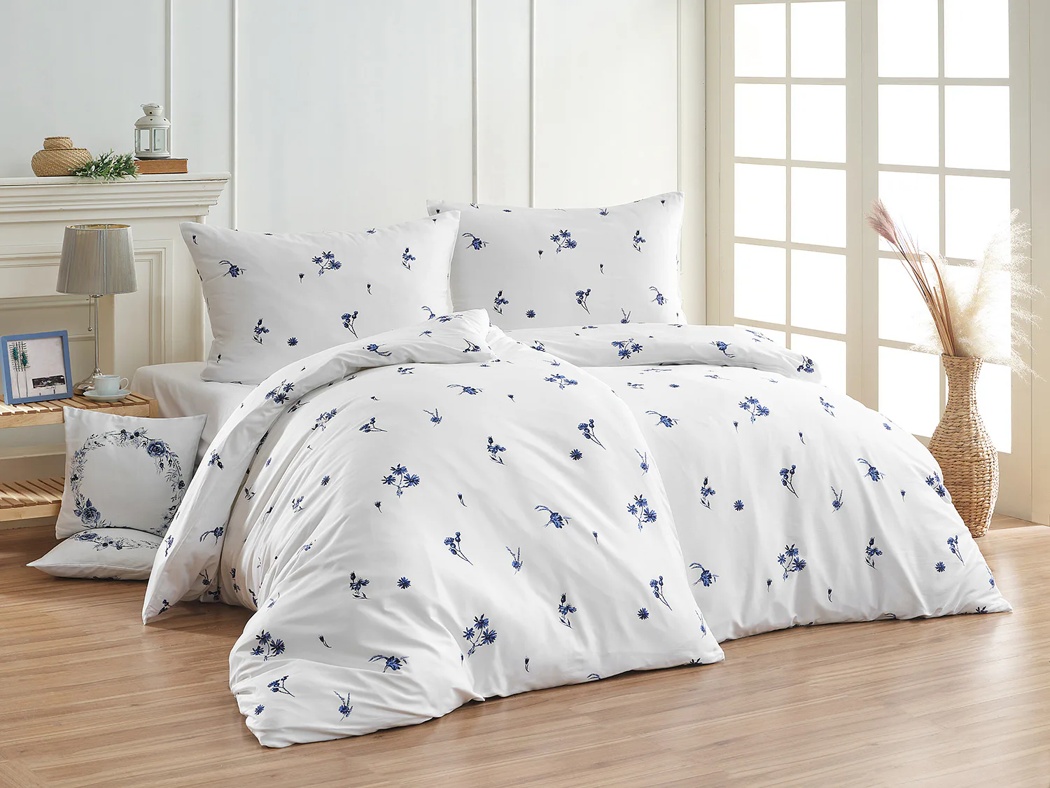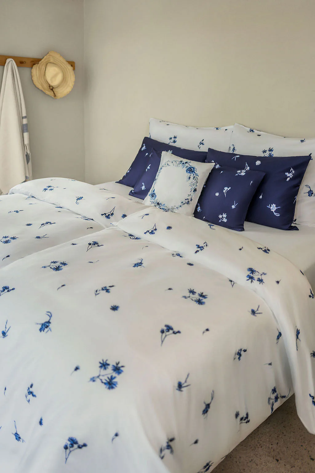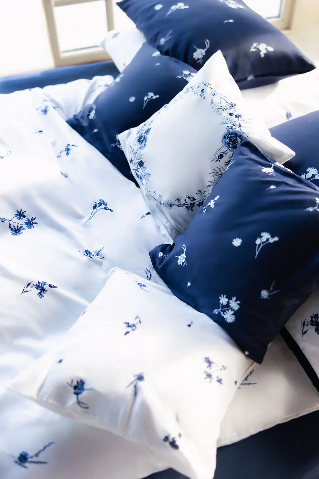 Perte naruby do 60 °C (bílé a modré povlaky zvlášť), sušte při nižší teplotě, žehlete po rubu.