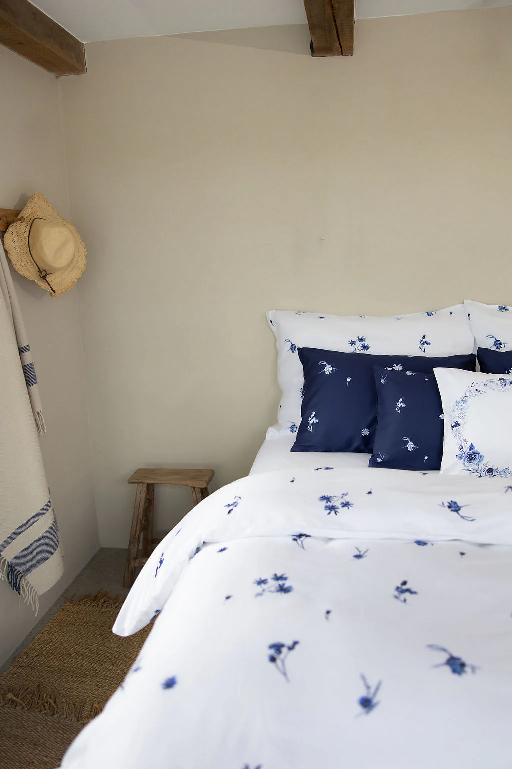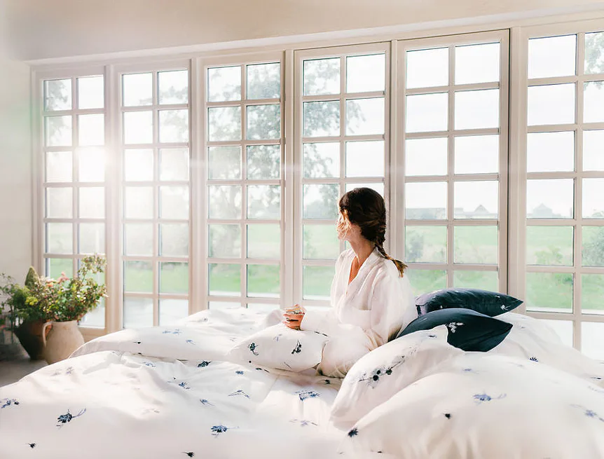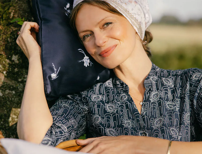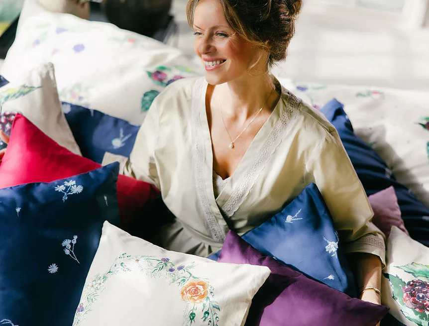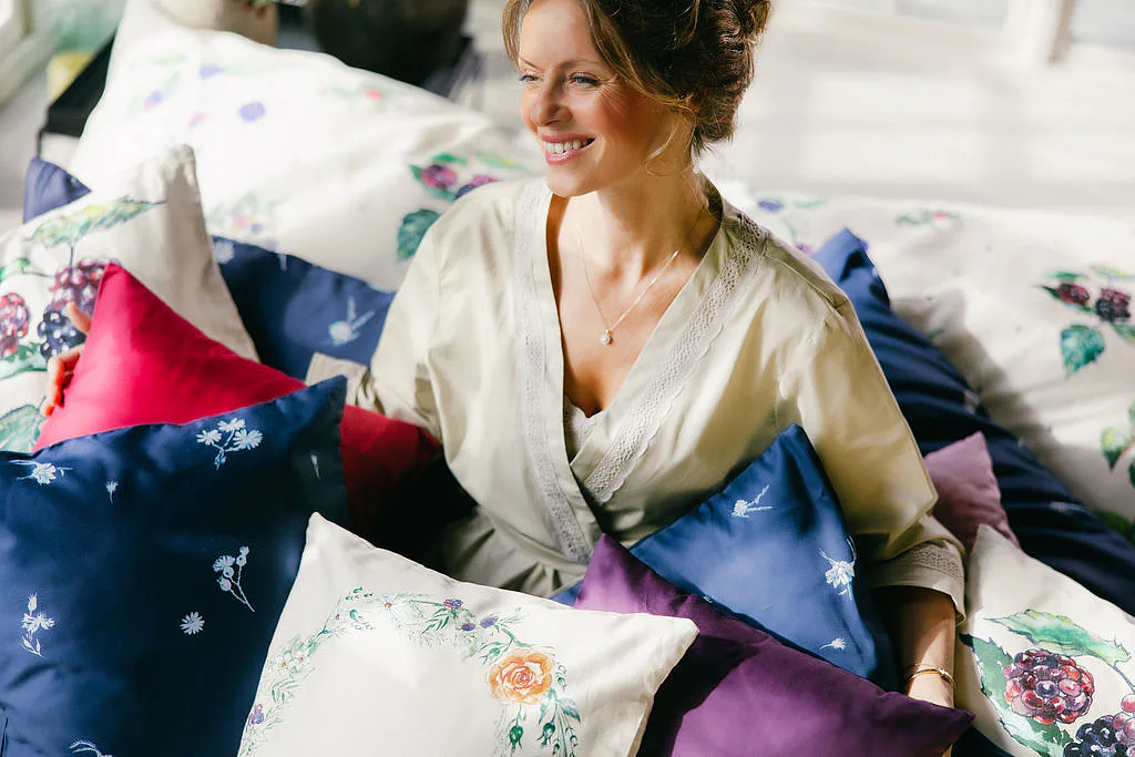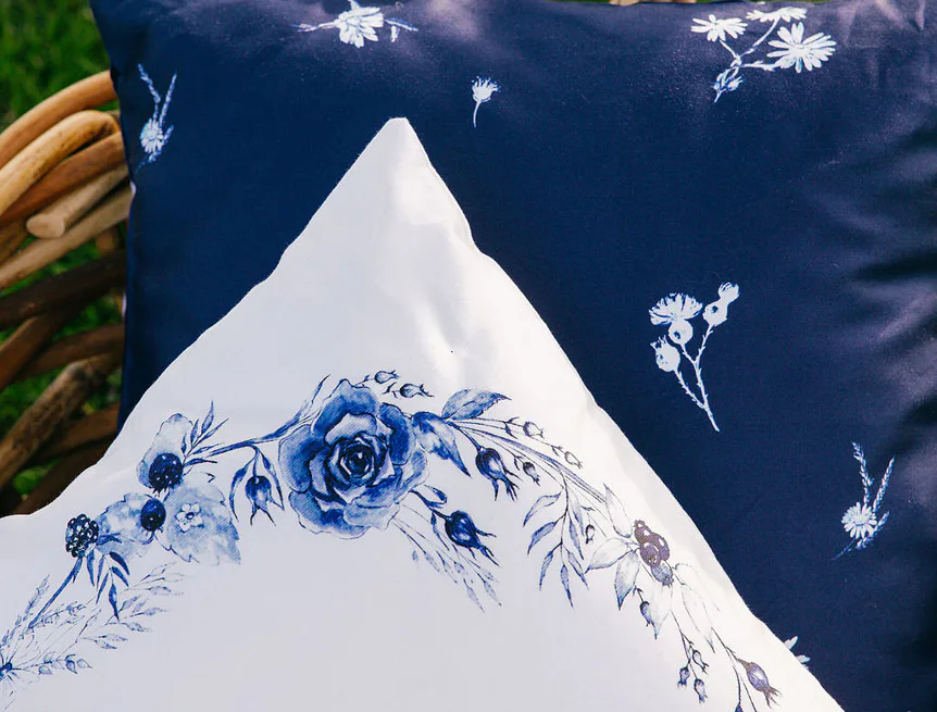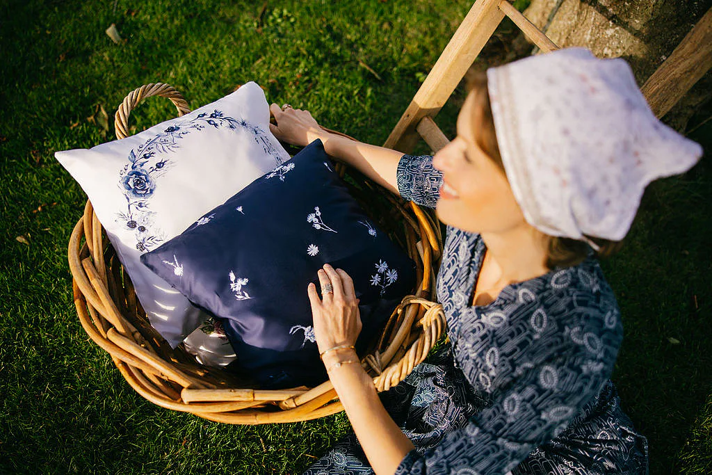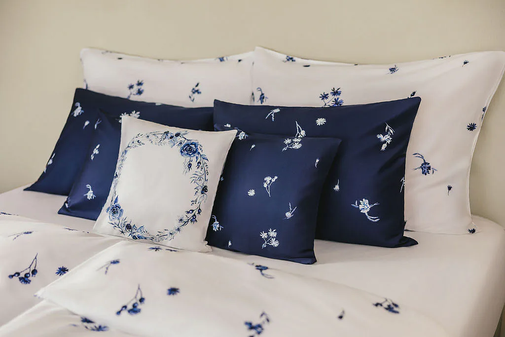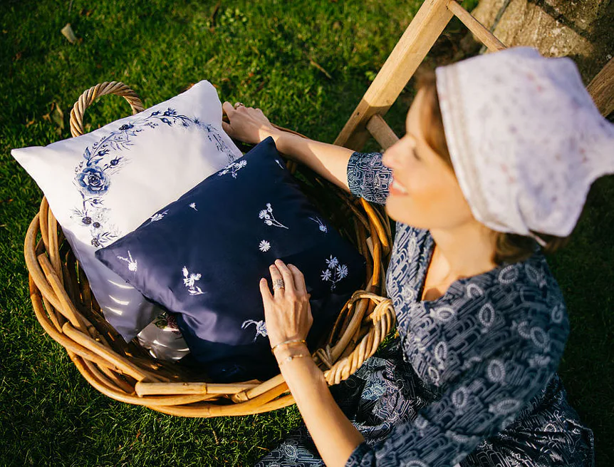 Indigo je něžně osobité. Zuzana ho vnímá jako svou srdeční linku: „Modrobílá kombinace je součástí mého rukopisu… nadčasově krásná, s odkazem tradice,“ od porcelánu po modrotisk. V interiéru přináší disciplínu i mír – čistou linii, kterou si zamilují chalupy i městské byty. Je to návrat k „něčemu, co je nám milé“, přenesený do současnosti s lehkostí saténu.