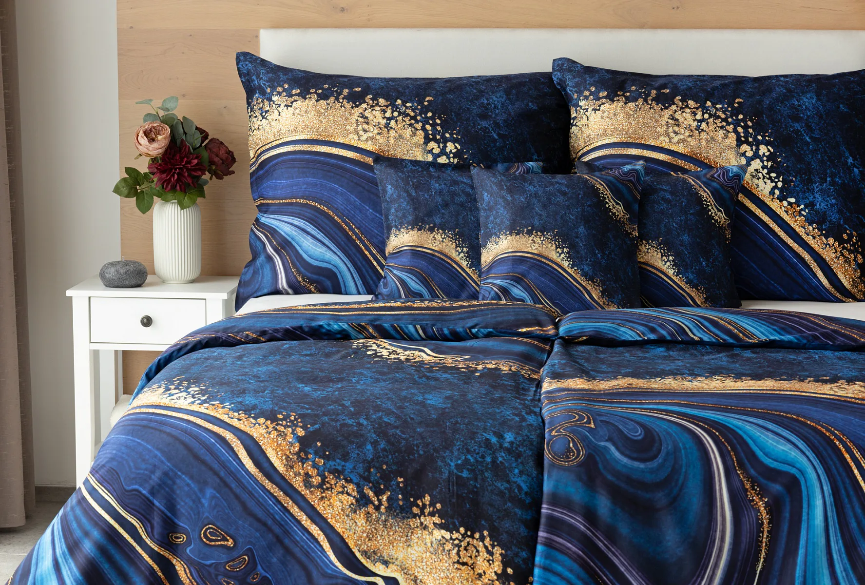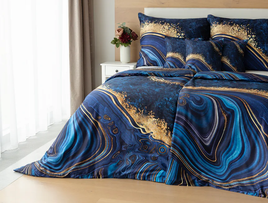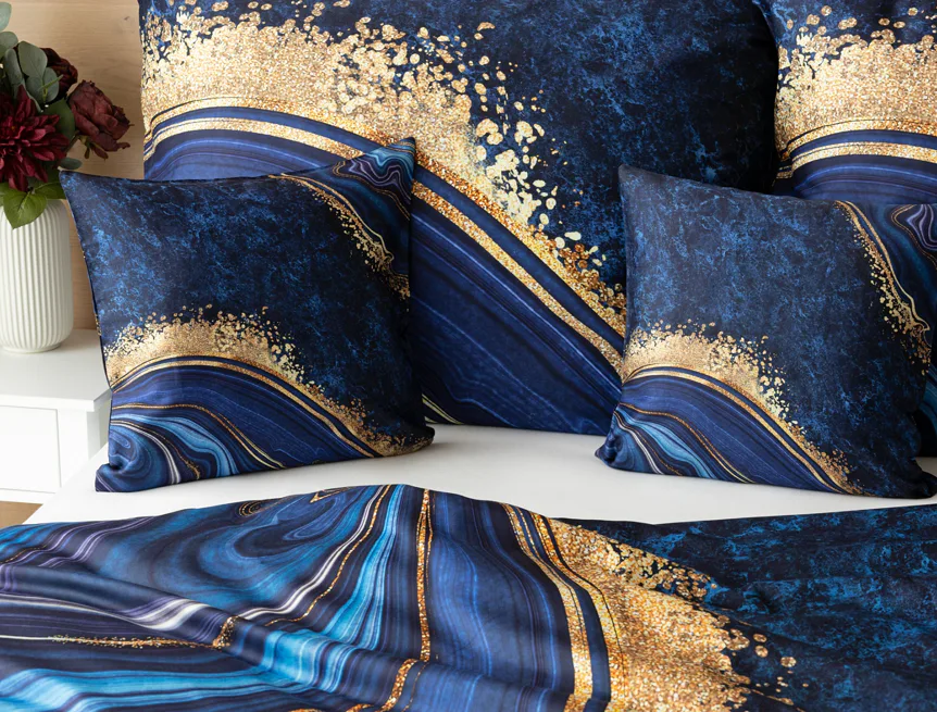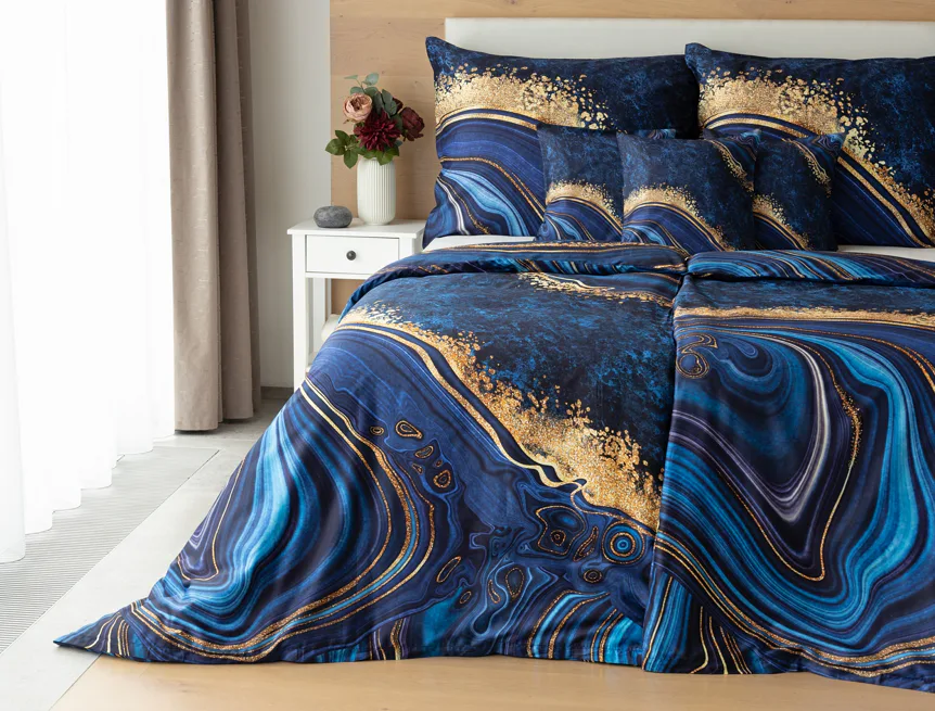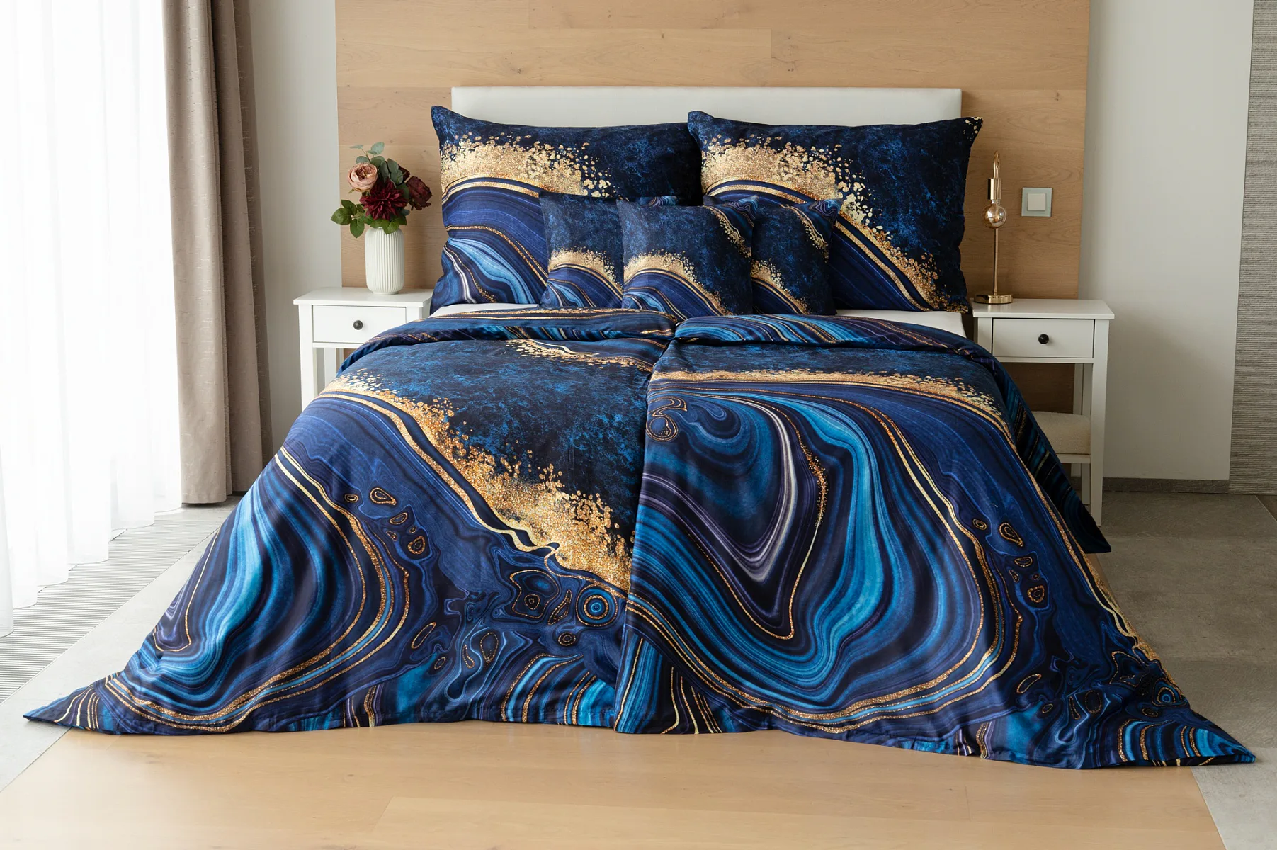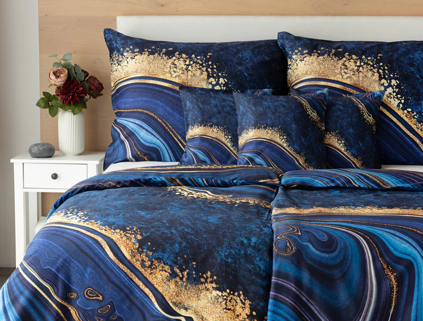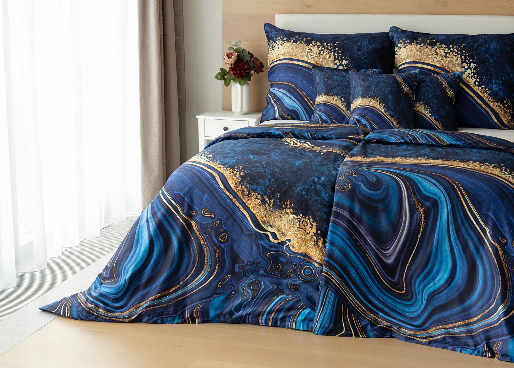 Ložní povlečení Iris si jednoduše zamilujete. Abstraktnímu vzoru dominují odstíny modré barvy, která působí na lidskou mysl klidně a harmonicky, přináší atmosféru stability a tradice. Modré barvě sluší kombinace se zlatou, díky které získává noblesní nádech, a přesně tyto odstíny barev se snoubí ve vzoru Iris.