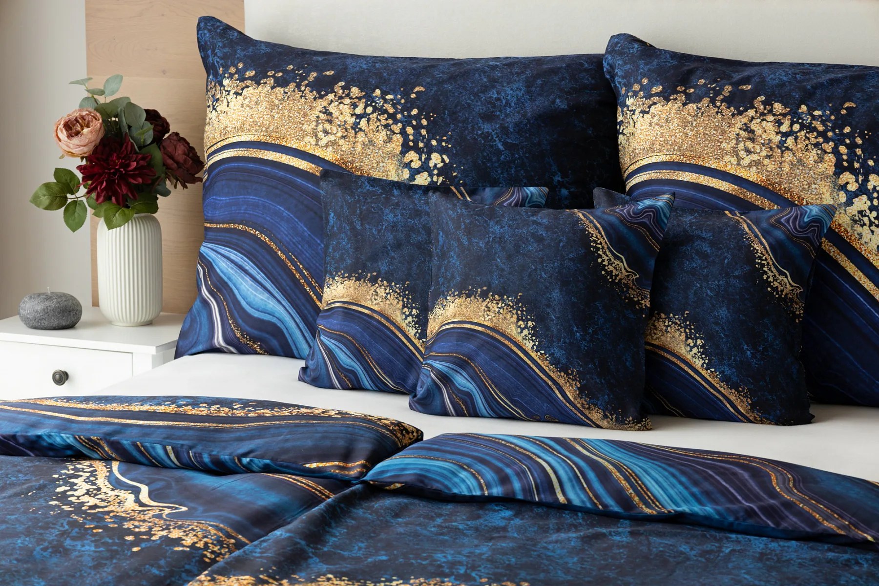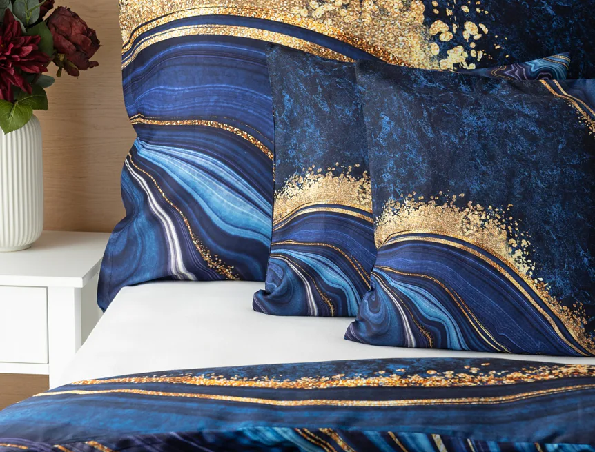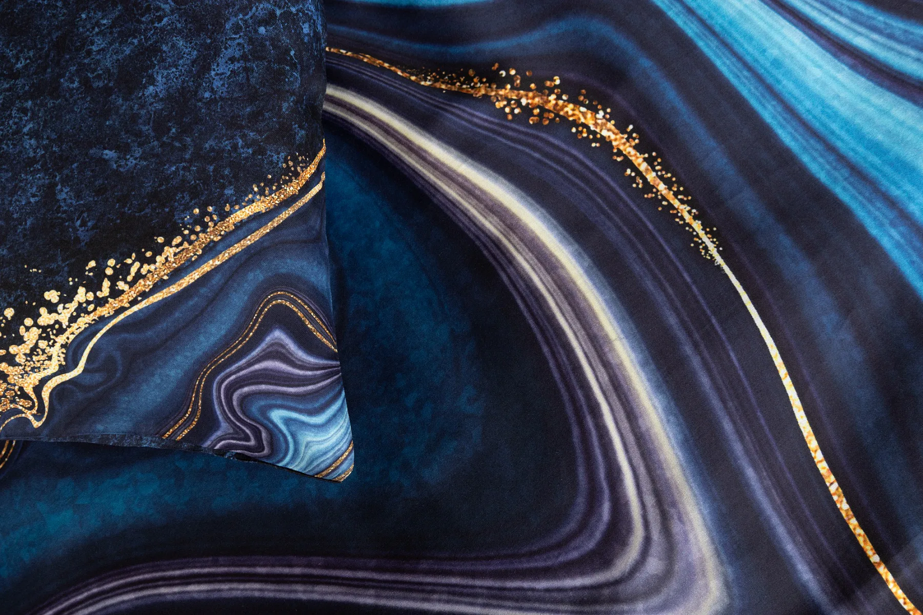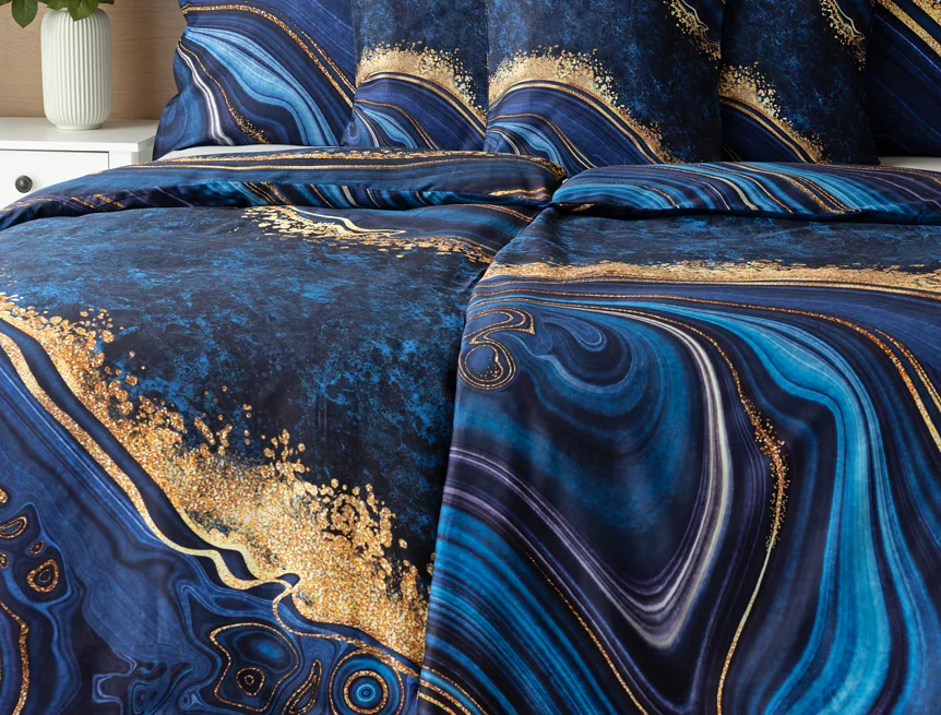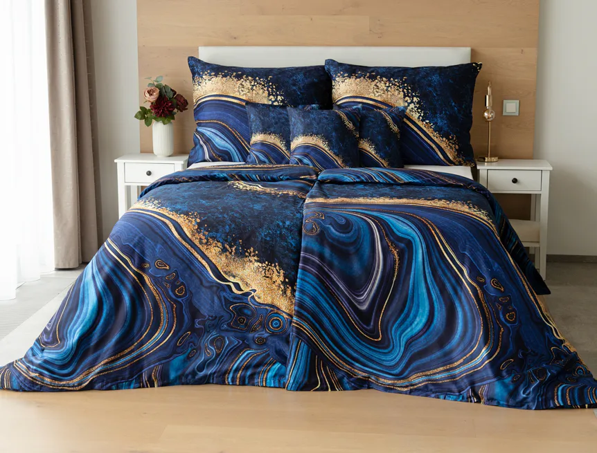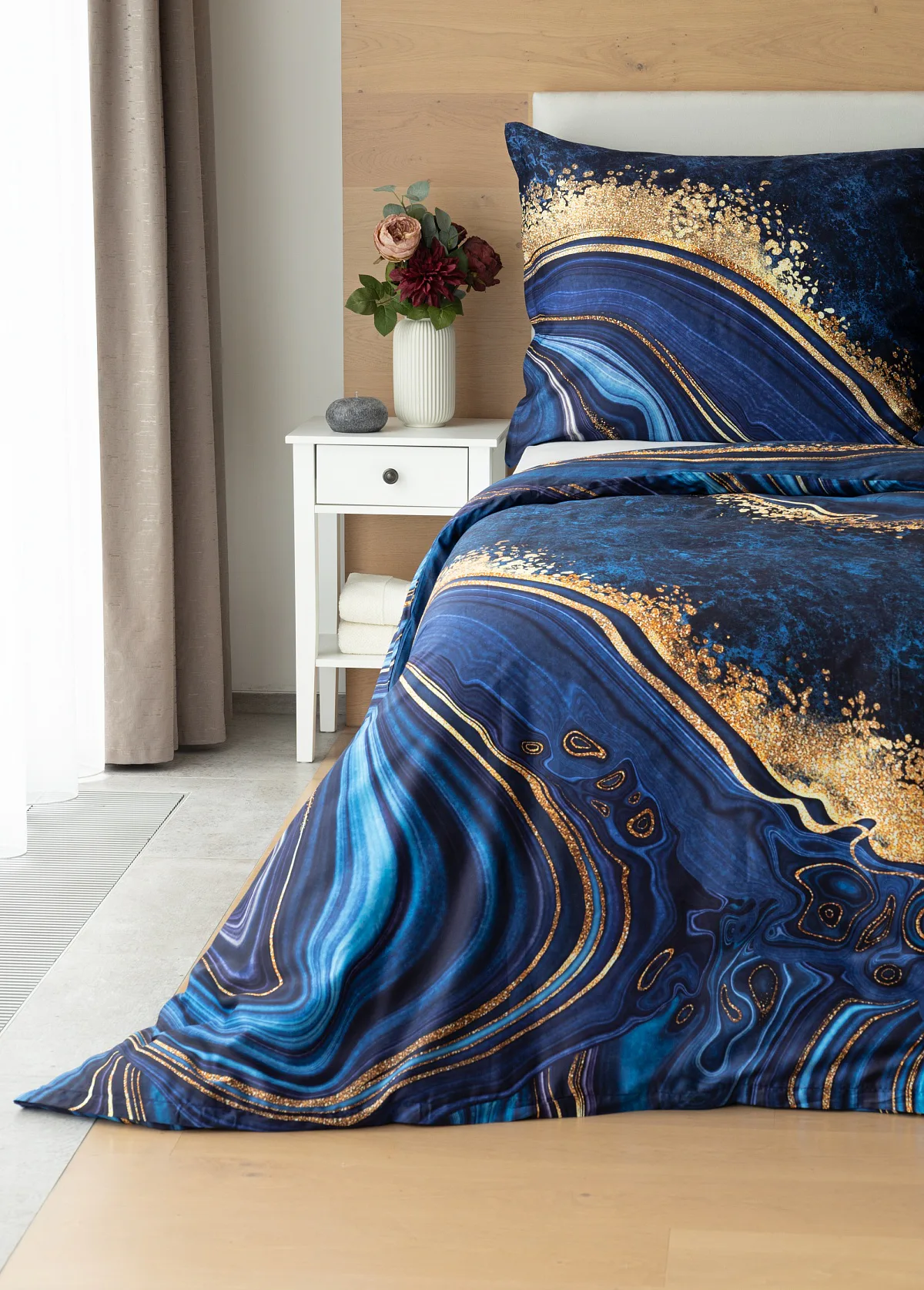 Ložní povlečení Iris si jednoduše zamilujete. Abstraktnímu vzoru dominují odstíny modré barvy, která působí na lidskou mysl klidně a harmonicky, přináší atmosféru stability a tradice. Modré barvě sluší kombinace se zlatou, díky které získává noblesní nádech, a přesně tyto odstíny barev se snoubí ve vzoru Iris.
