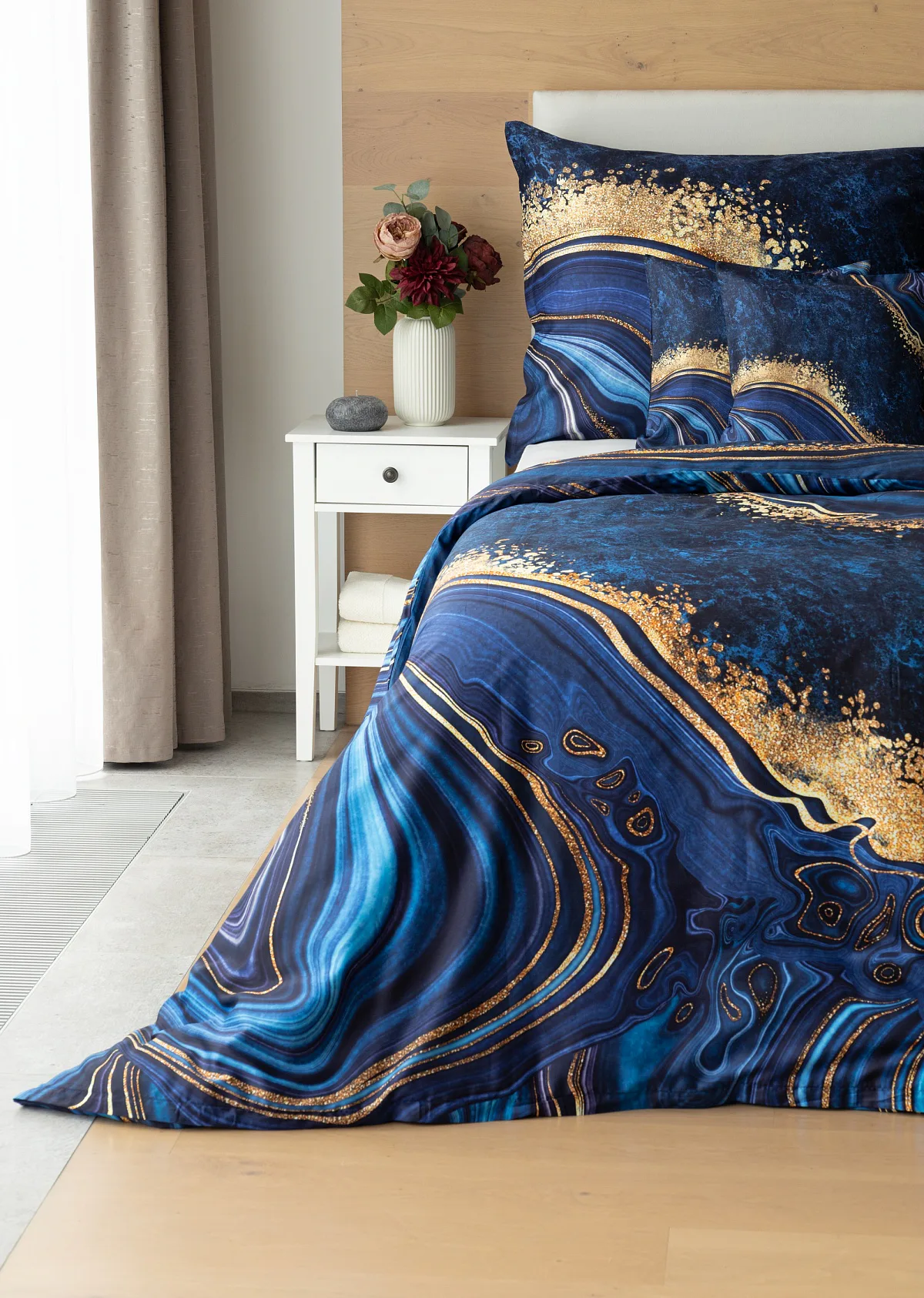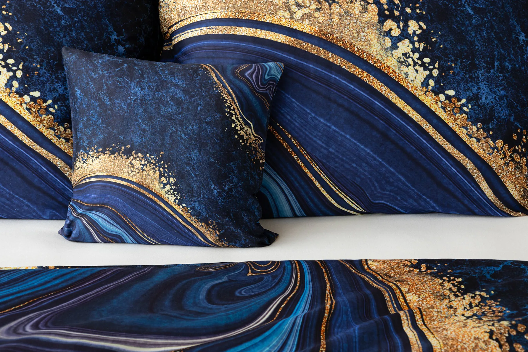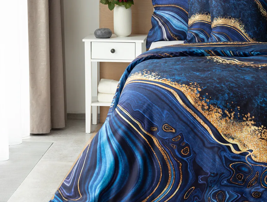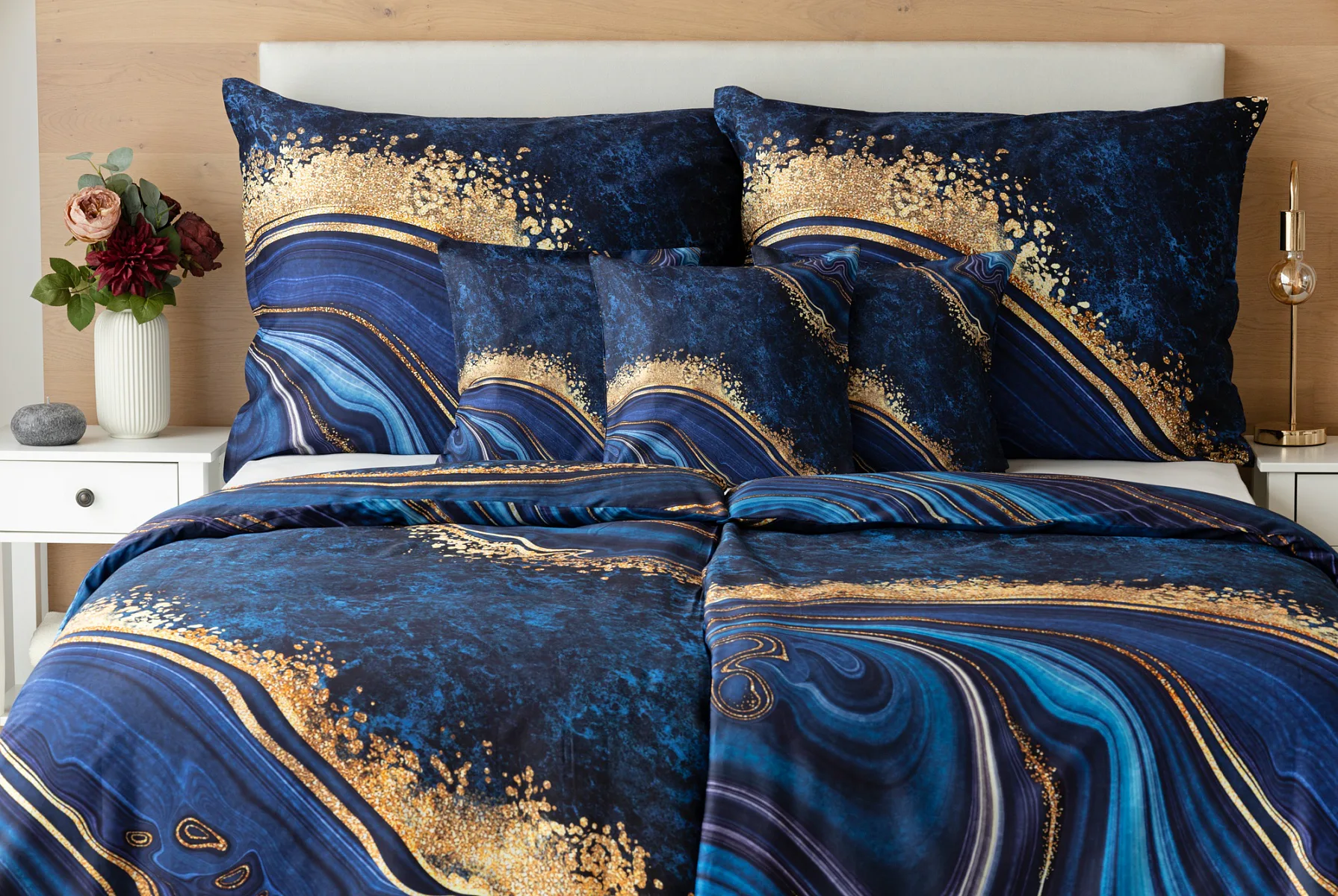 Ložní povlečení Iris si jednoduše zamilujete. Abstraktnímu vzoru dominují odstíny modré barvy, která působí na lidskou mysl klidně a harmonicky, přináší atmosféru stability a tradice. Modré barvě sluší kombinace se zlatou, díky které získává noblesní nádech, a přesně tyto odstíny barev se snoubí ve vzoru Iris.