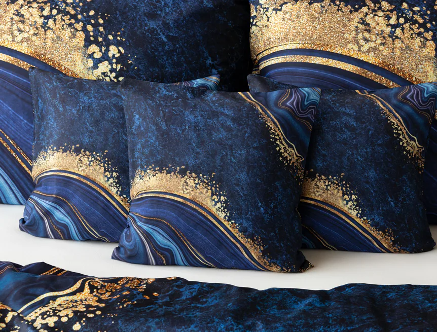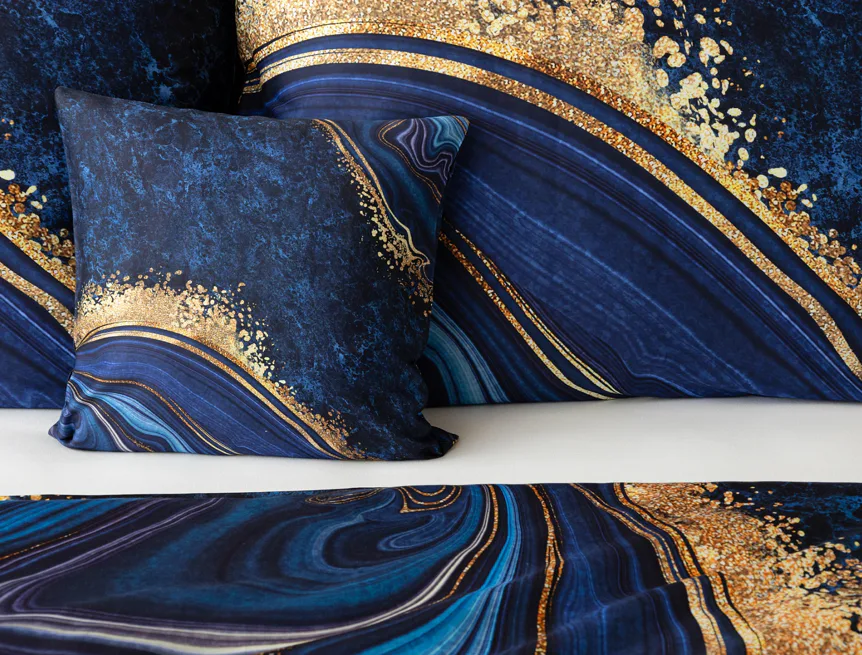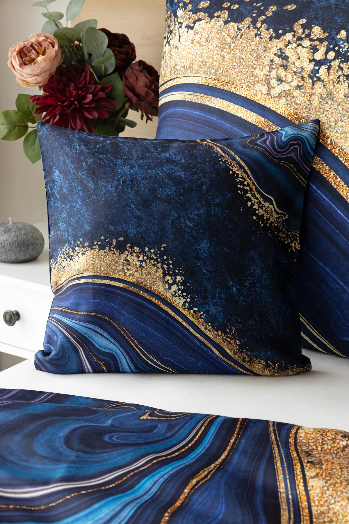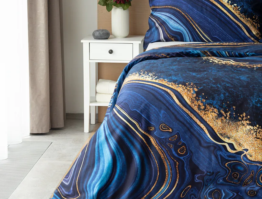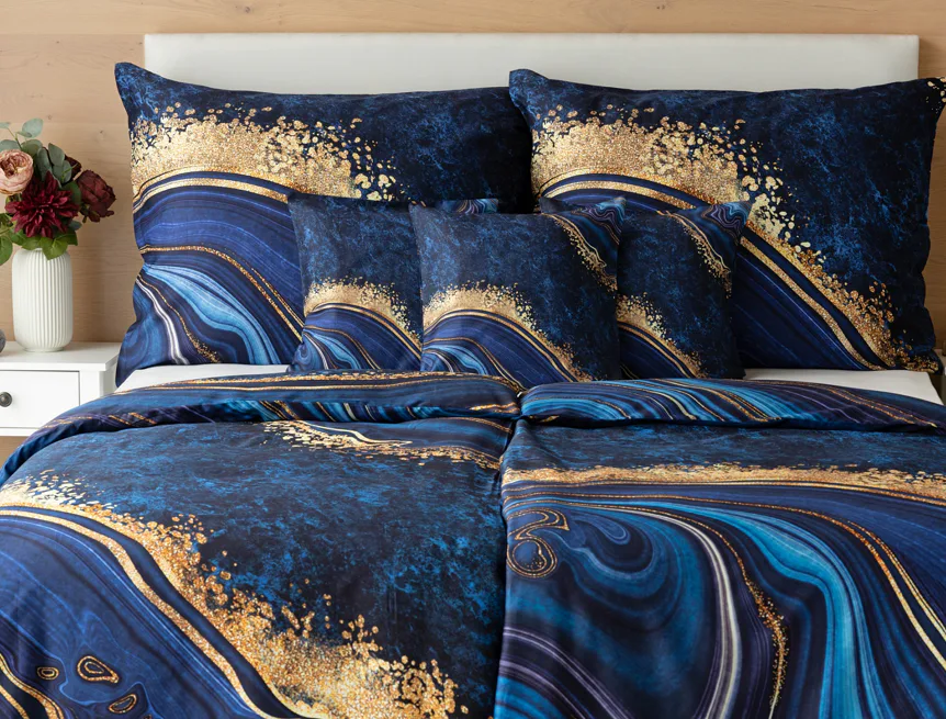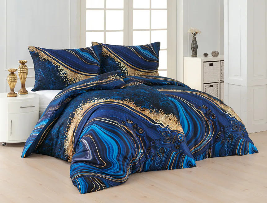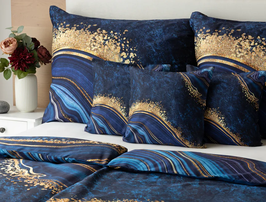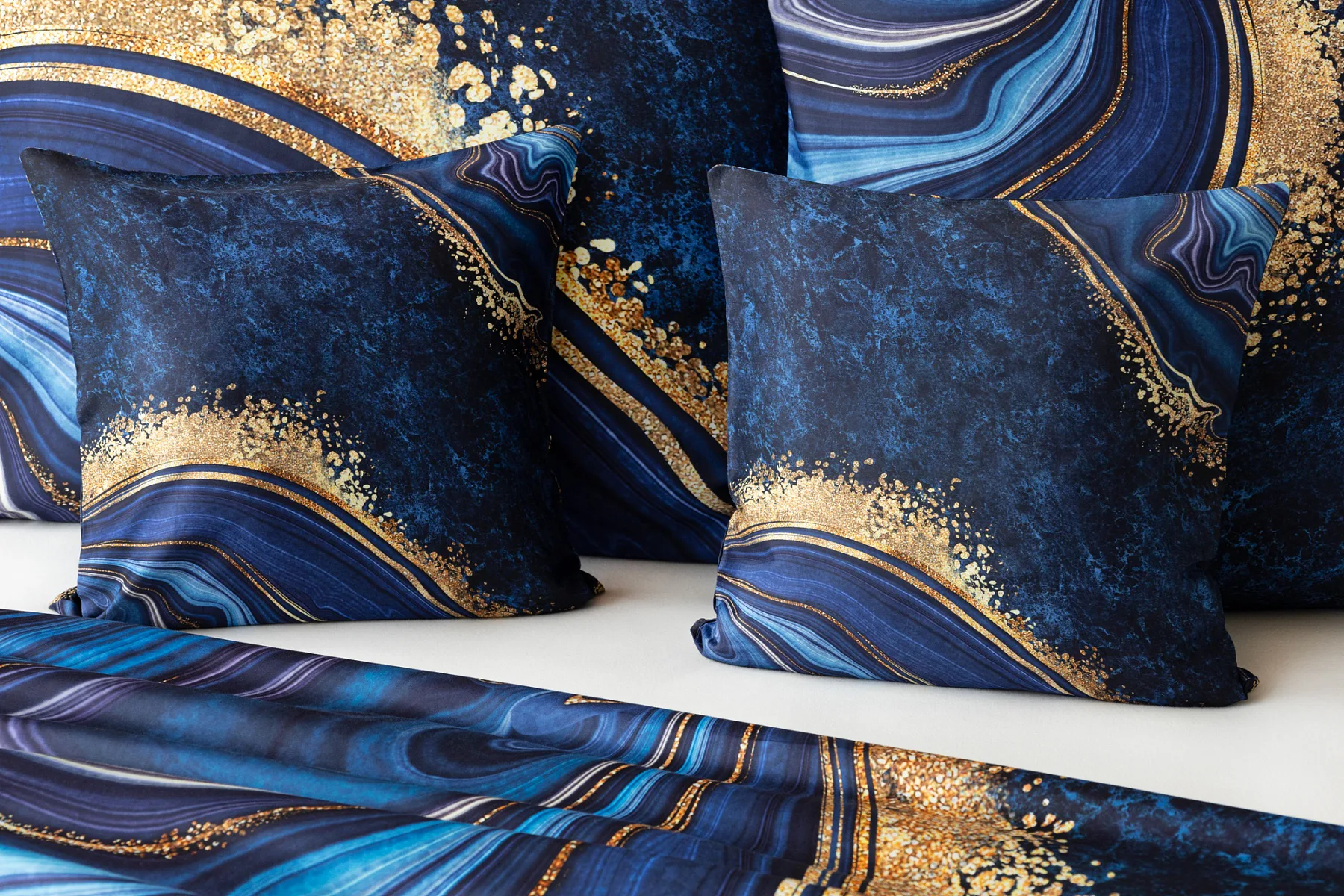 Ložní povlečení Iris si jednoduše zamilujete. Abstraktnímu vzoru dominují odstíny modré barvy, která působí na lidskou mysl klidně a harmonicky, přináší atmosféru stability a tradice. Modré barvě sluší kombinace se zlatou, díky které získává noblesní nádech, a přesně tyto odstíny barev se snoubí ve vzoru Iris.