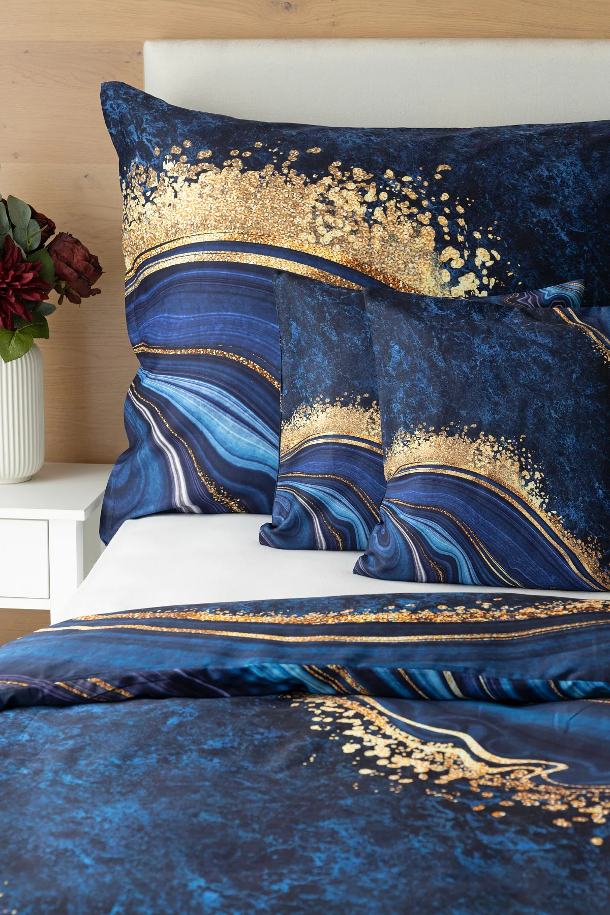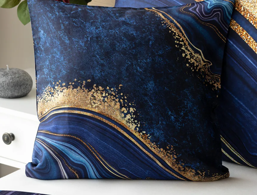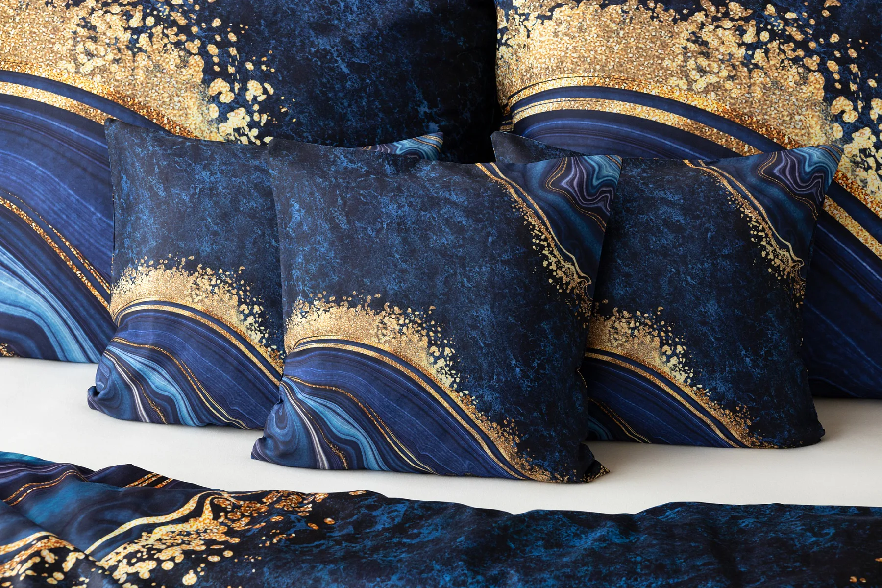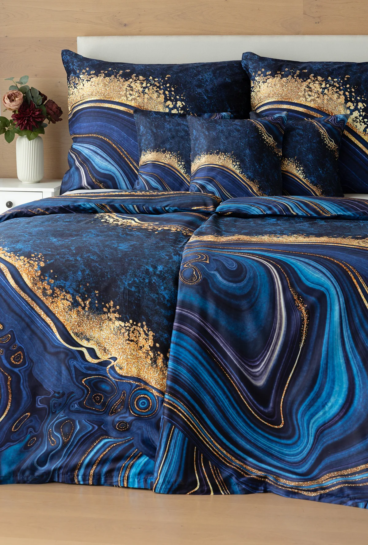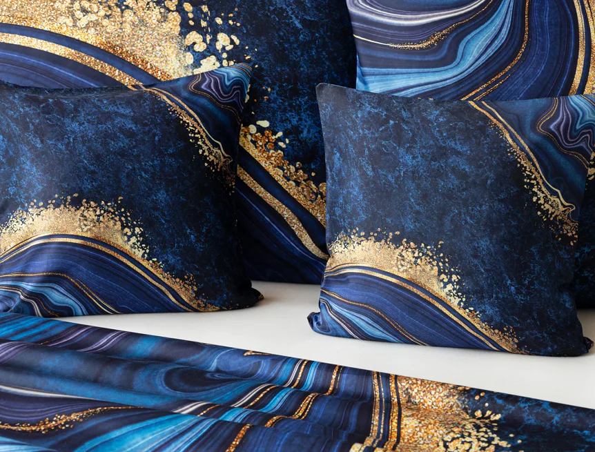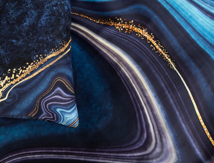Ložní povlečení Iris si jednoduše zamilujete. Abstraktnímu vzoru dominují odstíny modré barvy, která působí na lidskou mysl klidně a harmonicky, přináší atmosféru stability a tradice. Modré barvě sluší kombinace se zlatou, díky které získává noblesní nádech, a přesně tyto odstíny barev se snoubí ve vzoru Iris.