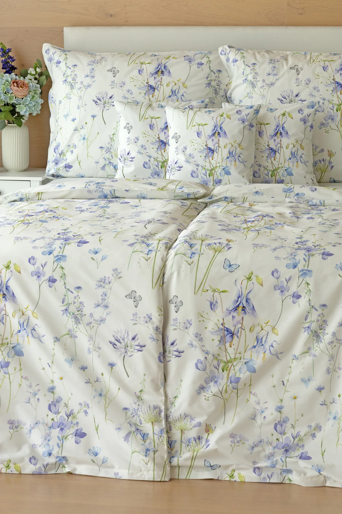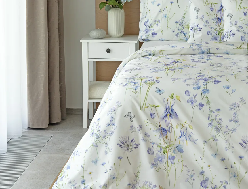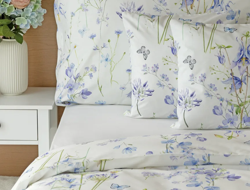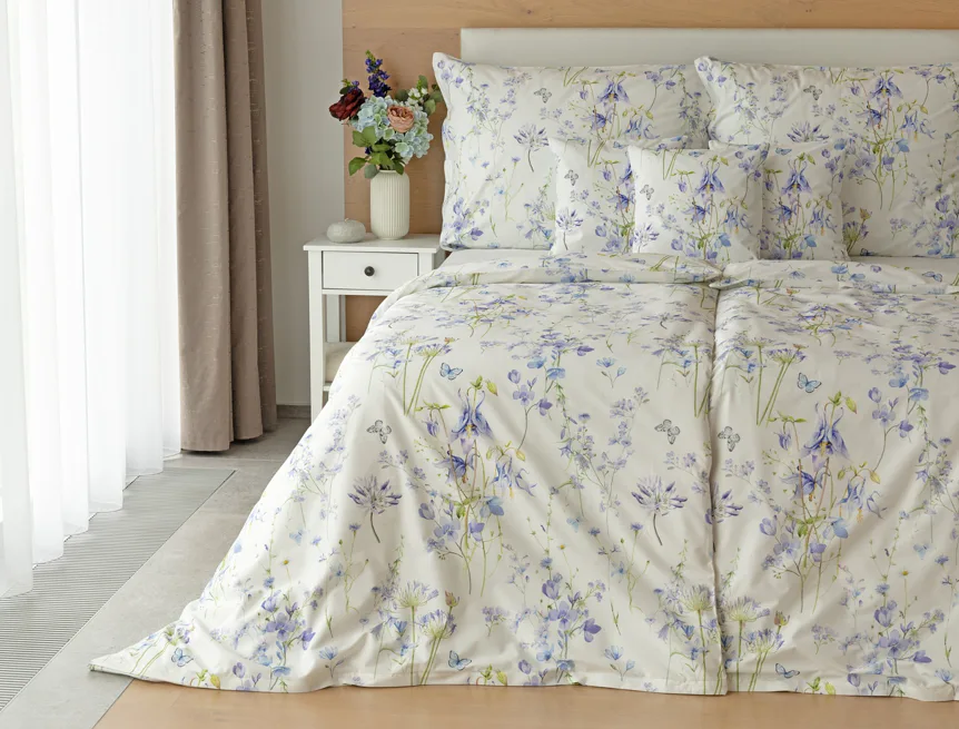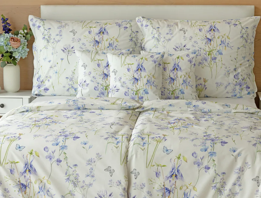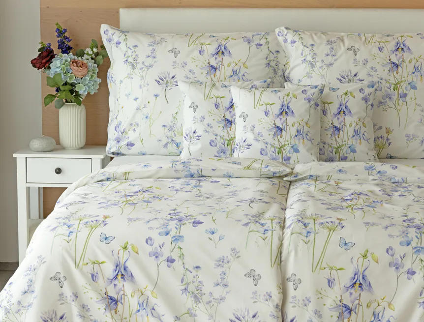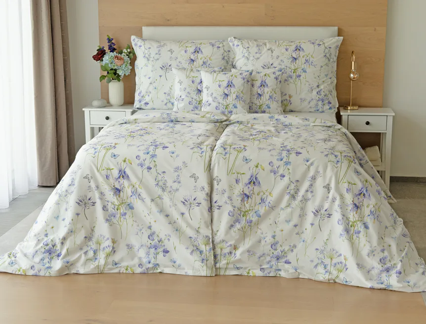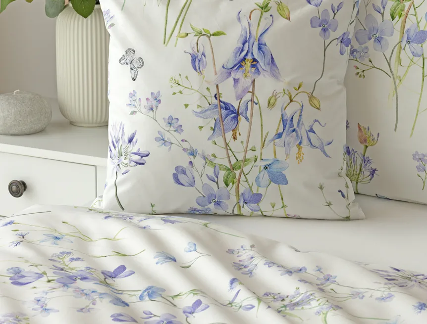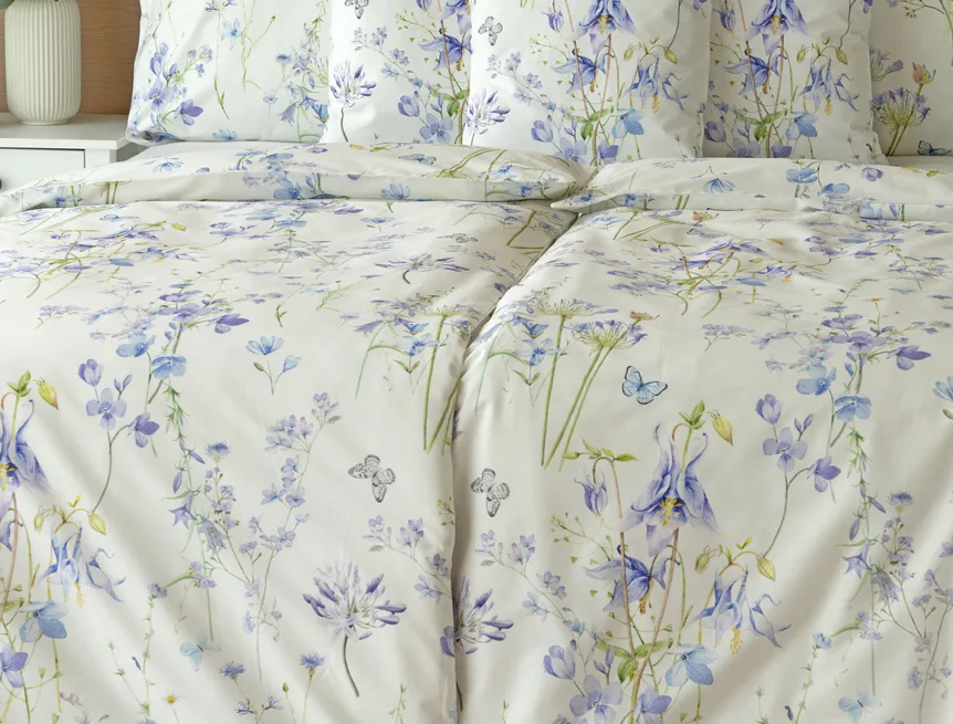 Zvonky, fialky, chrpy sedmikrásky a spousta dalších lučních květin zdobí bavlněné ložní povlečení Isabelle. Kvítky v převažujících modrofialových tónech se prolínají na krémově bílém podkladu a nechybí samozřejmě ani drobní motýlci. Nechte svou ložnici rozkvést! Díky nejmodernějšímu digitálnímu tisku vyniká vzor v precizním detailu.