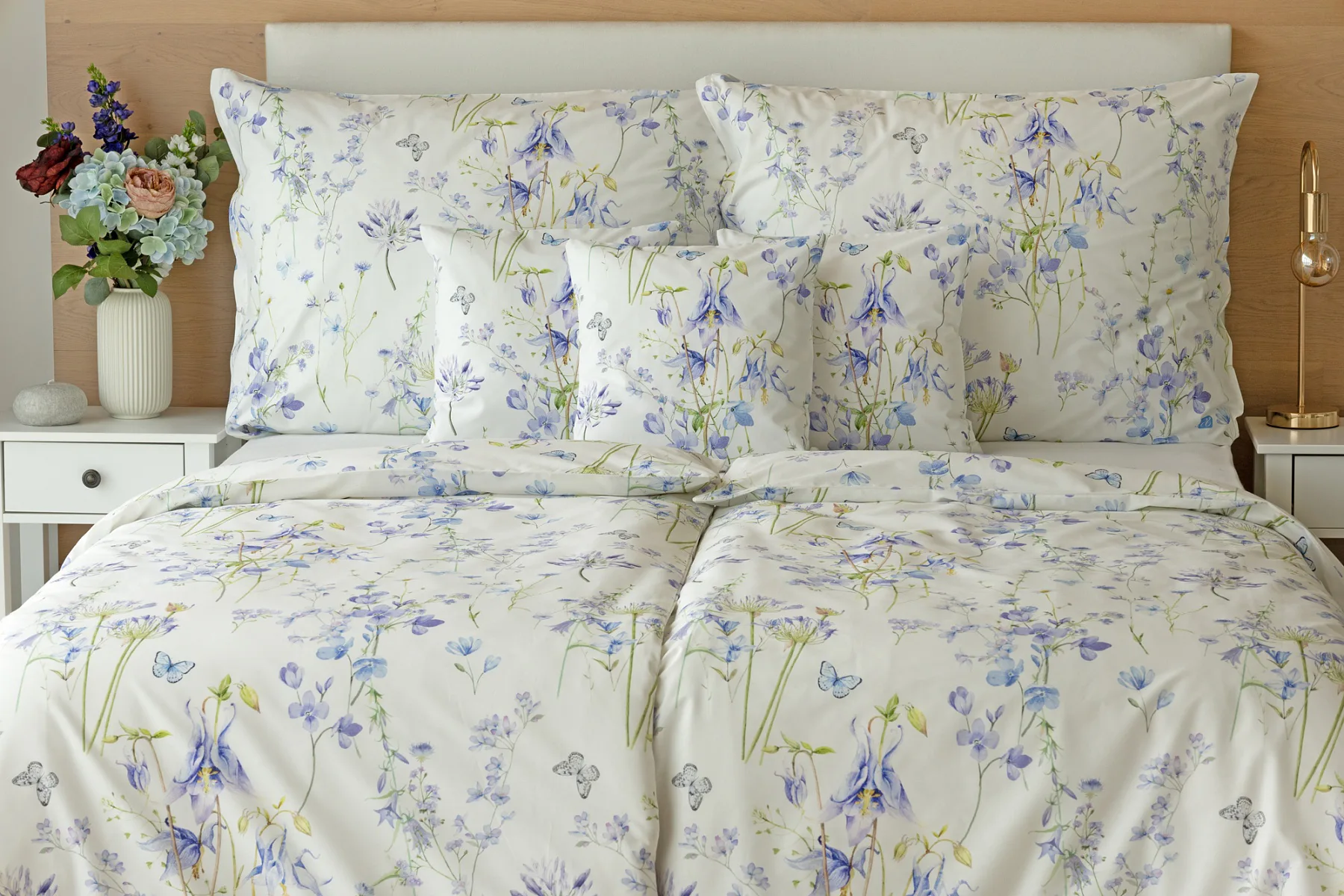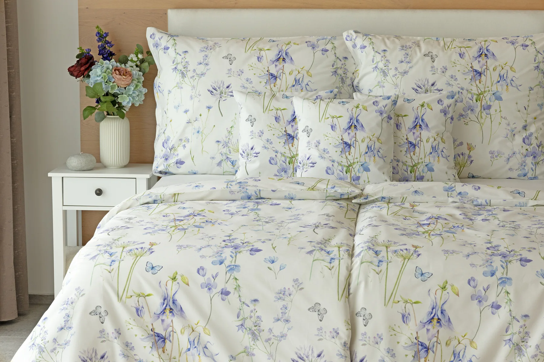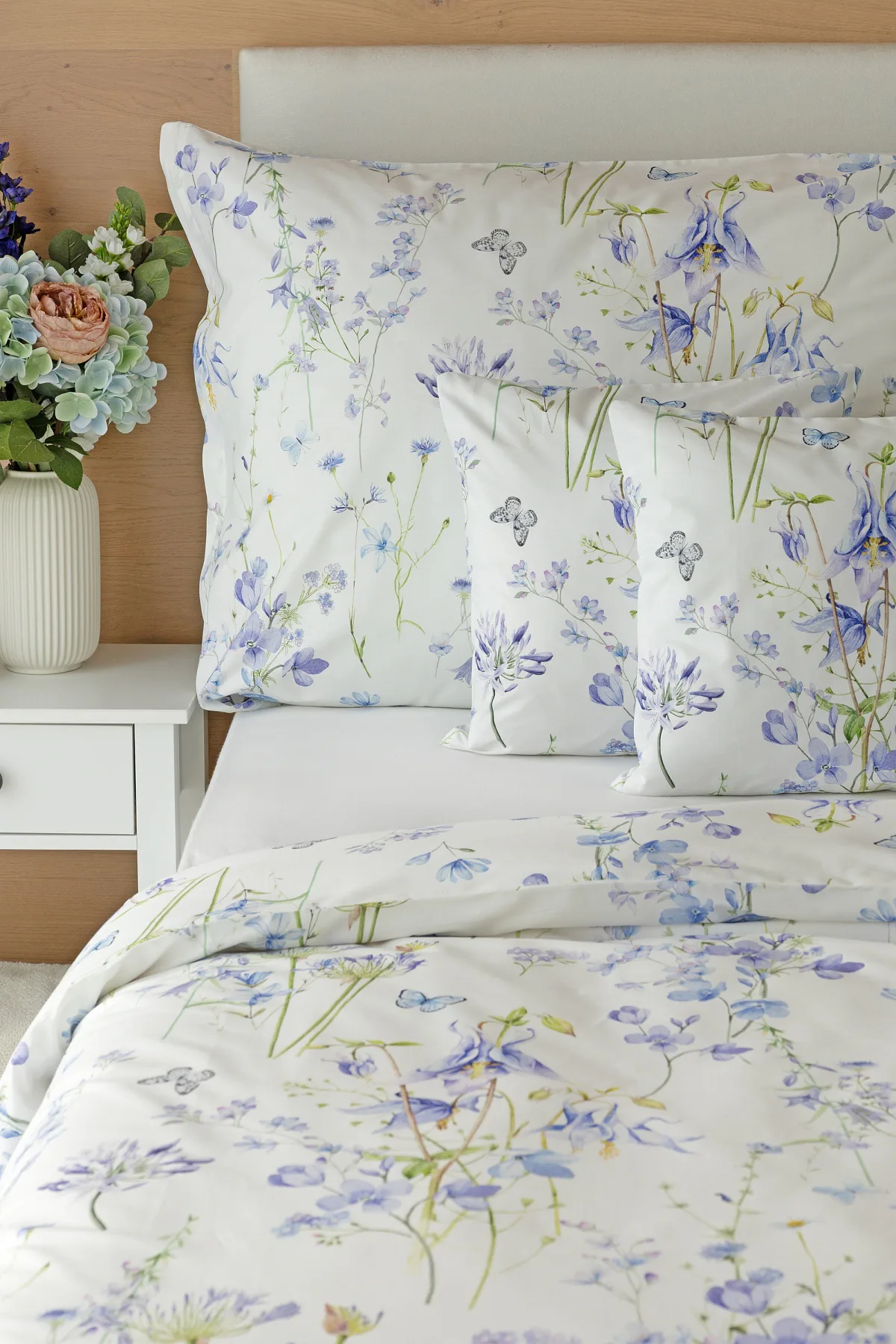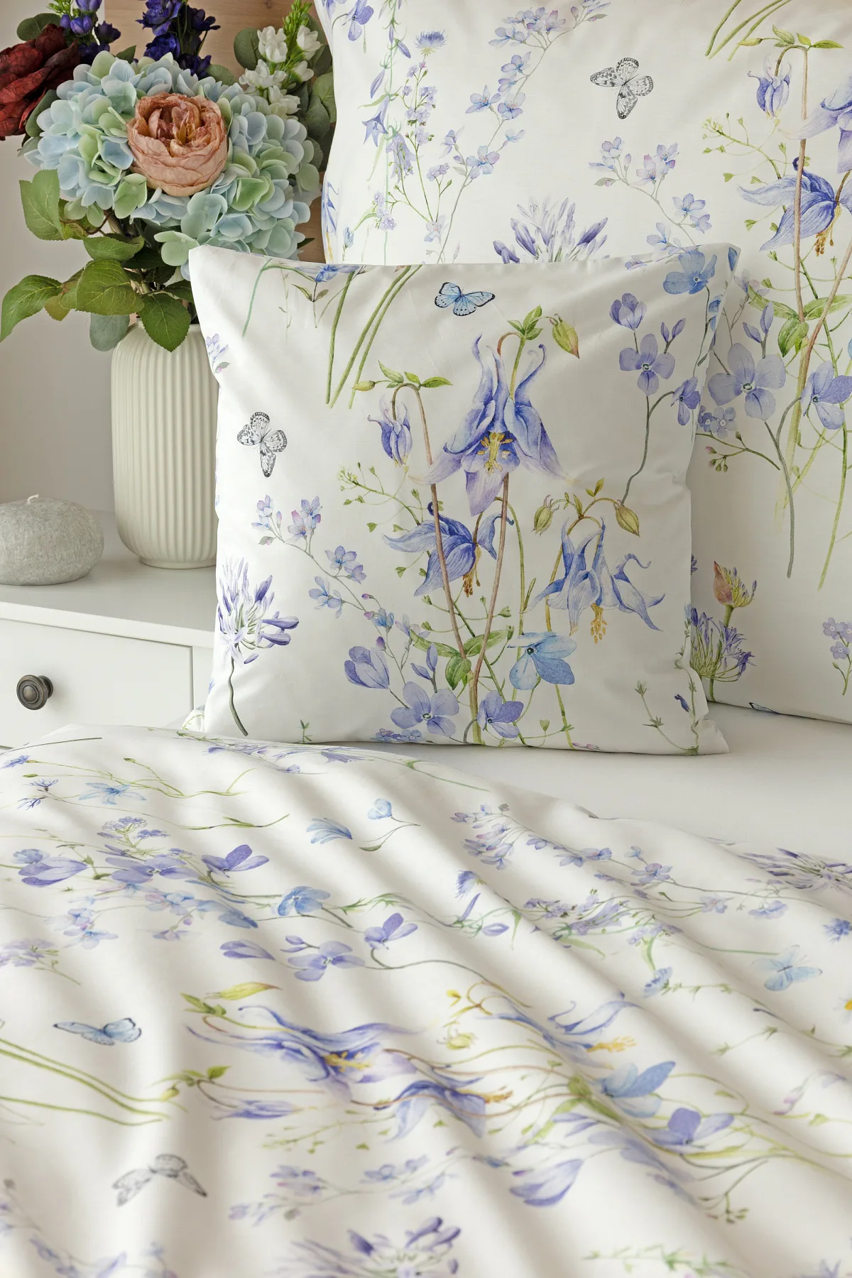 Zvonky, fialky, chrpy sedmikrásky a spousta dalších lučních květin zdobí bavlněné ložní povlečení Isabelle. Kvítky v převažujících modrofialových tónech se prolínají na krémově bílém podkladu a nechybí samozřejmě ani drobní motýlci. Nechte svou ložnici rozkvést! Díky nejmodernějšímu digitálnímu tisku vyniká vzor v precizním detailu.