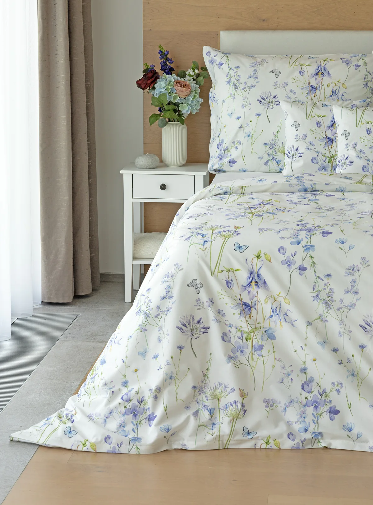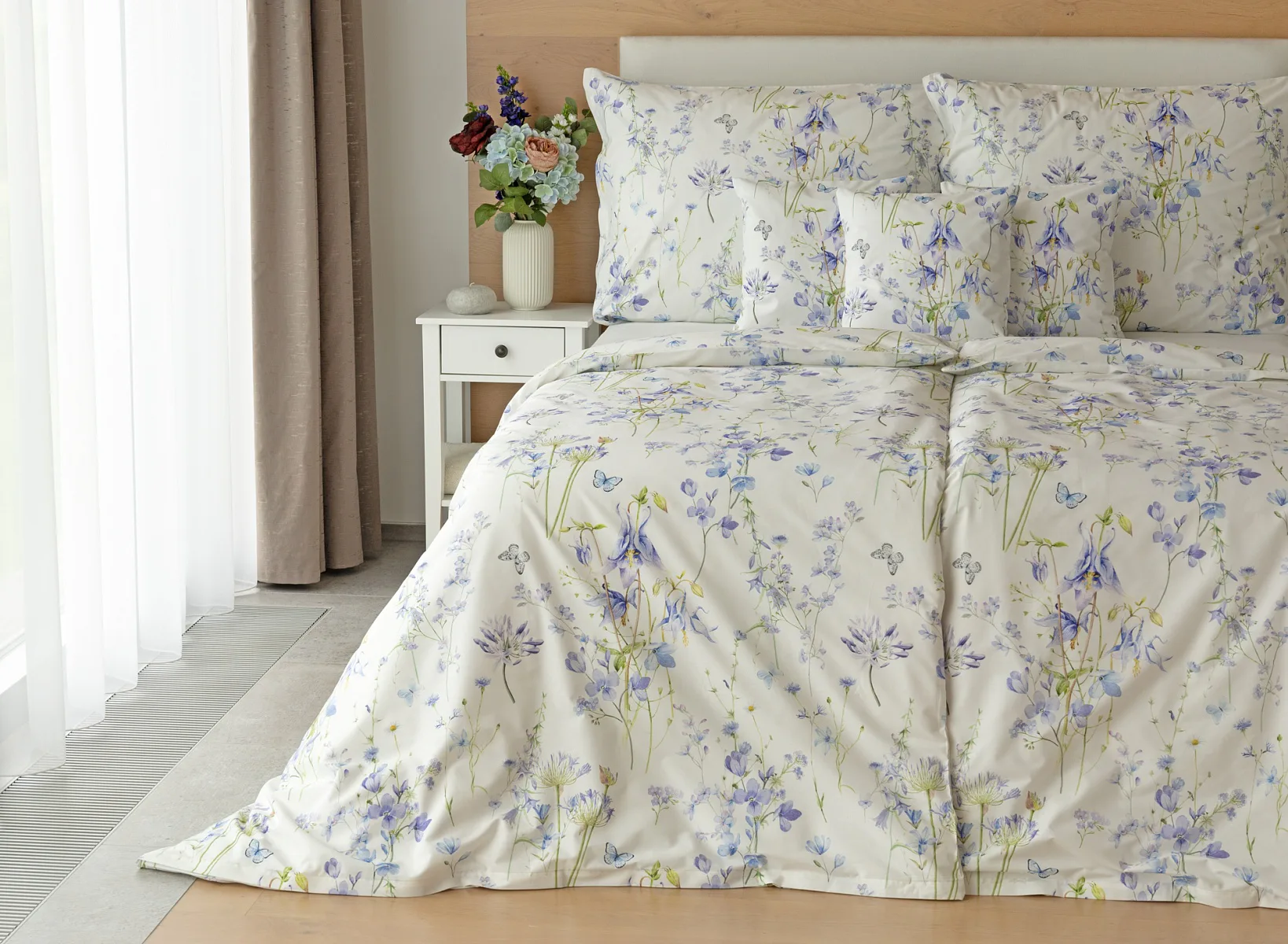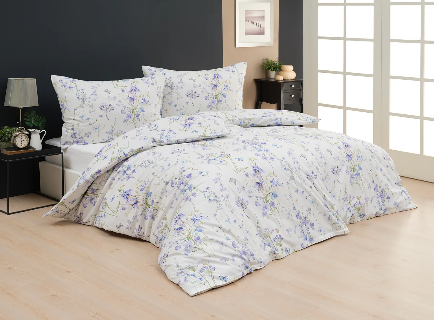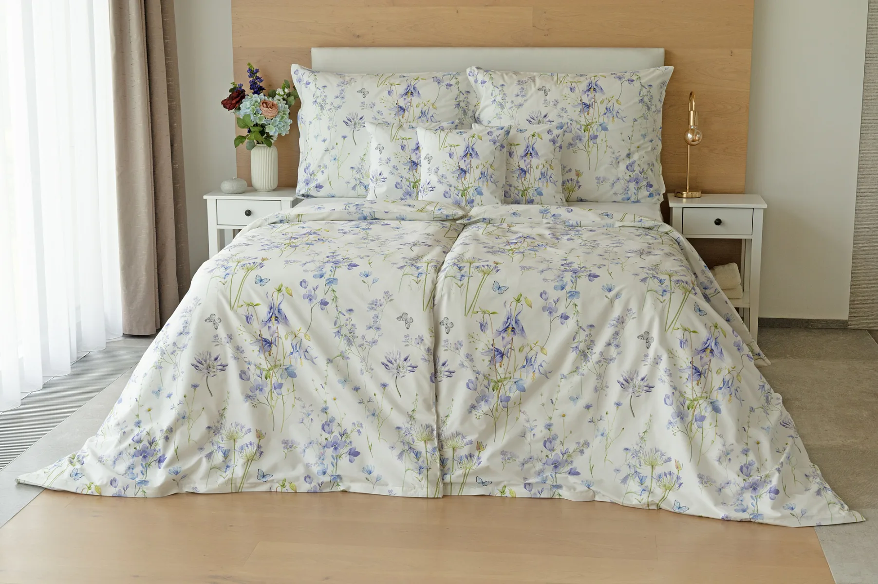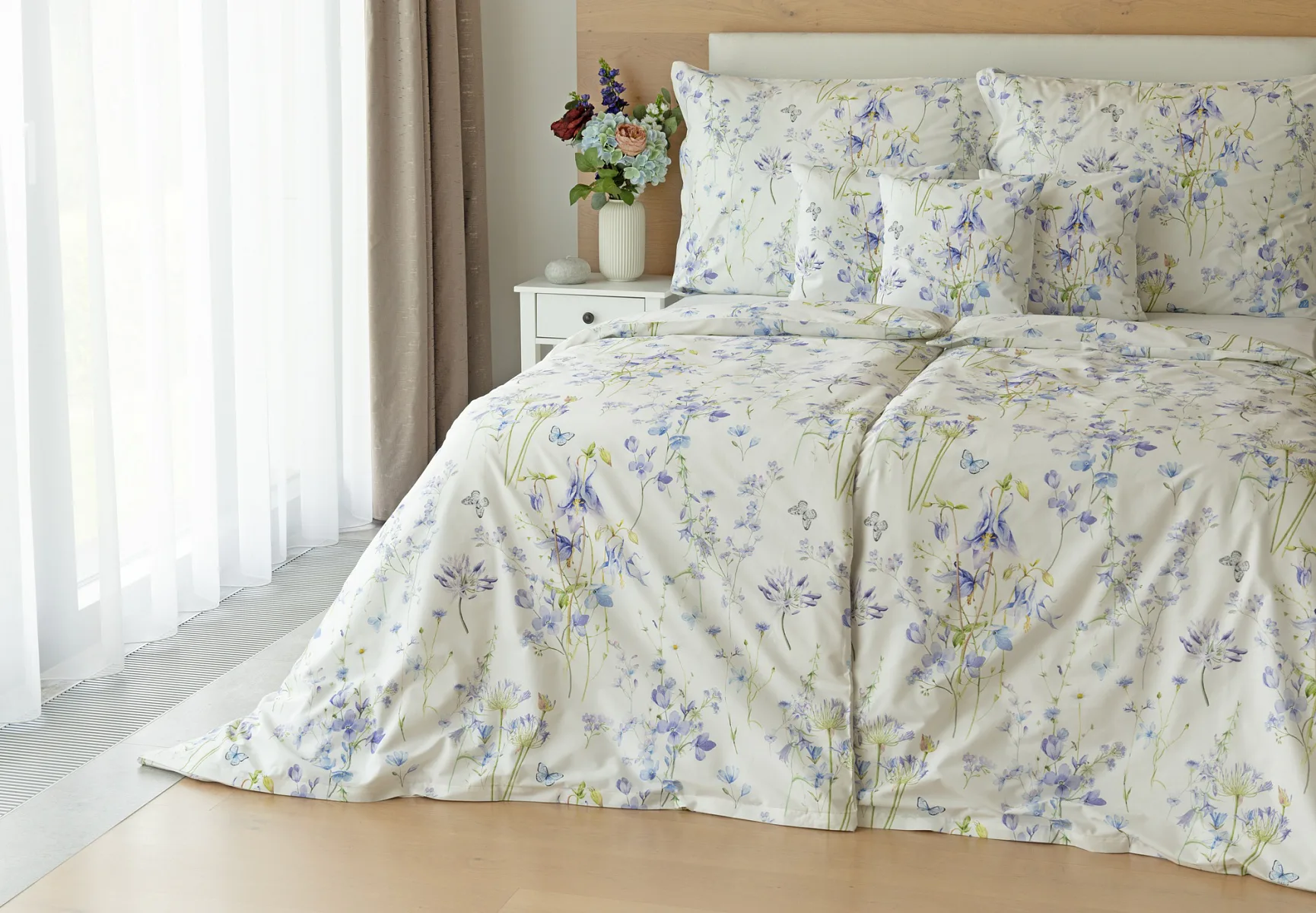 Zvonky, fialky, chrpy sedmikrásky a spousta dalších lučních květin zdobí bavlněné ložní povlečení Isabelle. Kvítky v převažujících modrofialových tónech se prolínají na krémově bílém podkladu a nechybí samozřejmě ani drobní motýlci. Nechte svou ložnici rozkvést! Díky nejmodernějšímu digitálnímu tisku vyniká vzor v precizním detailu.