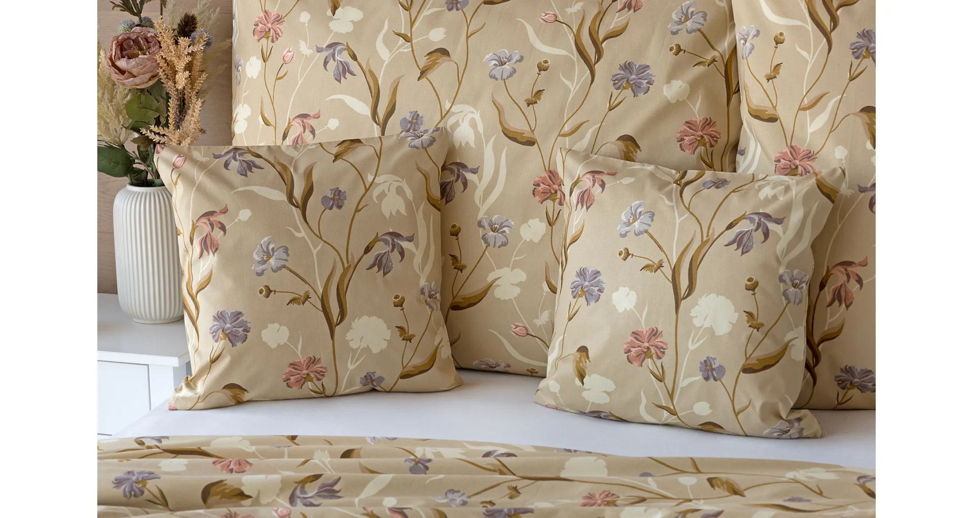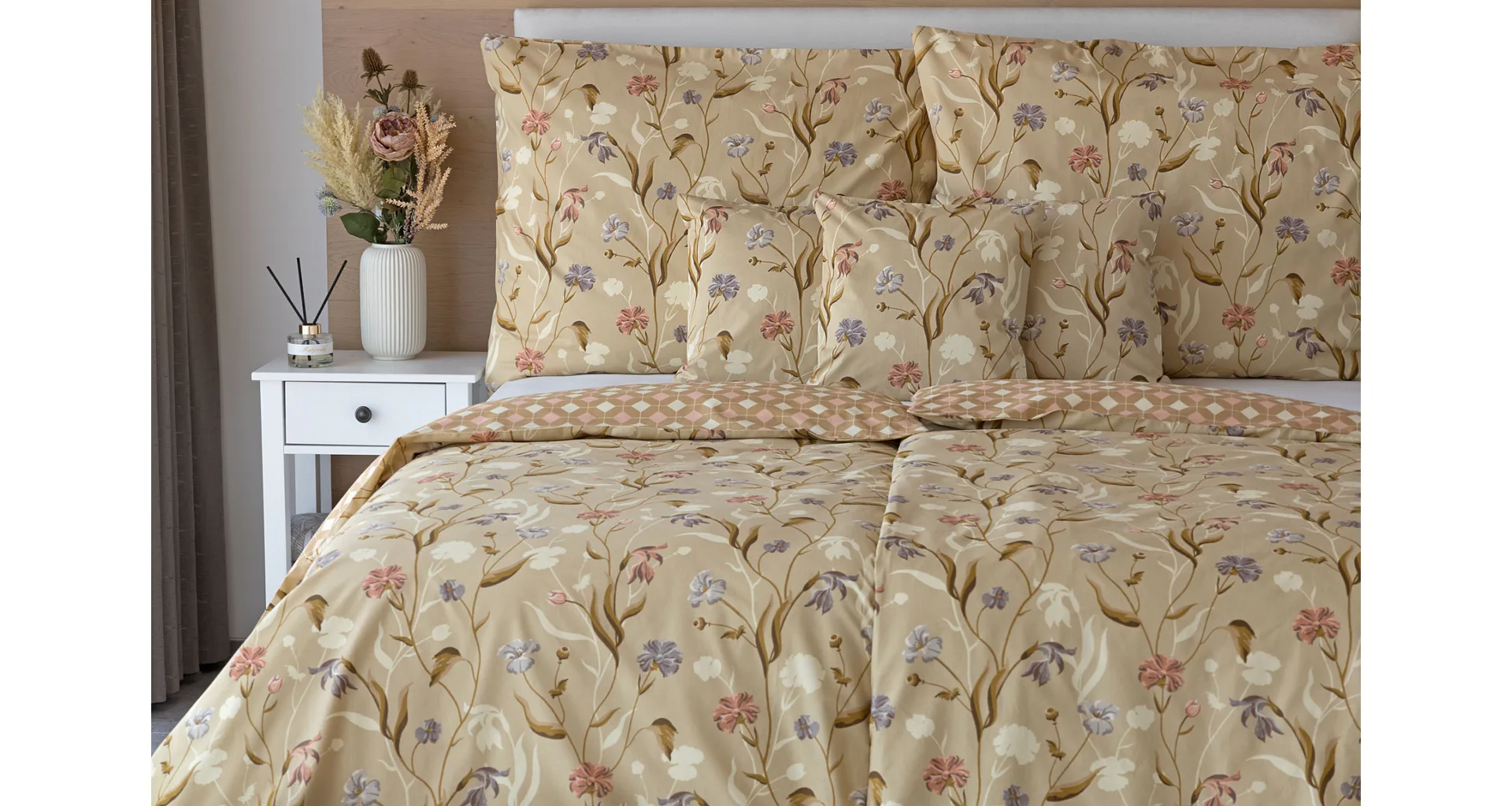 Bavlněné povlečení Joanna vás okouzlí hřejivými barvami a nápaditou kombinací vzorů. Květinový motiv z jedné strany tvoří drobné starorůžové a fialovo-modré kvítky na světle hnědém podkladu. Druhou stranu povlečení zdobí plošný geometrický vzor, takže při stlaní můžete hravě improvizovat.