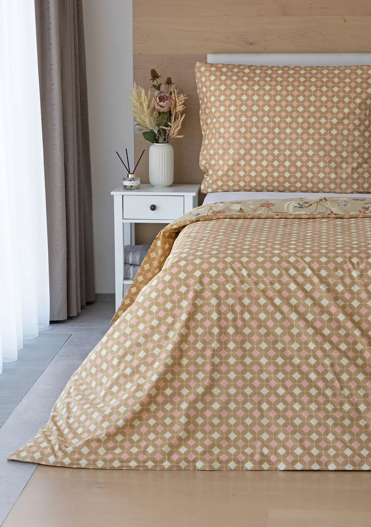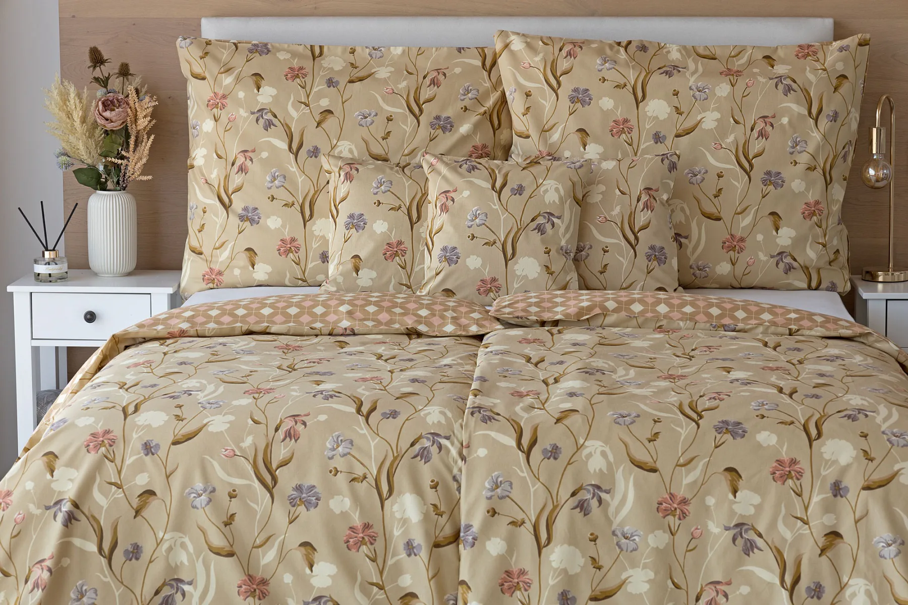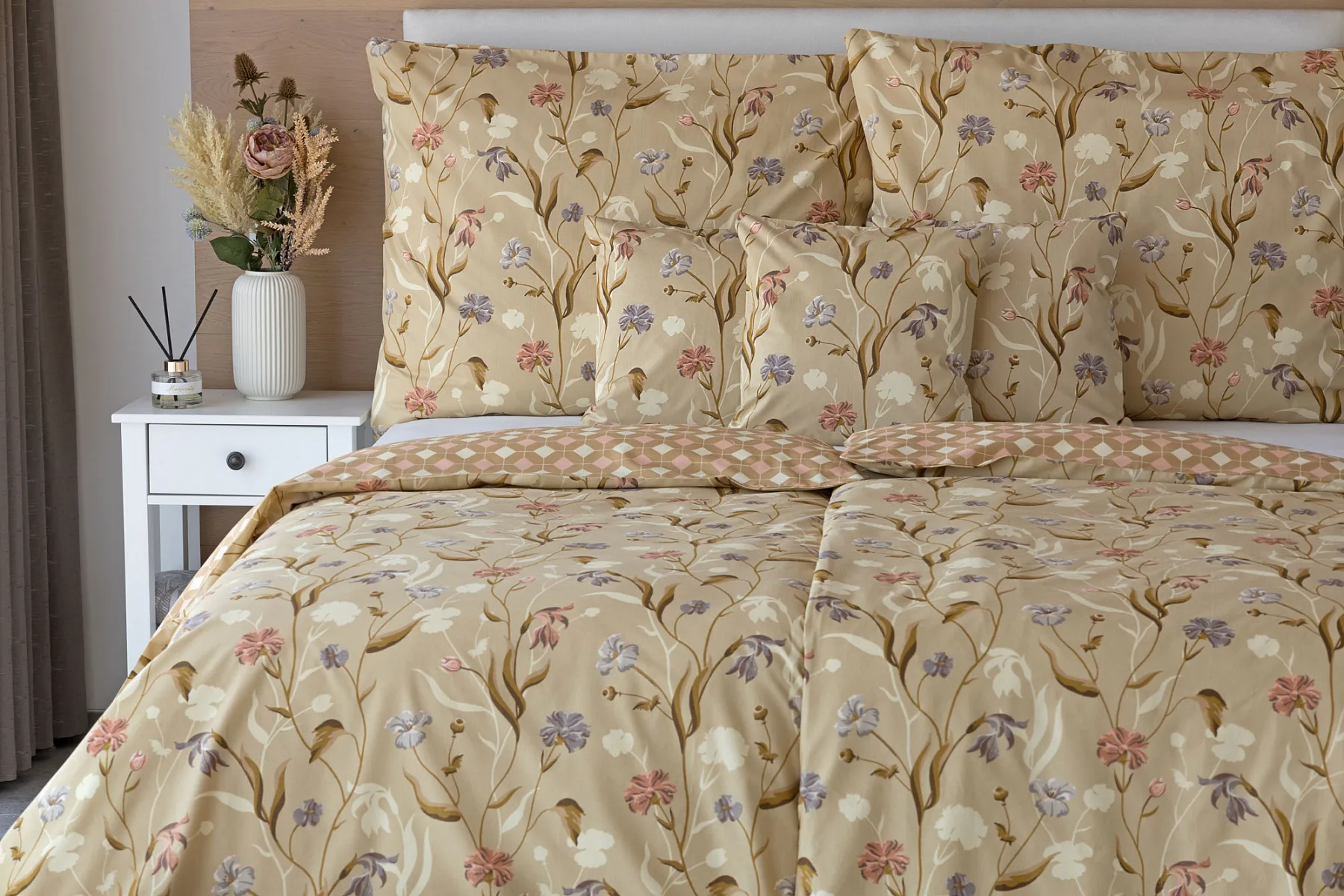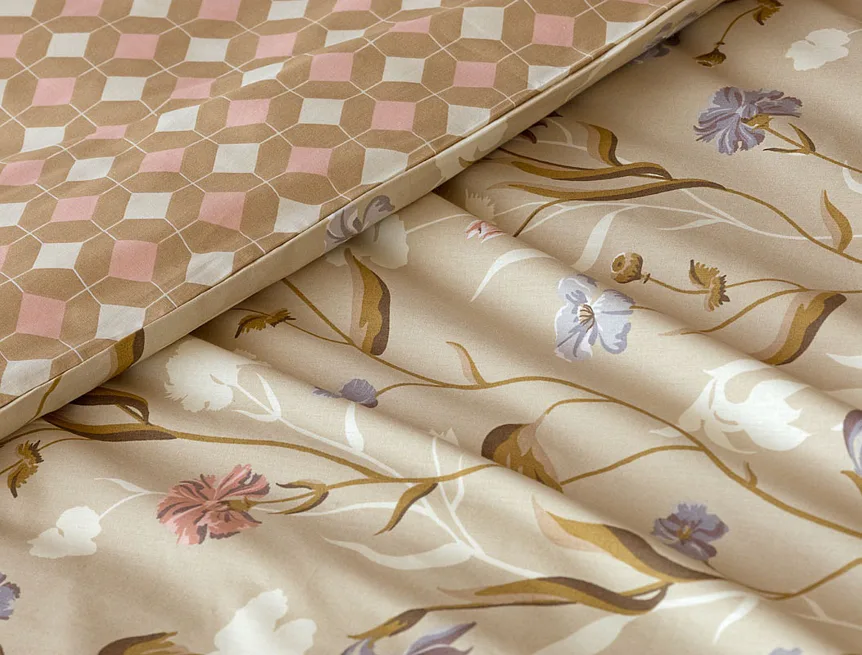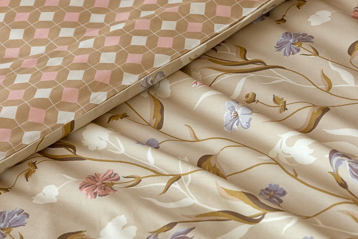 Bavlněné povlečení Joanna vás okouzlí hřejivými barvami a nápaditou kombinací vzorů. Květinový motiv z jedné strany tvoří drobné starorůžové a fialovo-modré kvítky na světle hnědém podkladu. Druhou stranu povlečení zdobí plošný geometrický vzor, takže při stlaní můžete hravě improvizovat.