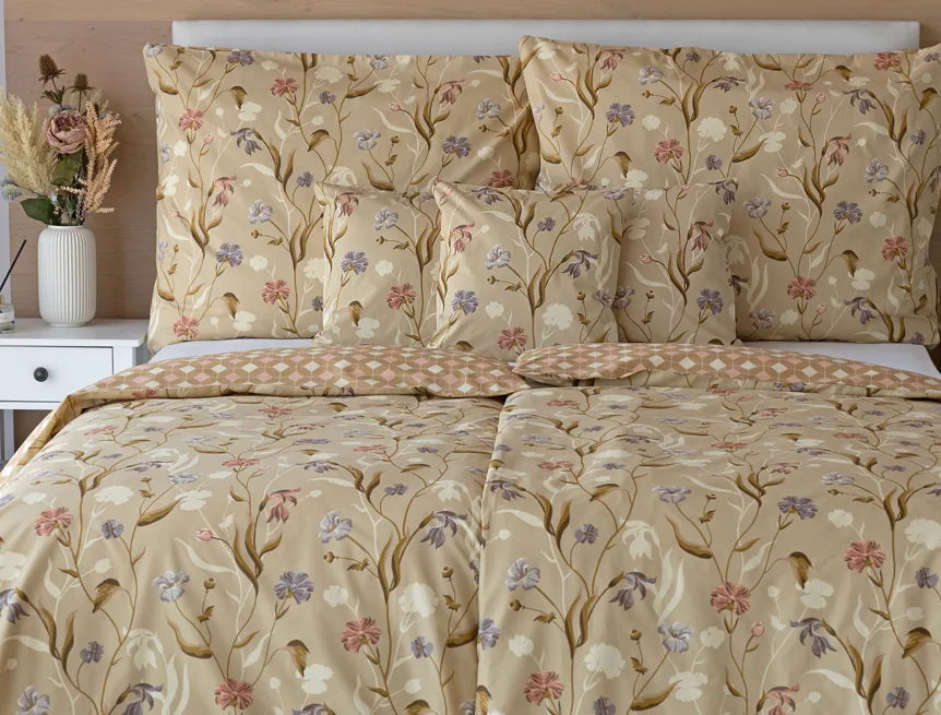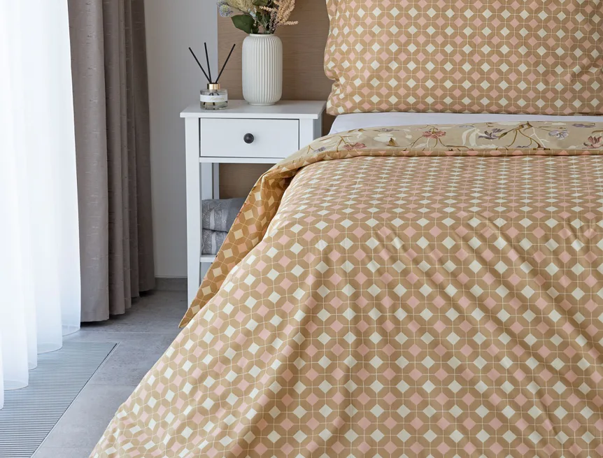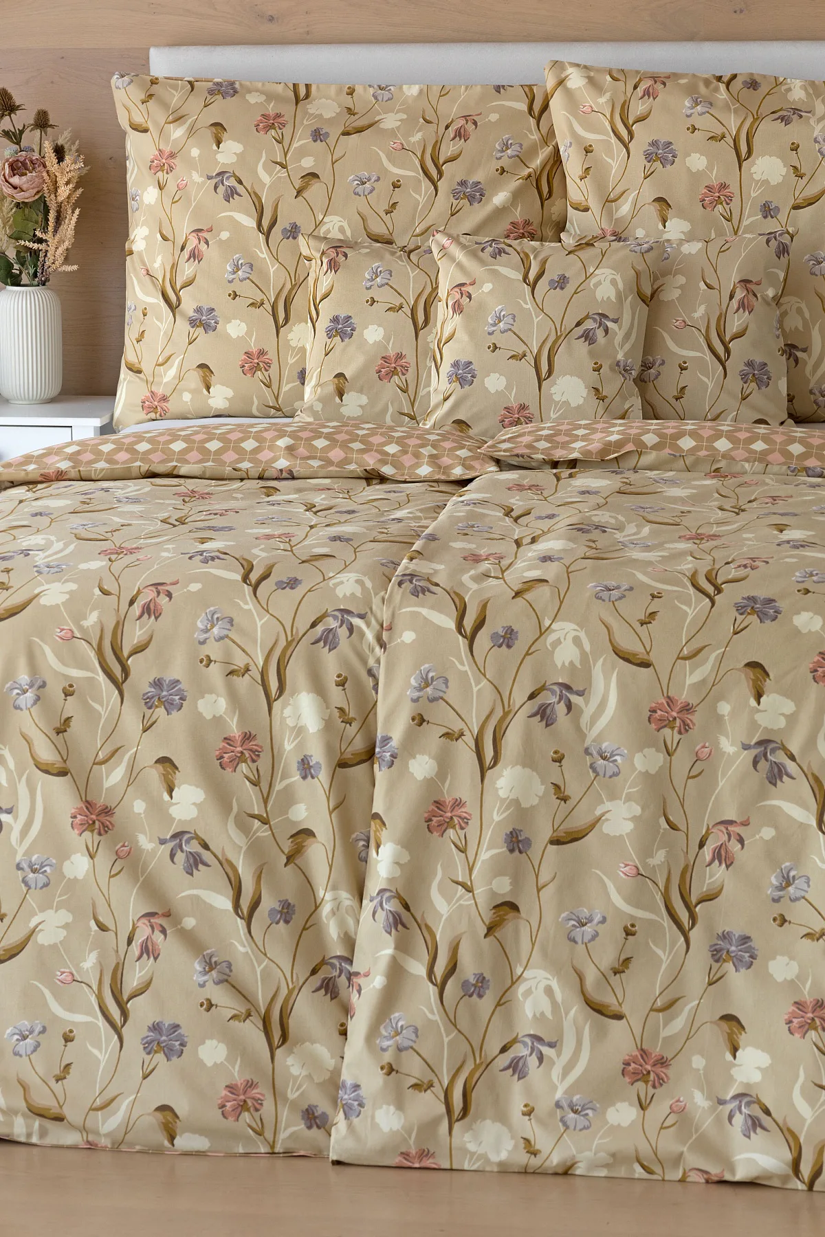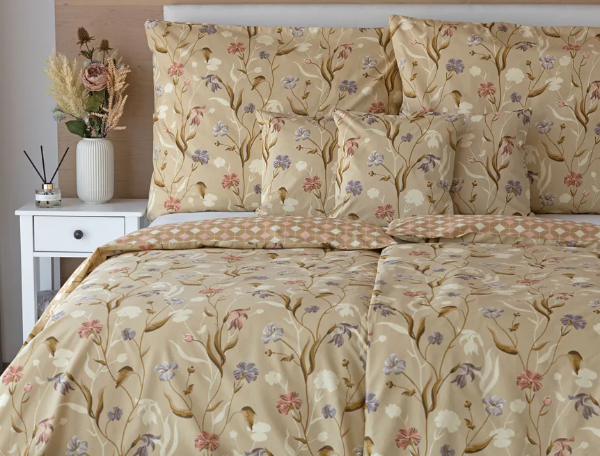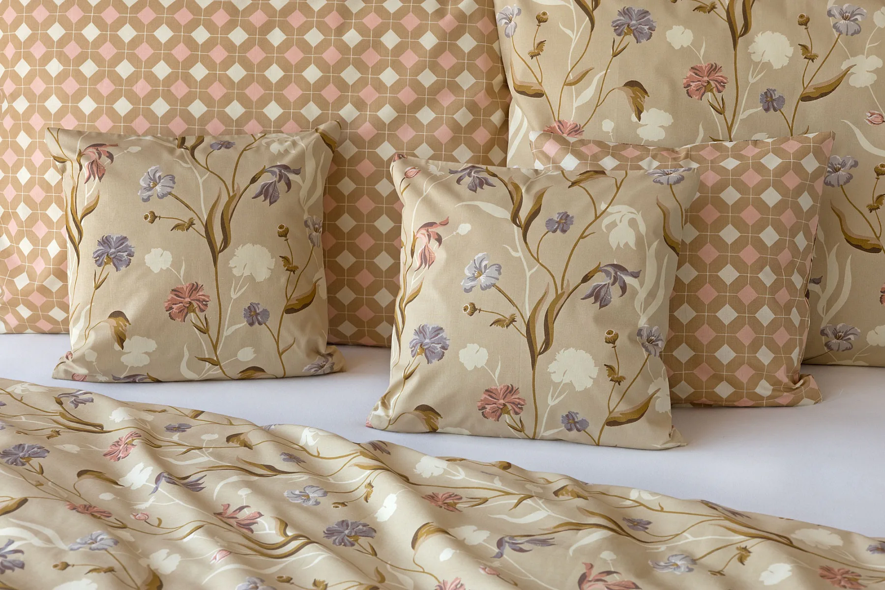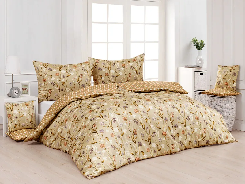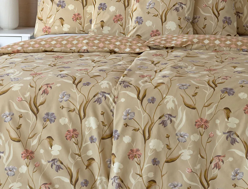 Bavlněné povlečení Joanna vás okouzlí hřejivými barvami a nápaditou kombinací vzorů. Květinový motiv z jedné strany tvoří drobné starorůžové a fialovo-modré kvítky na světle hnědém podkladu. Druhou stranu povlečení zdobí plošný geometrický vzor, takže při stlaní můžete hravě improvizovat.