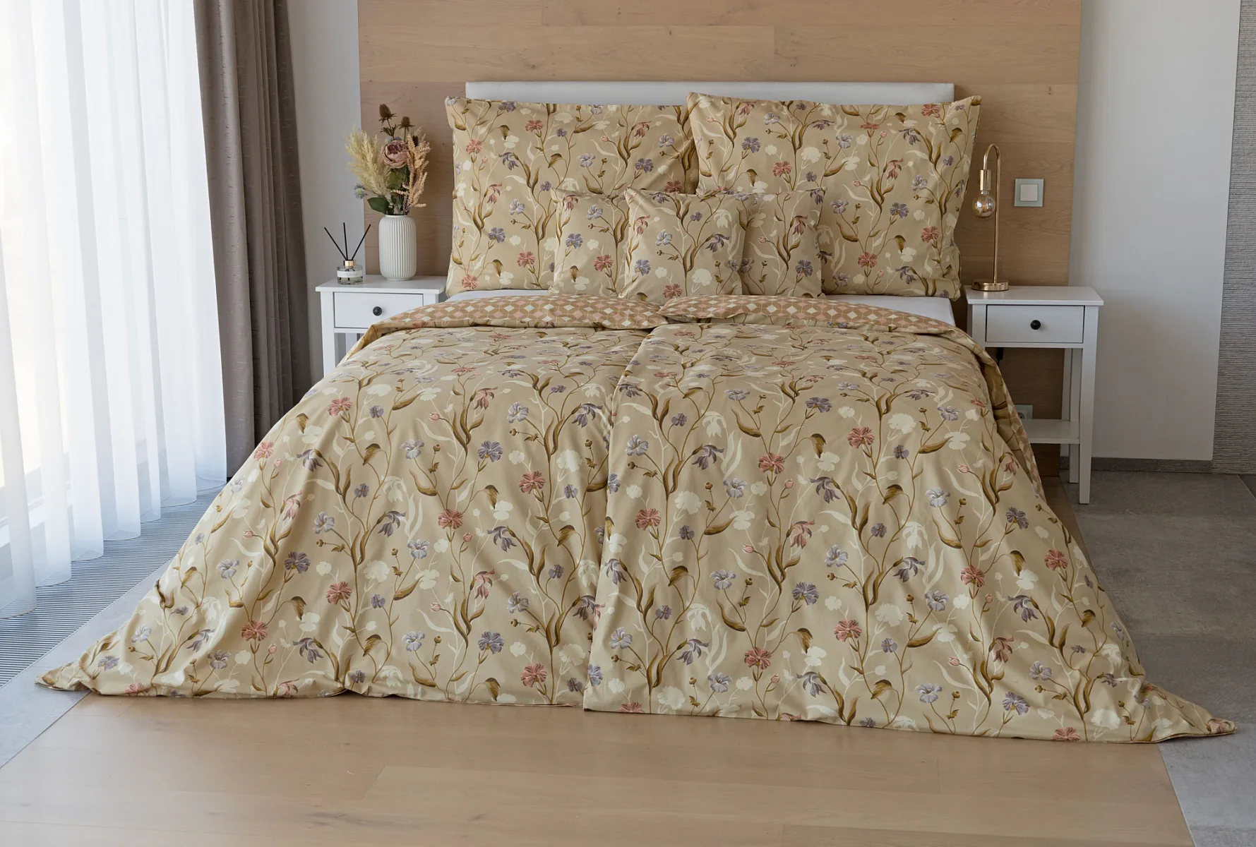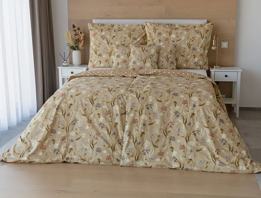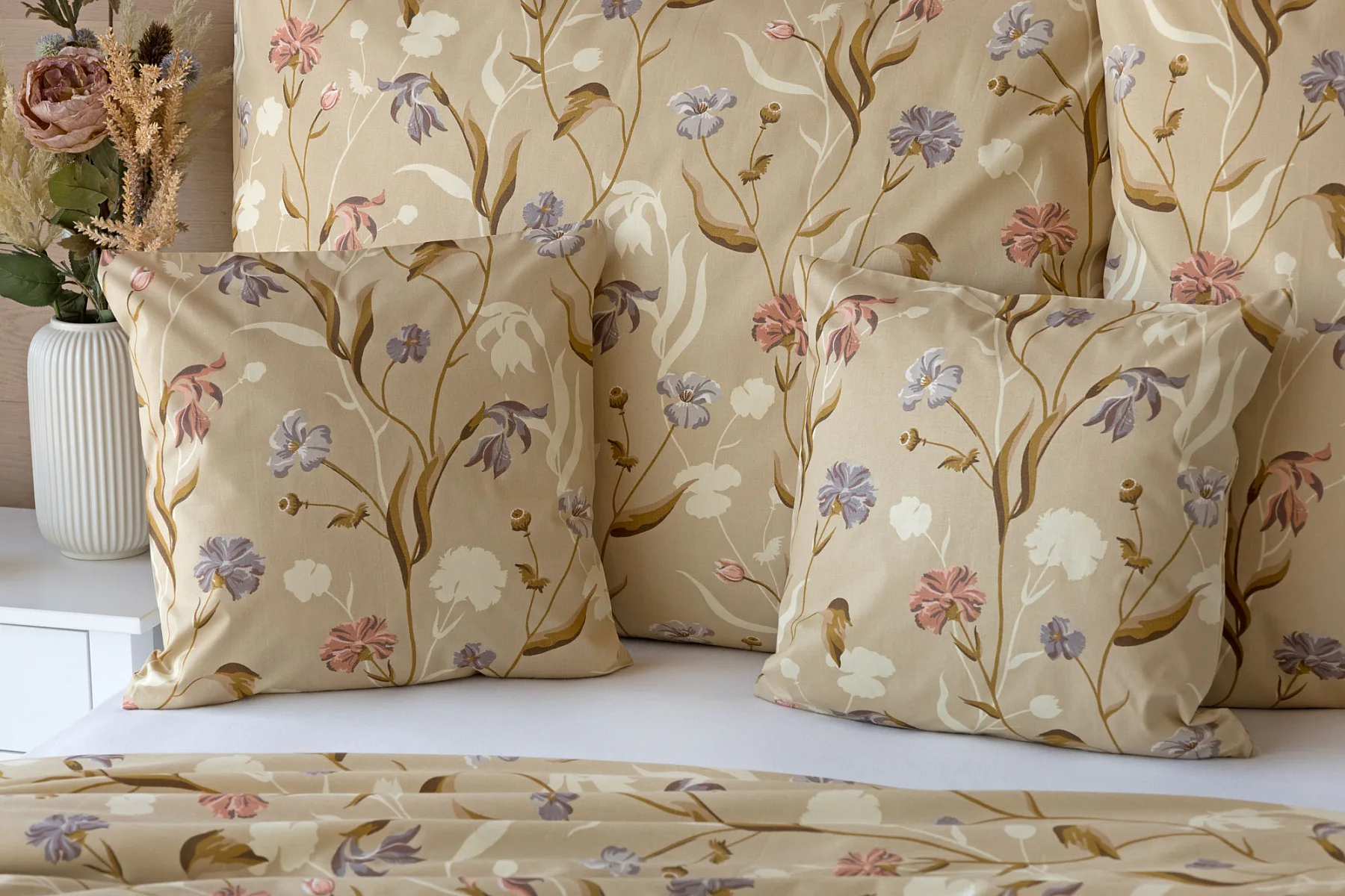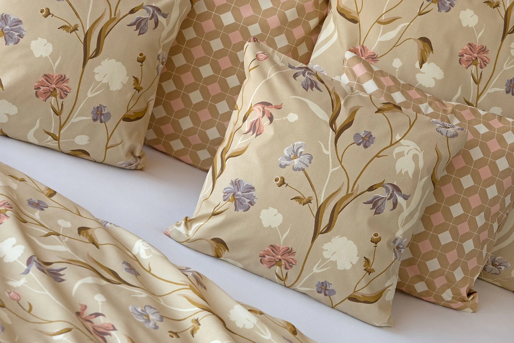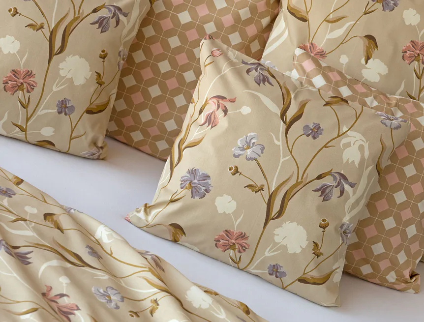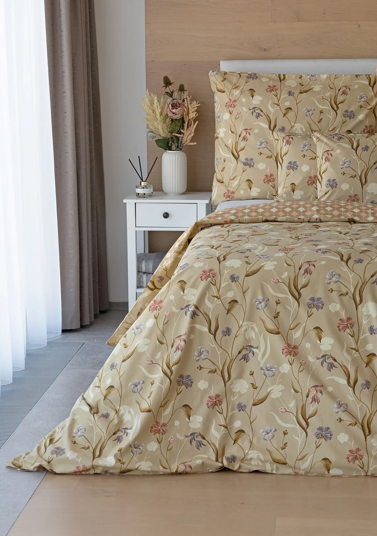 Bavlněné povlečení Joanna vás okouzlí hřejivými barvami a nápaditou kombinací vzorů. Květinový motiv z jedné strany tvoří drobné starorůžové a fialovo-modré kvítky na světle hnědém podkladu. Druhou stranu povlečení zdobí plošný geometrický vzor, takže při stlaní můžete hravě improvizovat.
