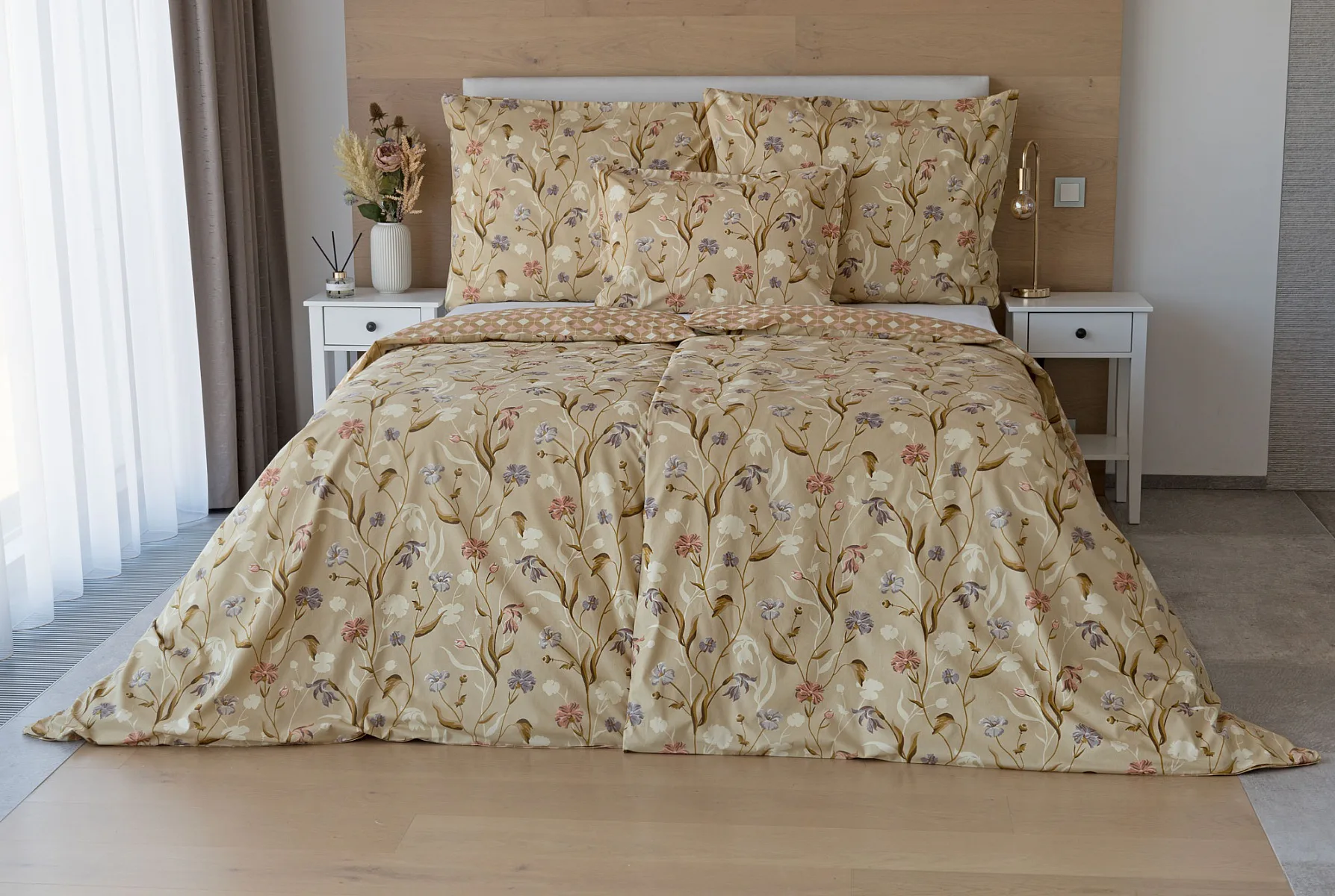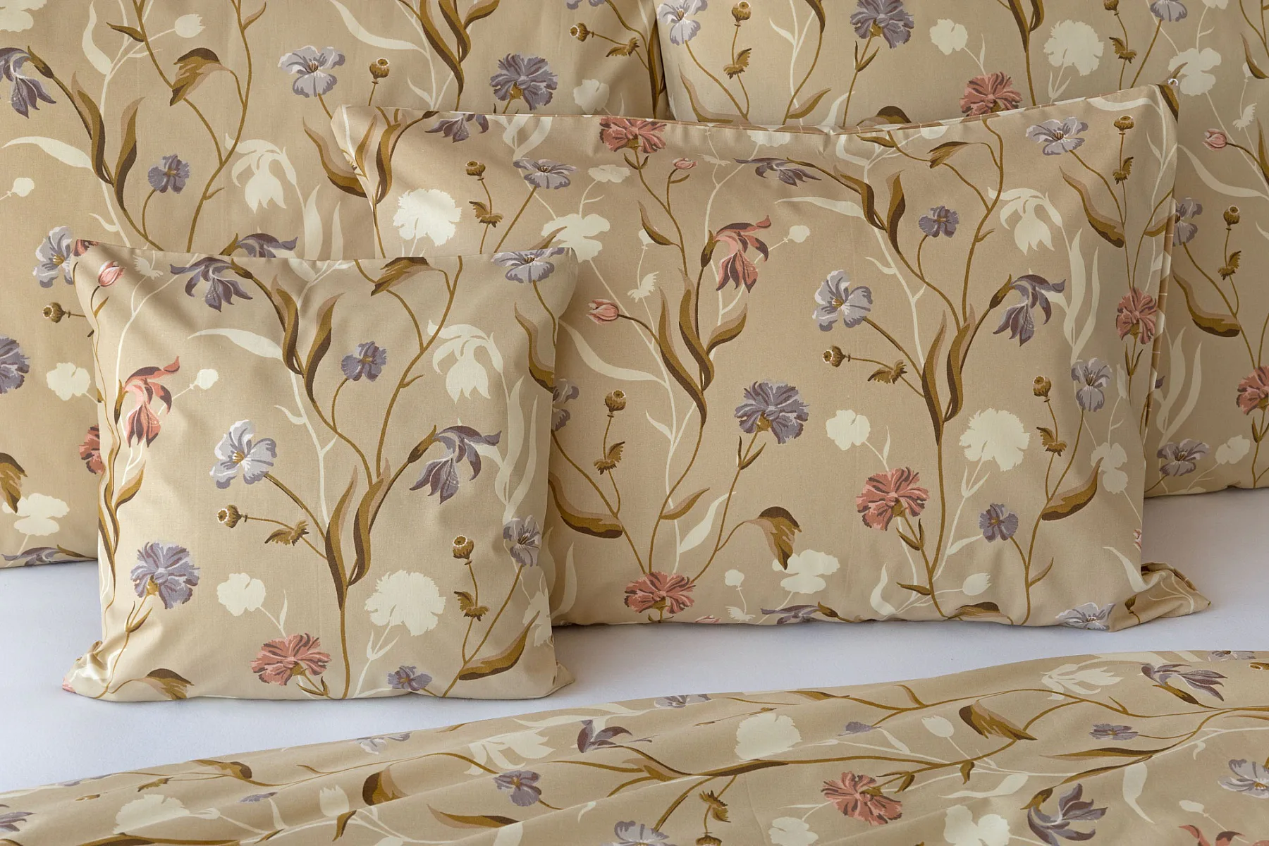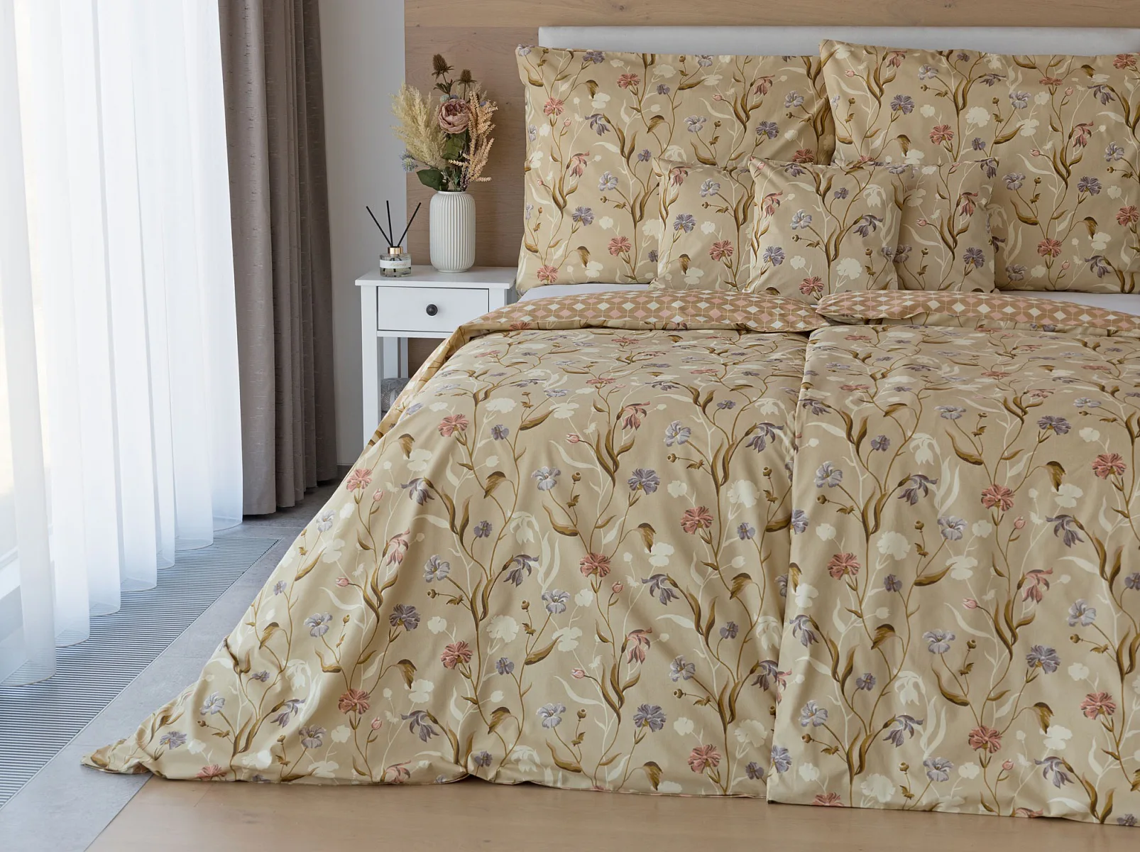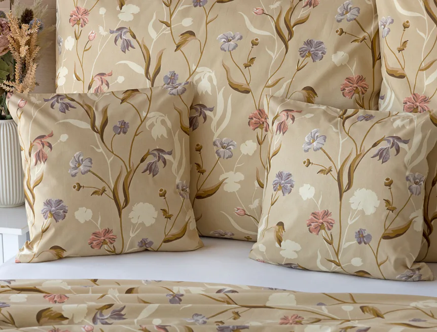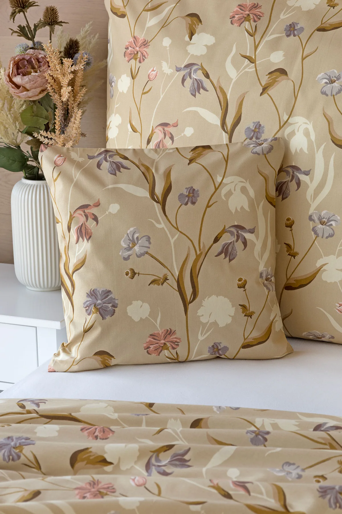 Bavlněné povlečení Joanna vás okouzlí hřejivými barvami a nápaditou kombinací vzorů. Květinový motiv z jedné strany tvoří drobné starorůžové a fialovo-modré kvítky na světle hnědém podkladu. Druhou stranu povlečení zdobí plošný geometrický vzor, takže při stlaní můžete hravě improvizovat.