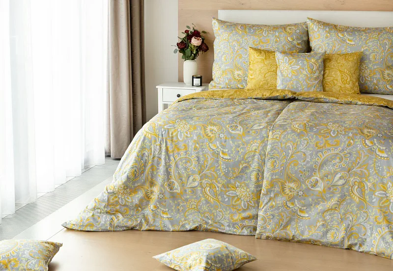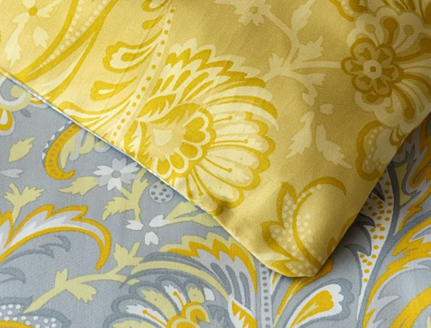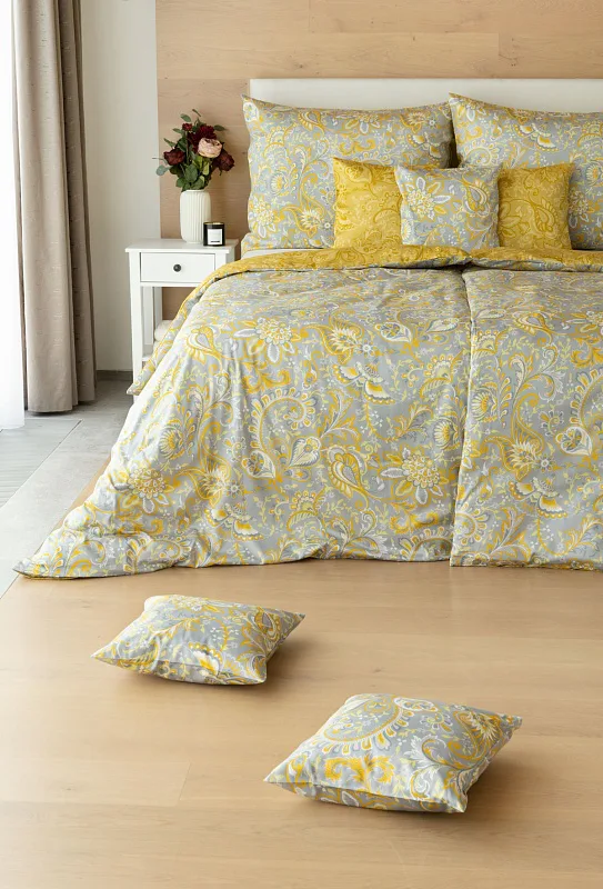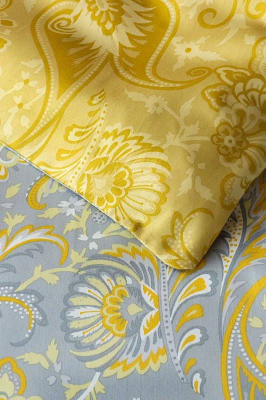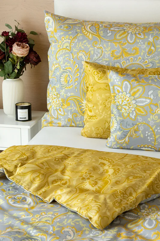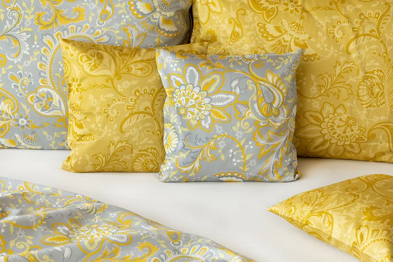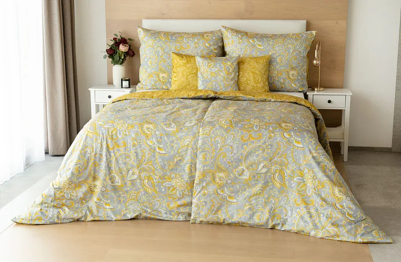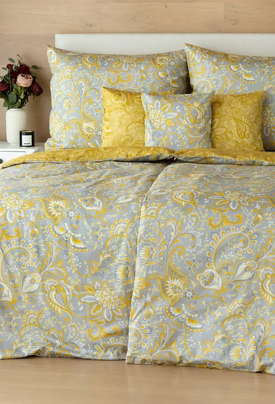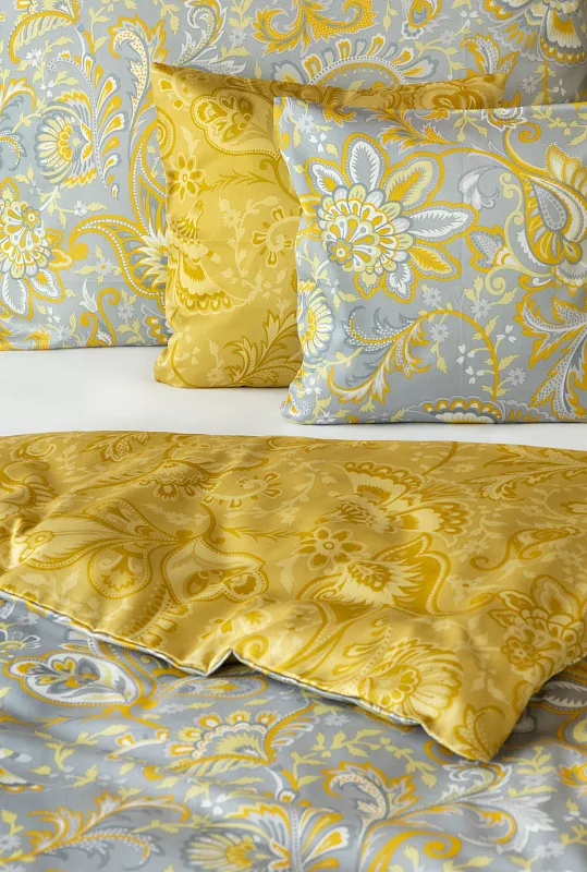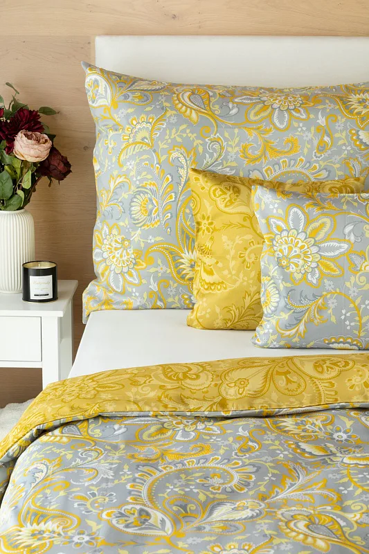 Romantický florální vzor na povlečení KASHMIR vynikne díky šarmantně sladěným tónům šedé a zlatavě okrové. Vrchní strana povlečení odpovídá fotografii, spodní kombinuje tmavší odstíny okrové.