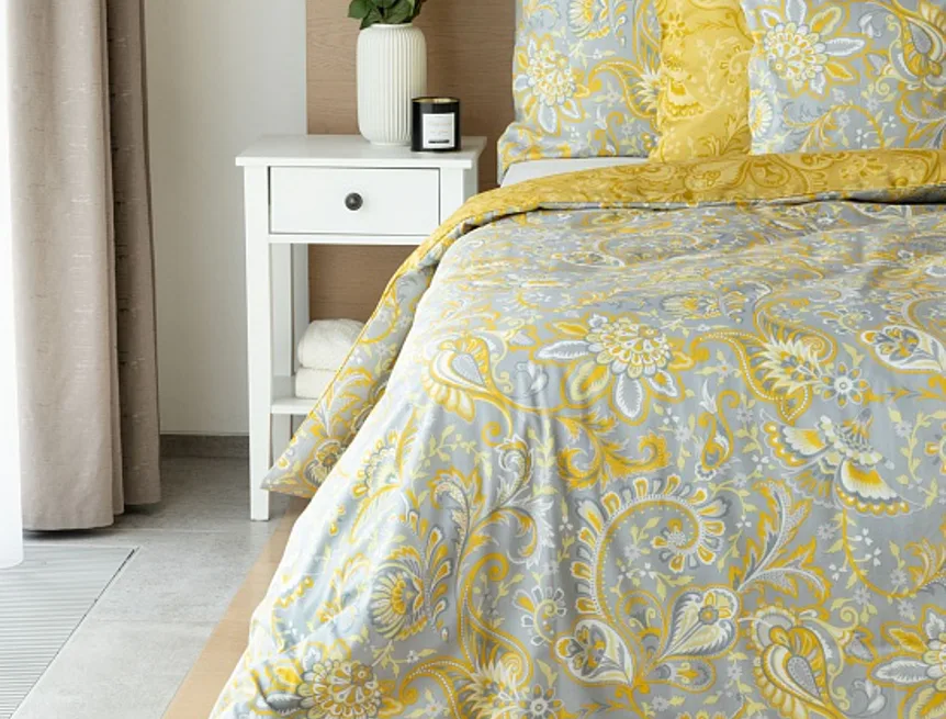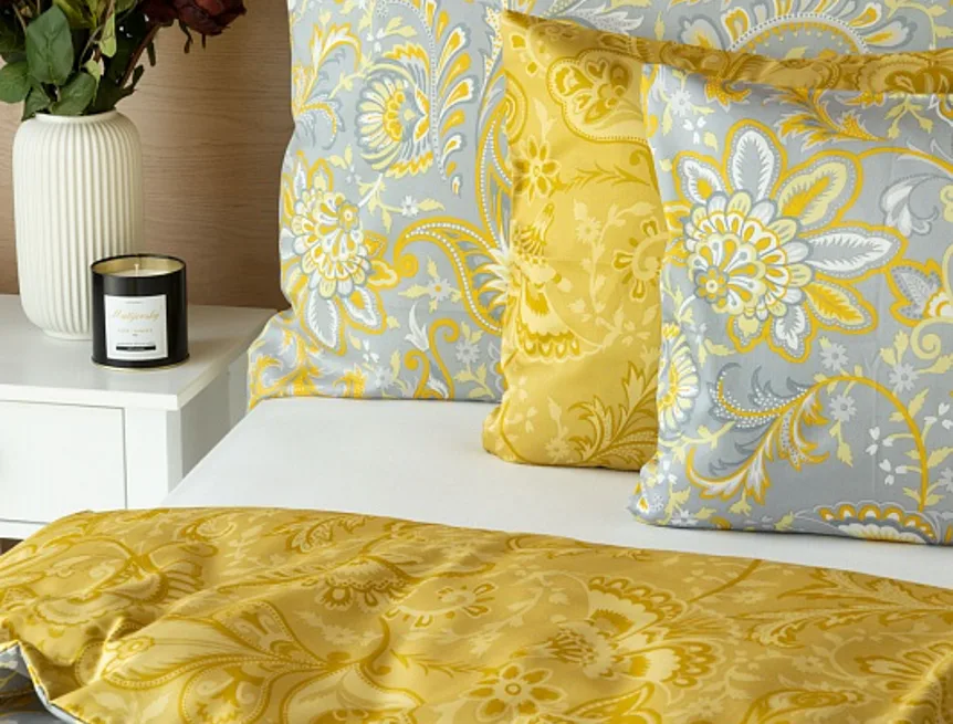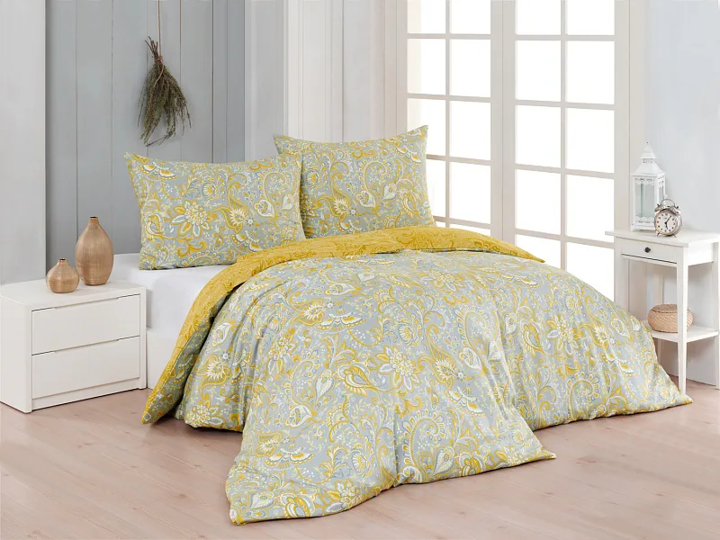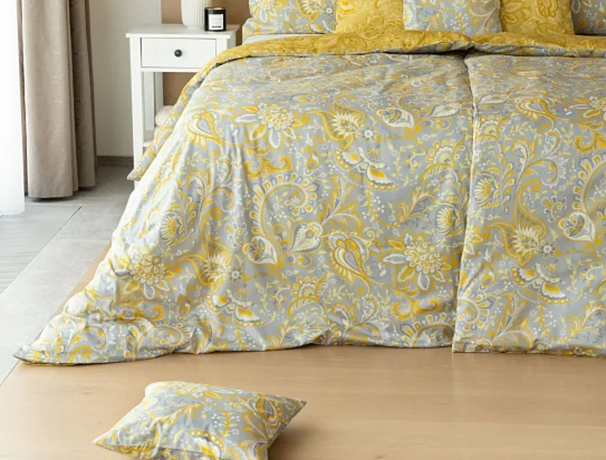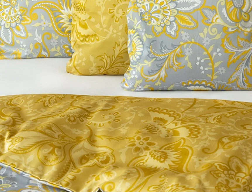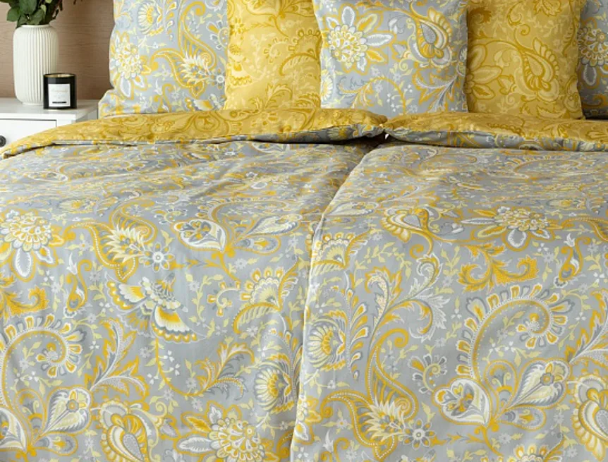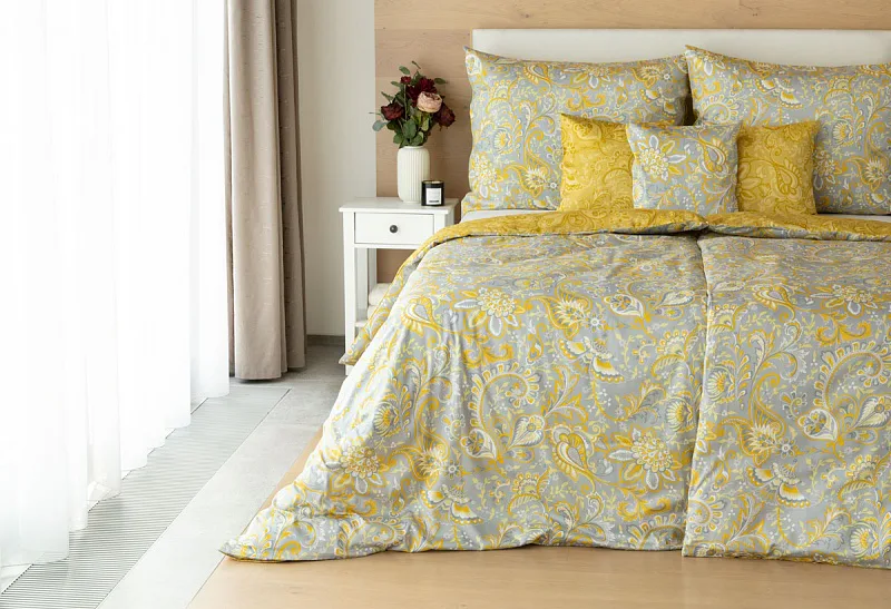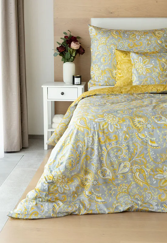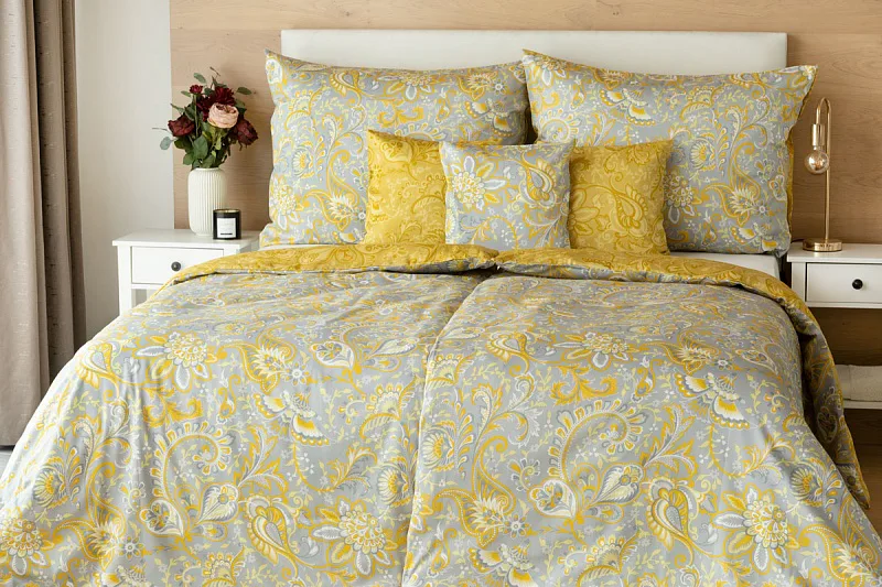 Romantický florální vzor na povlečení KASHMIR vynikne díky šarmantně sladěným tónům šedé a zlatavě okrové. Vrchní strana povlečení odpovídá fotografii, spodní kombinuje tmavší odstíny okrové.
