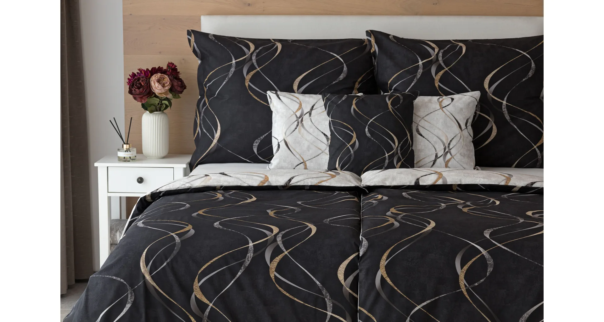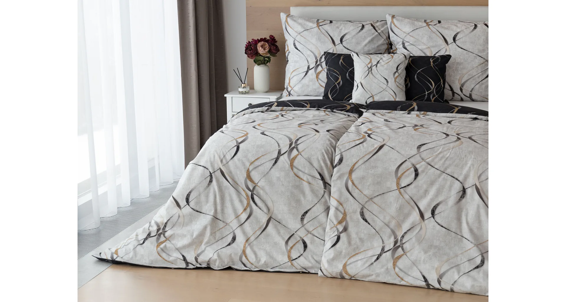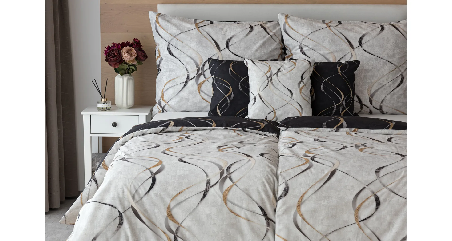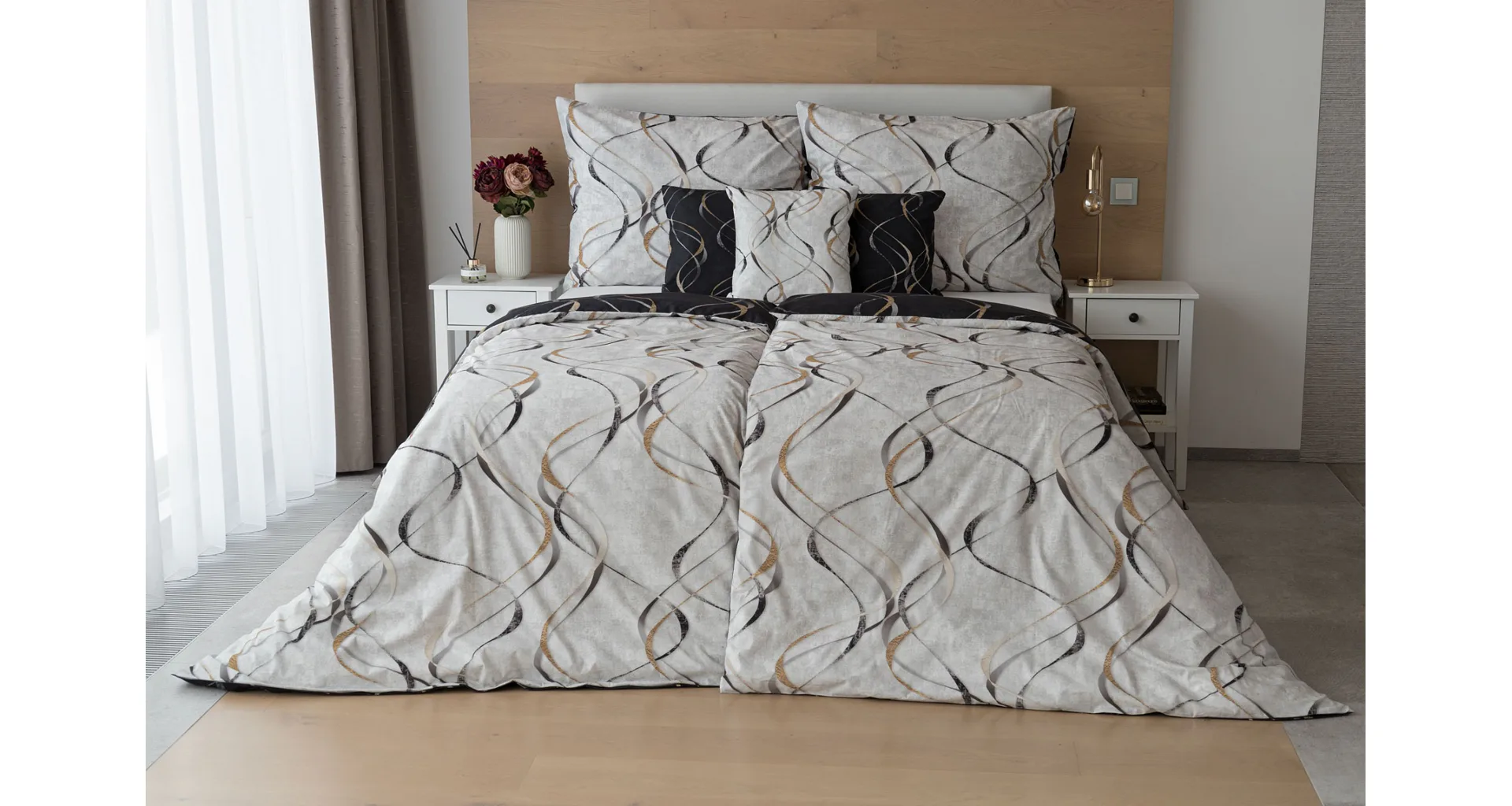 Vylaďte si ložnici podle nálady s elegantním bavlněným povlečením Kingston. Oblíbené oboustranné provedení vám umožní jednoduše změnit vzhled interiéru, aniž byste museli nutně převlékat. Jednoduchý motiv zvlněných šedozlatých linek se prolíná na černém a světle šedém podkladu. Originální vzhled vzoru podtrhuje tzv. Grunge textura, která vyniká díky preciznímu digitálnímu tisku.