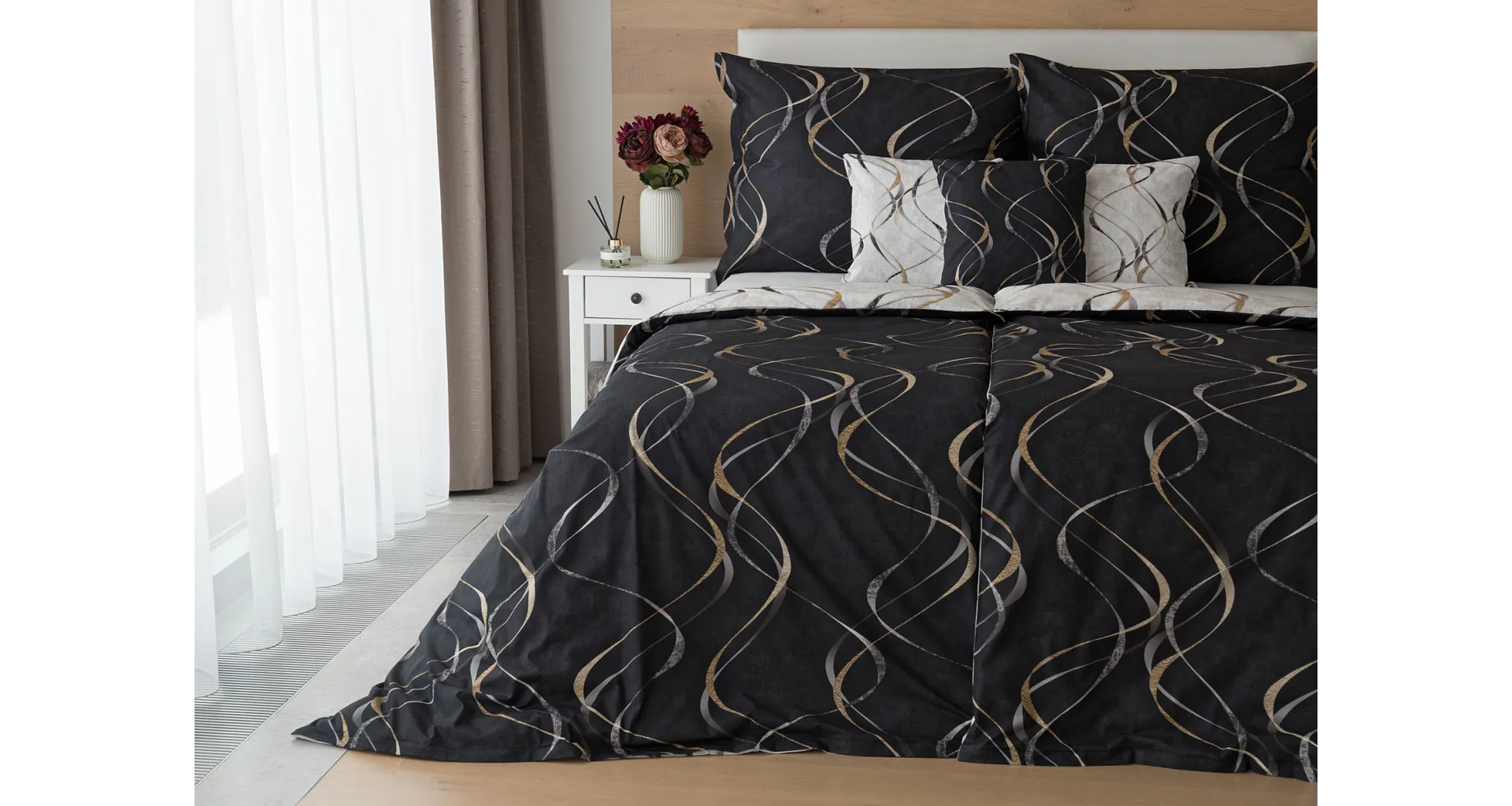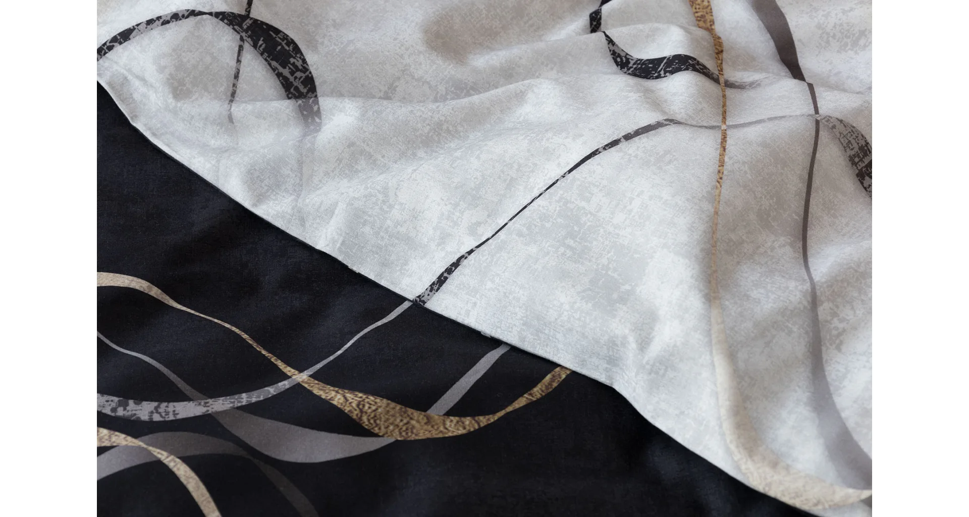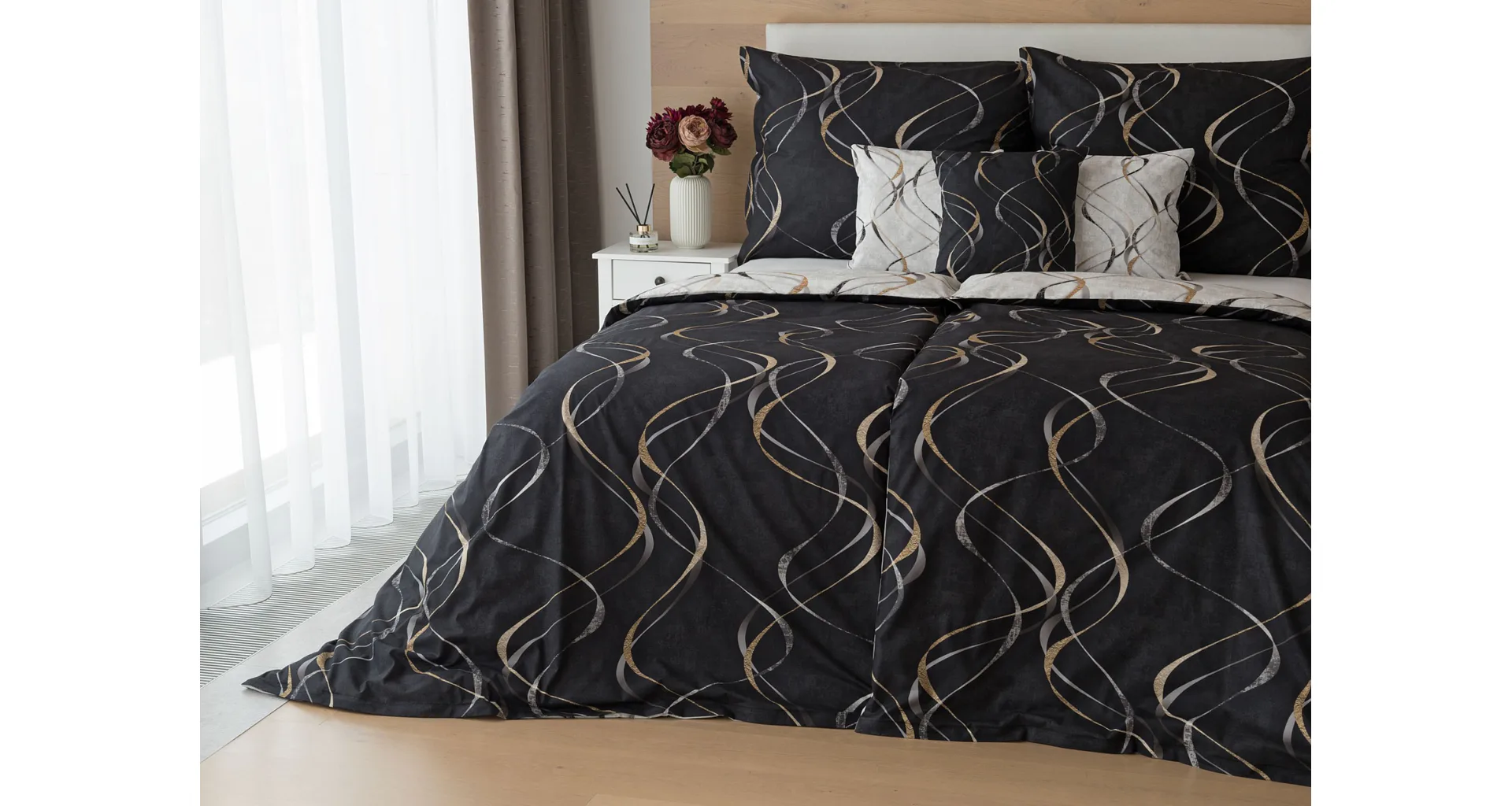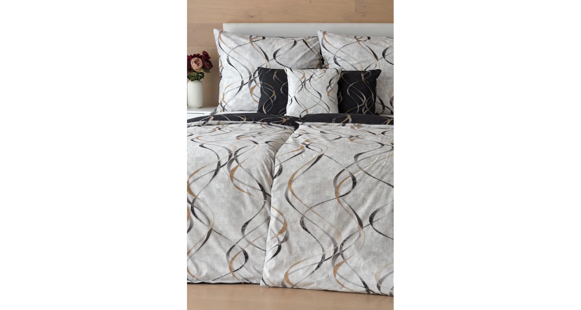 Vylaďte si ložnici podle nálady s elegantním bavlněným povlečením Kingston. Oblíbené oboustranné provedení vám umožní jednoduše změnit vzhled interiéru, aniž byste museli nutně převlékat. Jednoduchý motiv zvlněných šedozlatých linek se prolíná na černém a světle šedém podkladu. Originální vzhled vzoru podtrhuje tzv. Grunge textura, která vyniká díky preciznímu digitálnímu tisku.