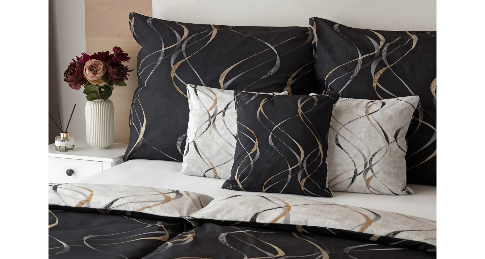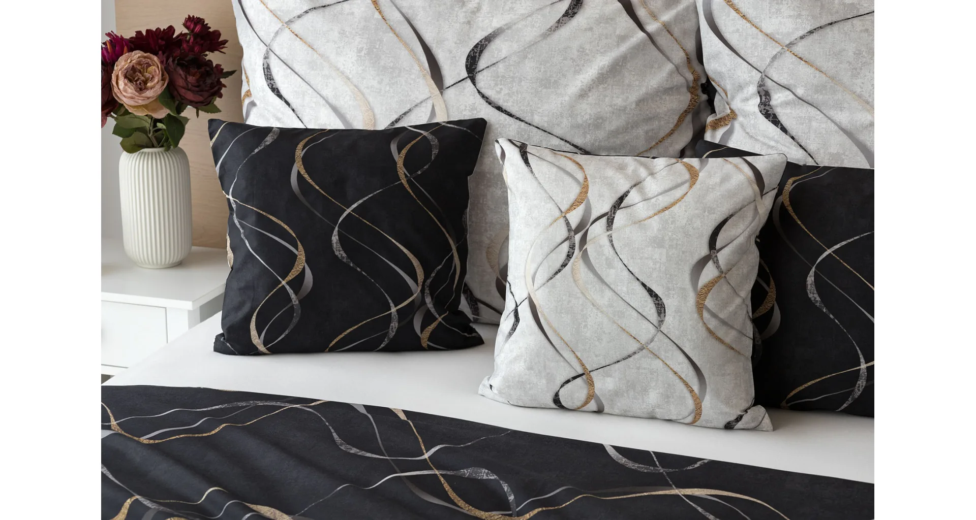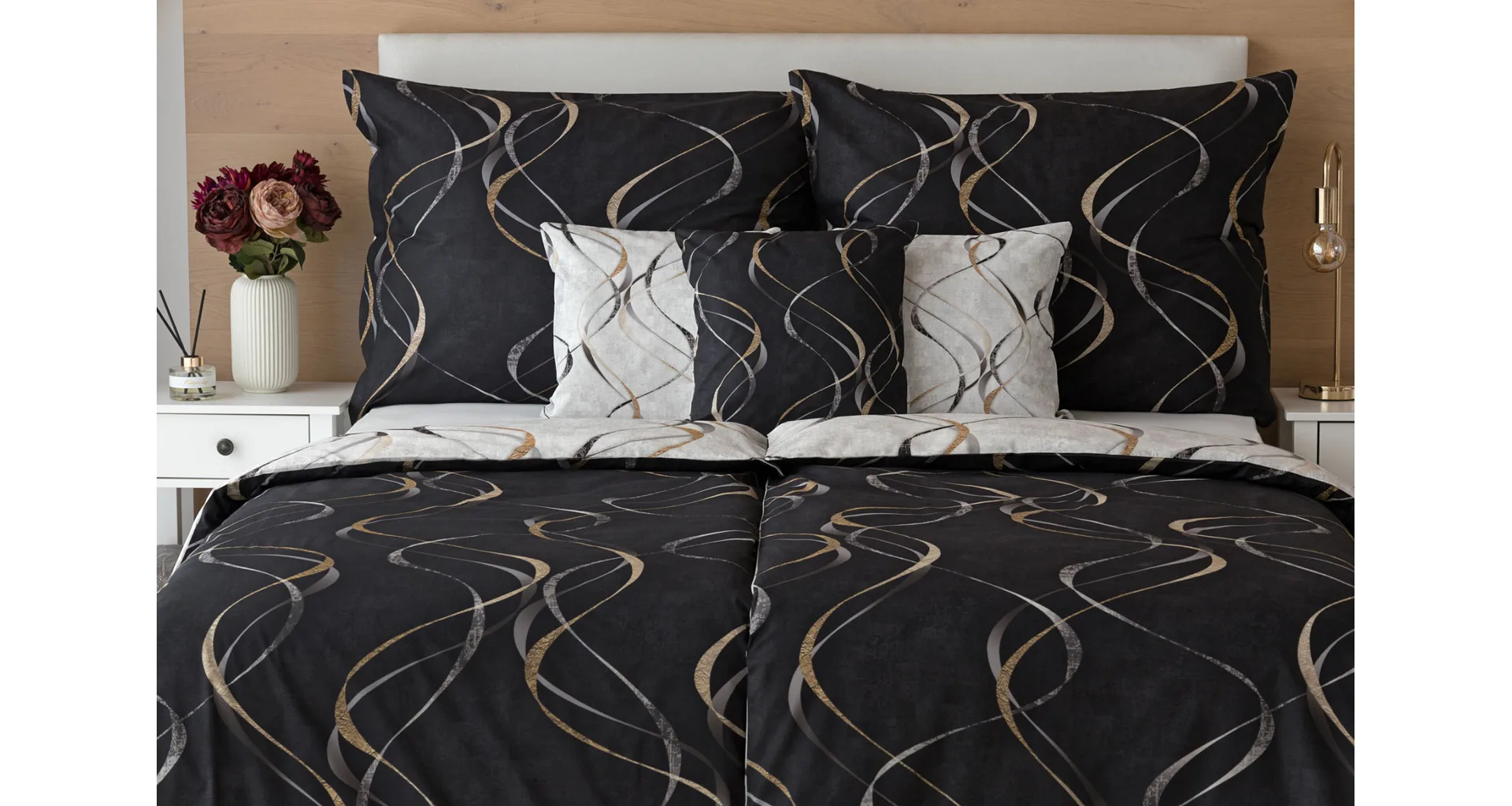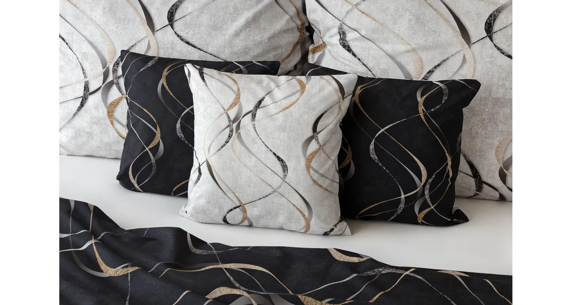 Vylaďte si ložnici podle nálady s elegantním bavlněným povlečením Kingston. Oblíbené oboustranné provedení vám umožní jednoduše změnit vzhled interiéru, aniž byste museli nutně převlékat. Jednoduchý motiv zvlněných šedozlatých linek se prolíná na černém a světle šedém podkladu. Originální vzhled vzoru podtrhuje tzv. Grunge textura, která vyniká díky preciznímu digitálnímu tisku.