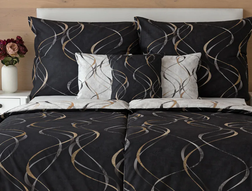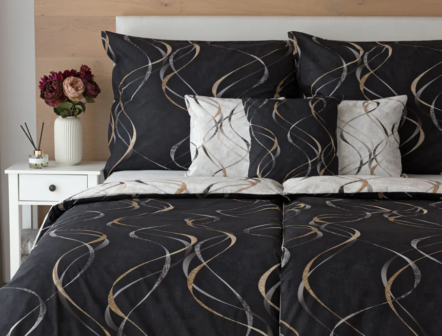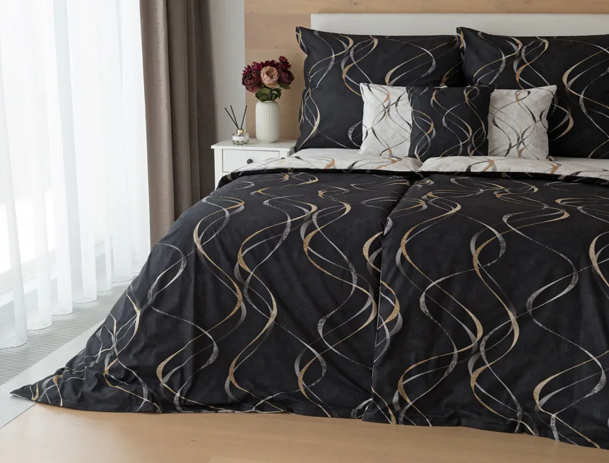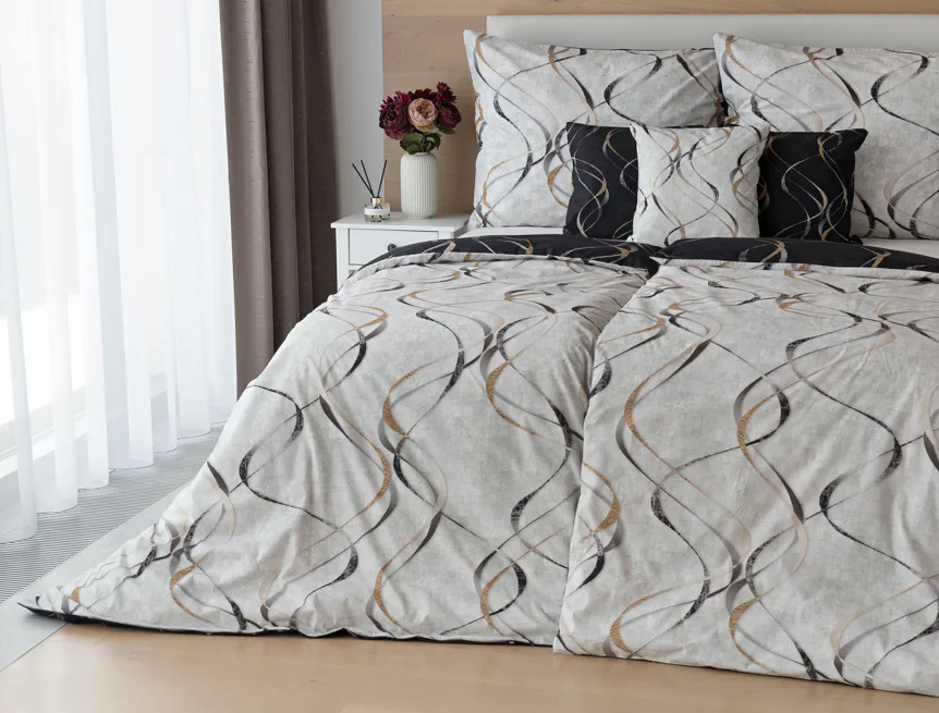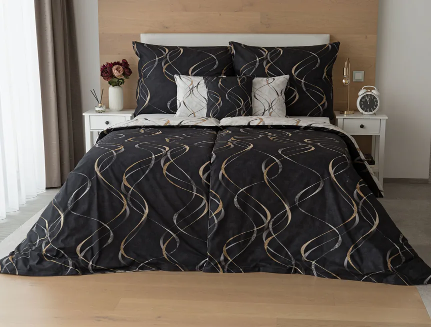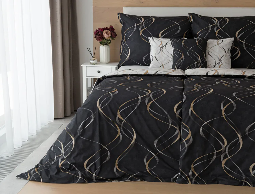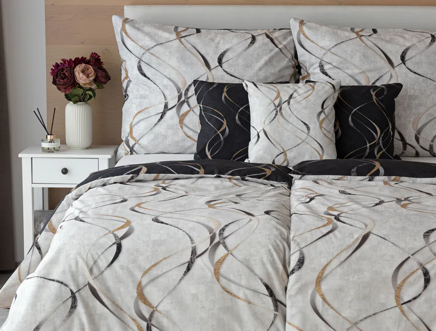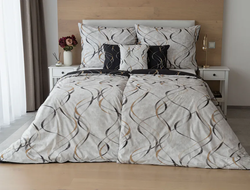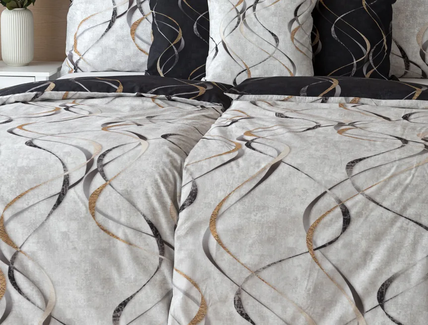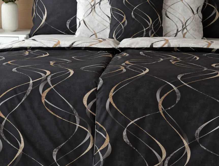 Vylaďte si ložnici podle nálady s elegantním bavlněným povlečením Kingston. Oblíbené oboustranné provedení vám umožní jednoduše změnit vzhled interiéru, aniž byste museli nutně převlékat. Jednoduchý motiv zvlněných šedozlatých linek se prolíná na černém a světle šedém podkladu. Originální vzhled vzoru podtrhuje tzv. Grunge textura, která vyniká díky preciznímu digitálnímu tisku.