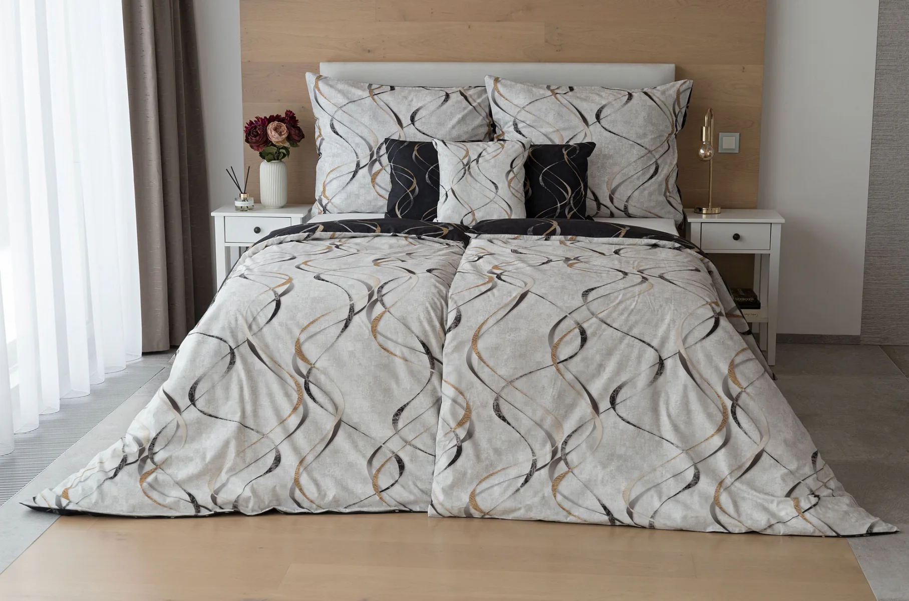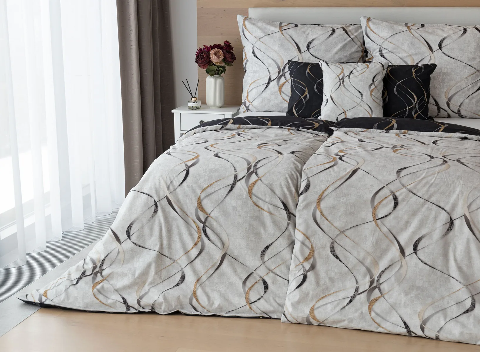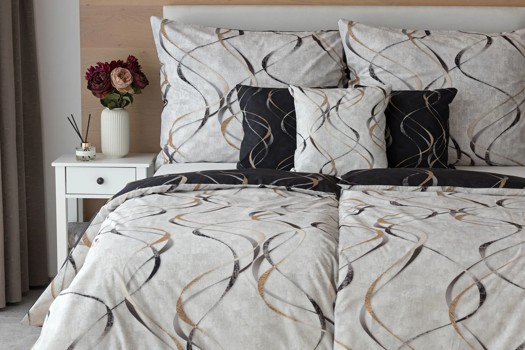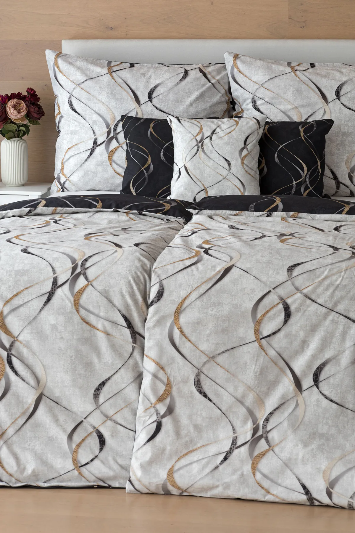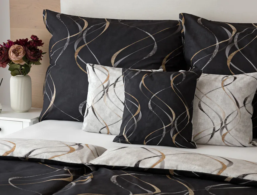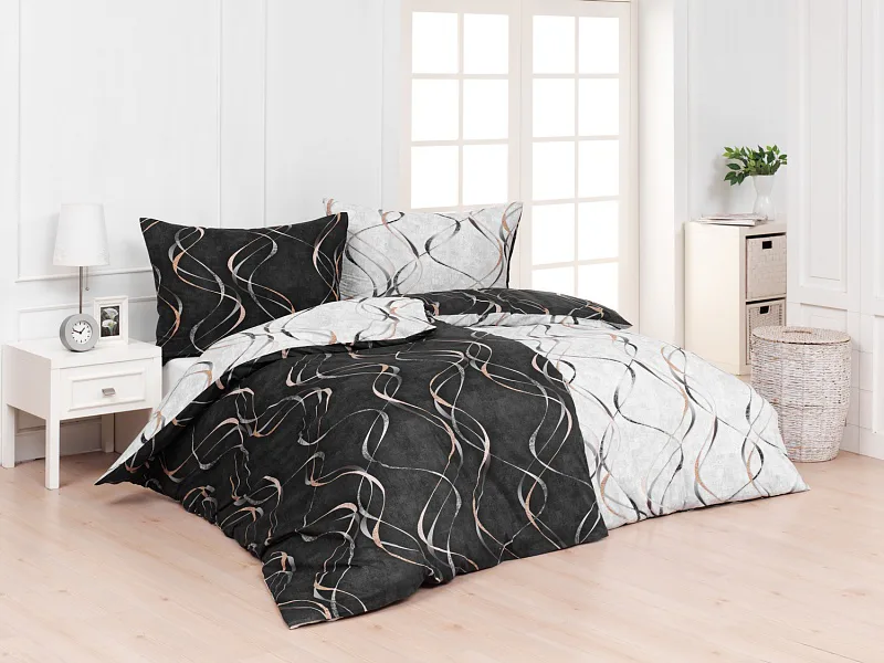 Vylaďte si ložnici podle nálady s elegantním bavlněným povlečením Kingston. Oblíbené oboustranné provedení vám umožní jednoduše změnit vzhled interiéru, aniž byste museli nutně převlékat. Jednoduchý motiv zvlněných šedozlatých linek se prolíná na černém a světle šedém podkladu. Originální vzhled vzoru podtrhuje tzv. Grunge textura, která vyniká díky preciznímu digitálnímu tisku.