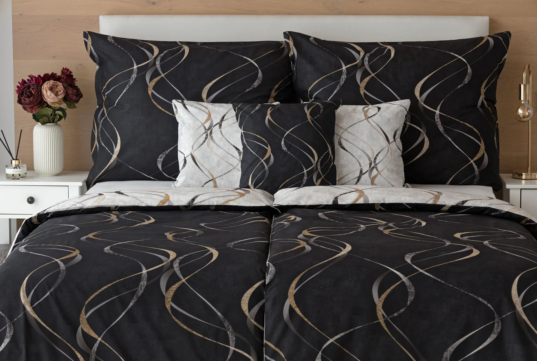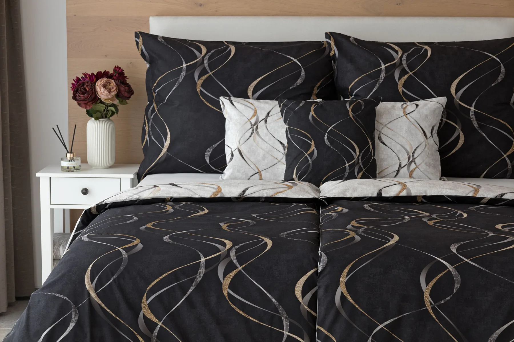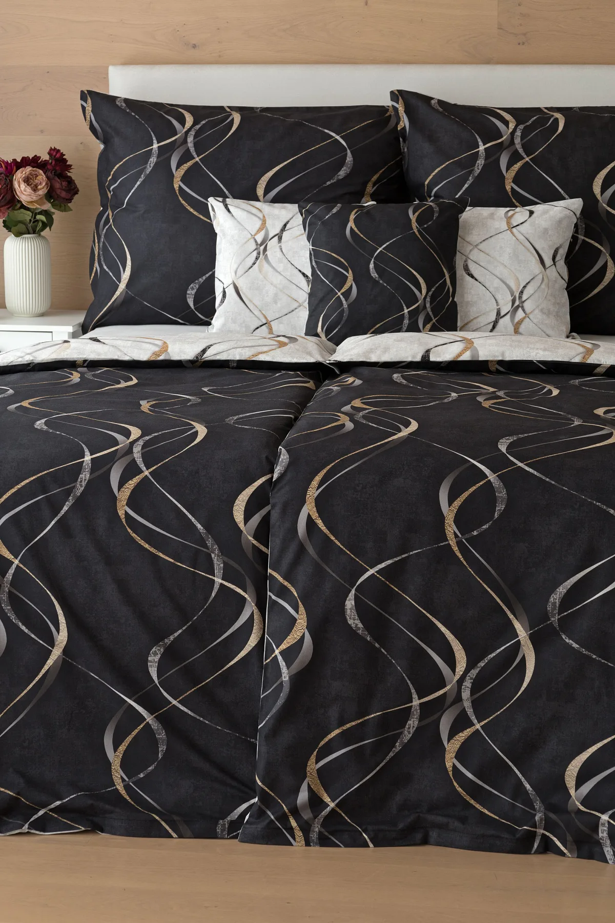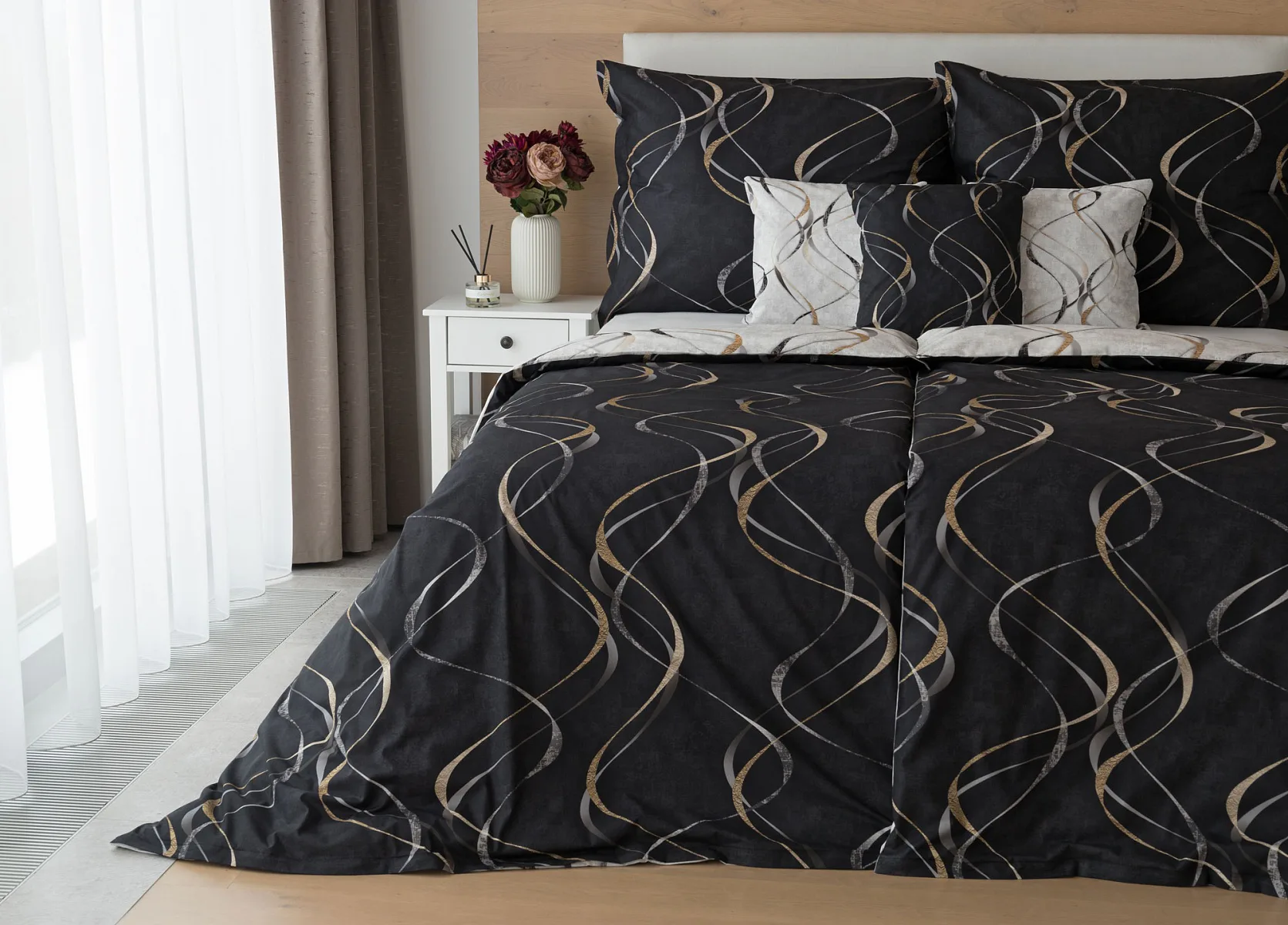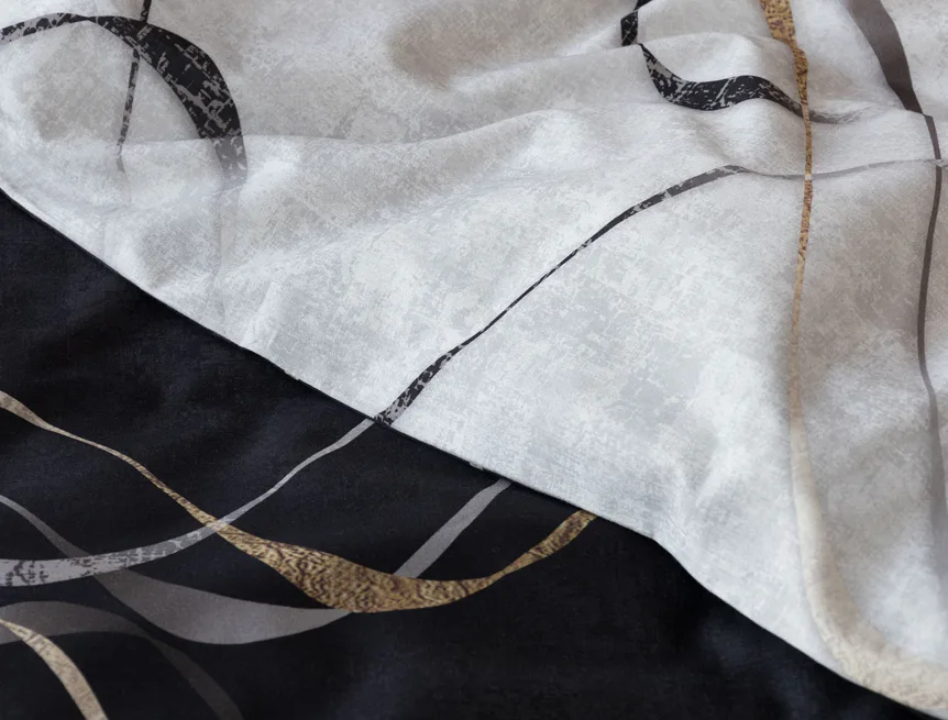Vylaďte si ložnici podle nálady s elegantním bavlněným povlečením Kingston. Oblíbené oboustranné provedení vám umožní jednoduše změnit vzhled interiéru, aniž byste museli nutně převlékat. Jednoduchý motiv zvlněných šedozlatých linek se prolíná na černém a světle šedém podkladu. Originální vzhled vzoru podtrhuje tzv. Grunge textura, která vyniká díky preciznímu digitálnímu tisku.