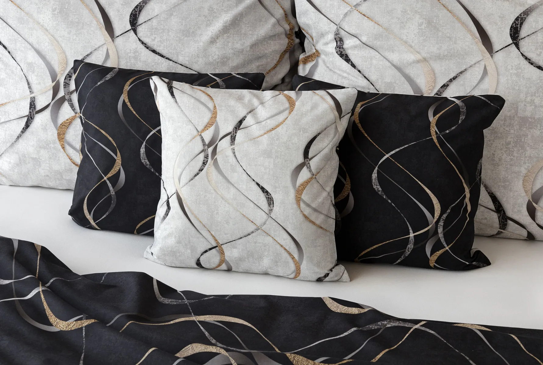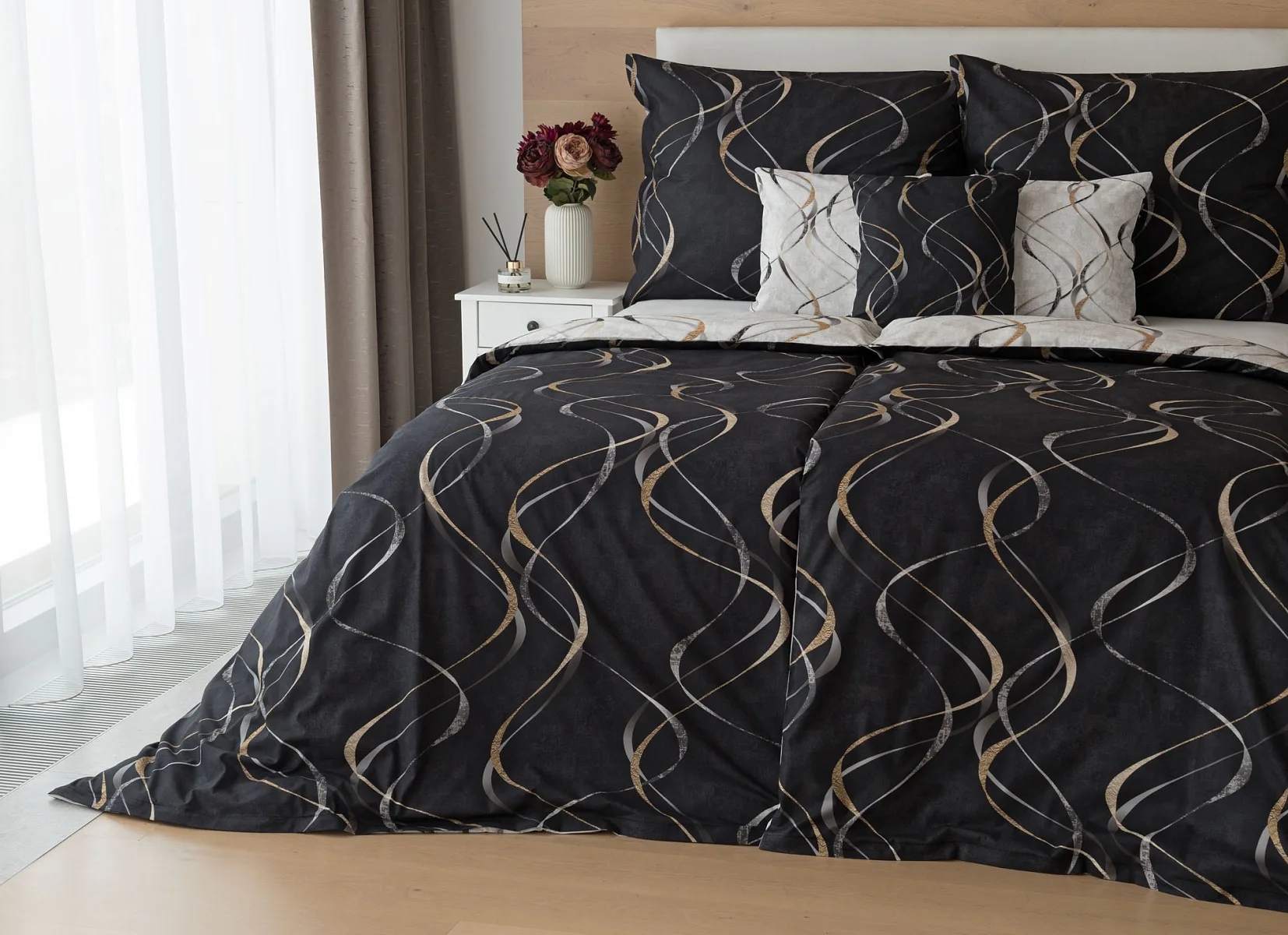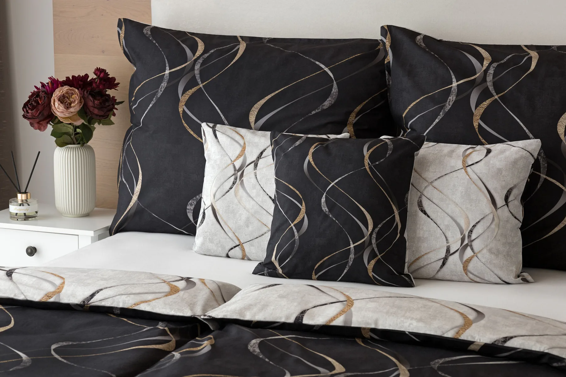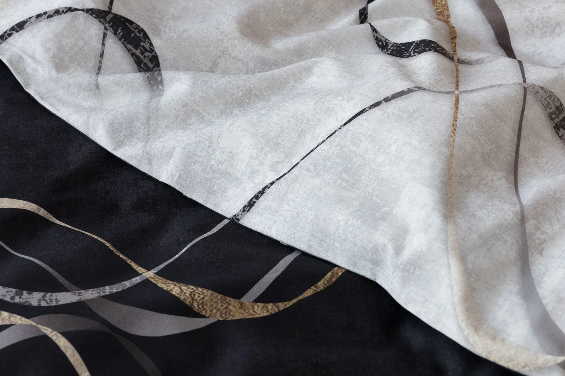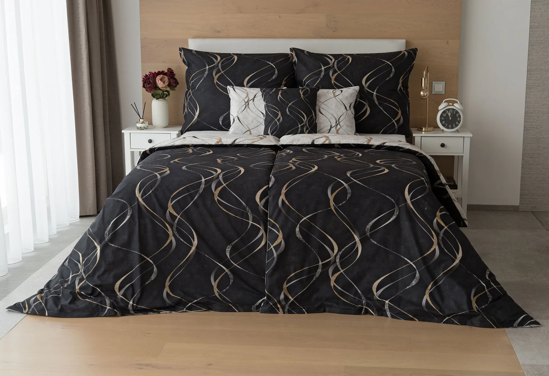 Vylaďte si ložnici podle nálady s elegantním bavlněným povlečením Kingston. Oblíbené oboustranné provedení vám umožní jednoduše změnit vzhled interiéru, aniž byste museli nutně převlékat. Jednoduchý motiv zvlněných šedozlatých linek se prolíná na černém a světle šedém podkladu. Originální vzhled vzoru podtrhuje tzv. Grunge textura, která vyniká díky preciznímu digitálnímu tisku.