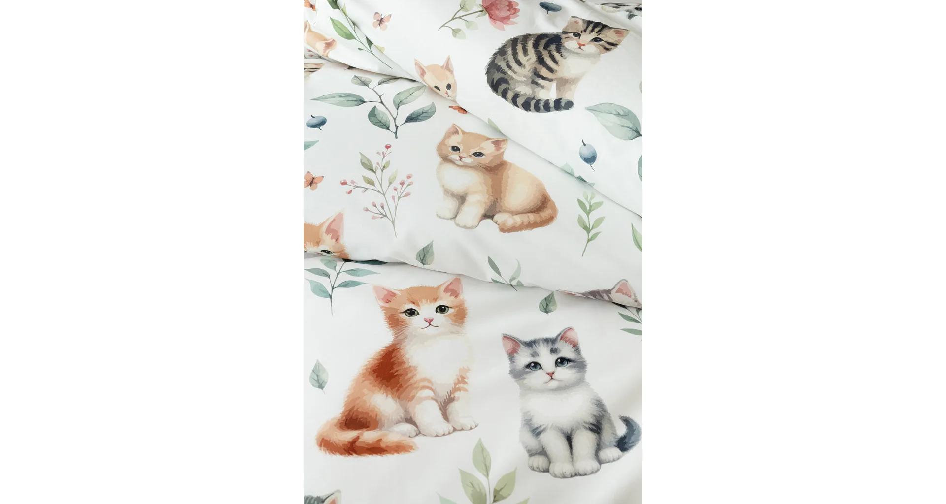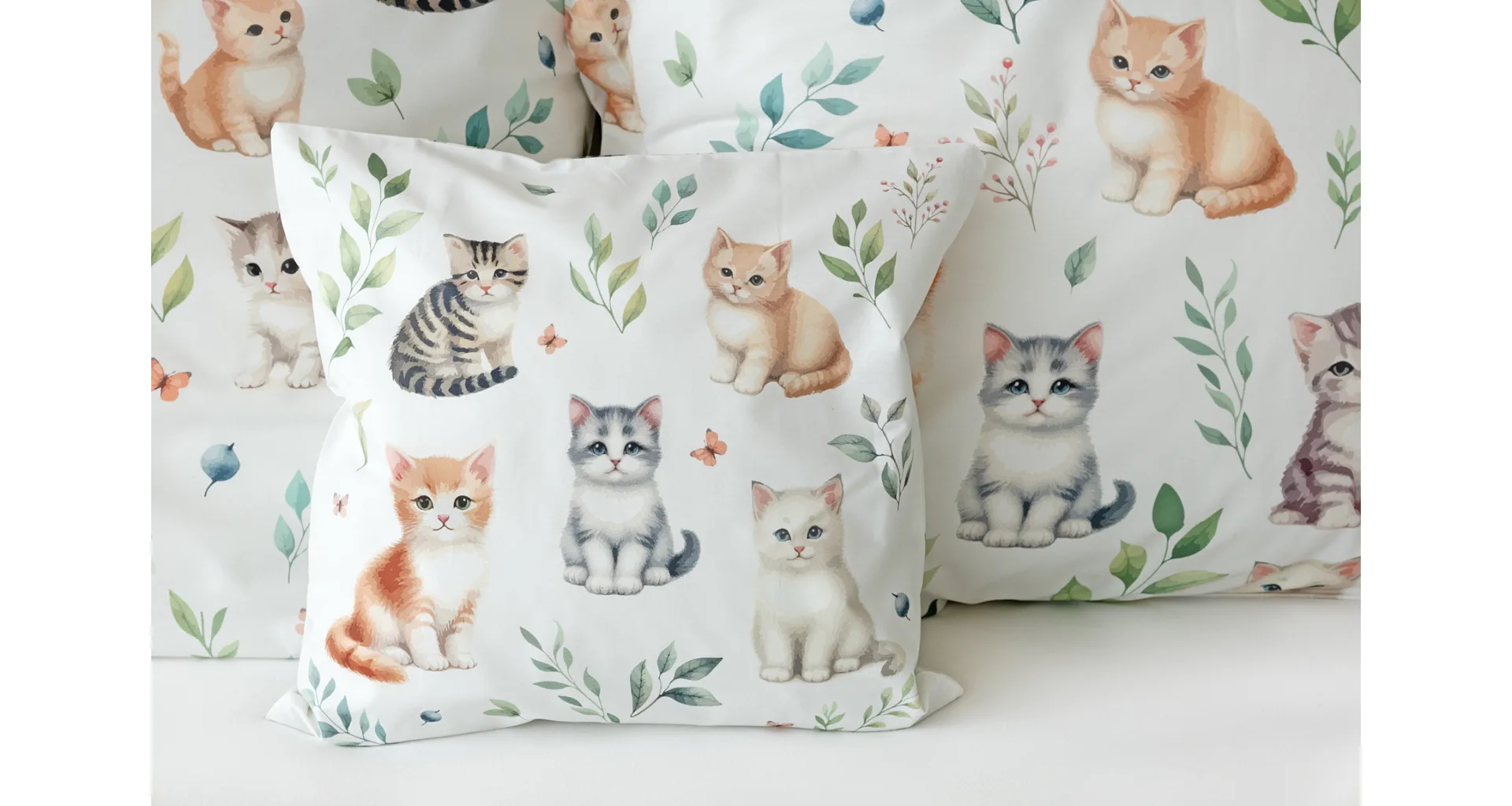 Povlak na polštář i na přikrývku zachycuje z obou stran motiv koťátek. Povlečení je vyrobeno ze 100% bavlny a je opatřeno praktickým zipovým uzávěrem.
