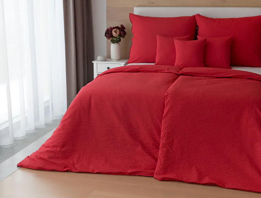 Luxusní červené krepové povlečení v provedení kvalitní 100% bavlny je opatřeno komfortním zipovým uzávěrem. Povlečení se snadno udržuje - nežehlí se.