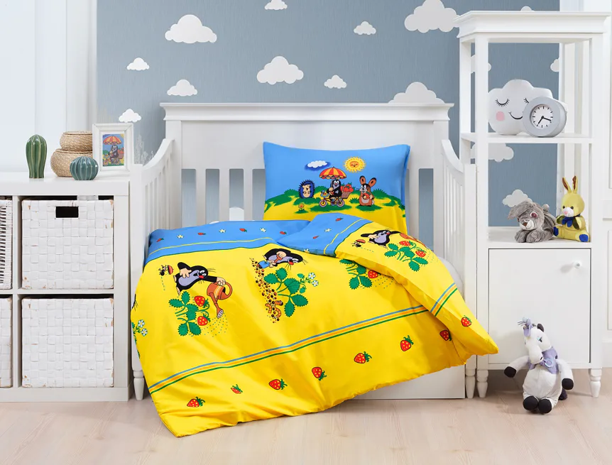 Dětské povlečení Krtek a jahůdky s veselými postavičkami Krtka a jeho kamarádů rozveselí dětskou postýlku a dětem se v něm bude krásně usínat.