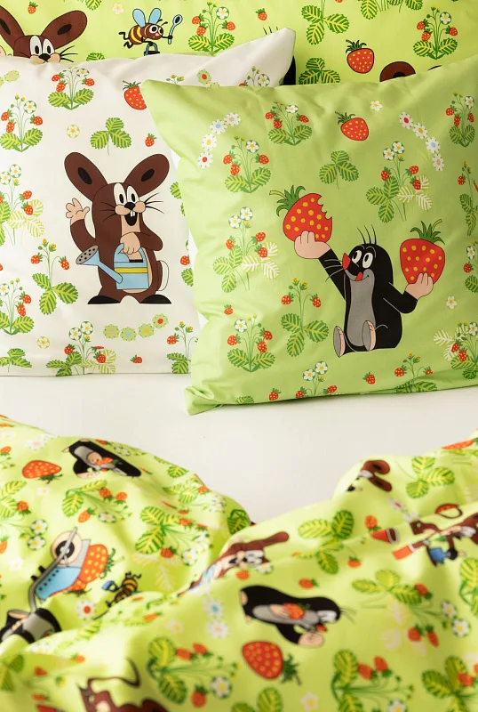 Vrchní strana povlaku na přikrývku odpovídá vyobrazení na fotografii, spodní stranu tvoří motiv jahůdek na bílém podkladu. Motiv povlaku na polštář se z každé strany liší - z jedné strany vyniká na zeleném podkladu, z druhé na bílém. Povlečení je opatřeno praktickým zipovým uzávěrem.