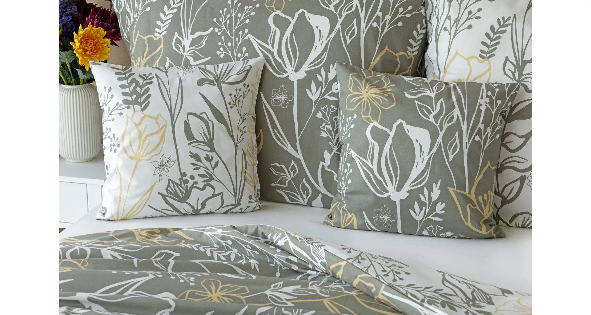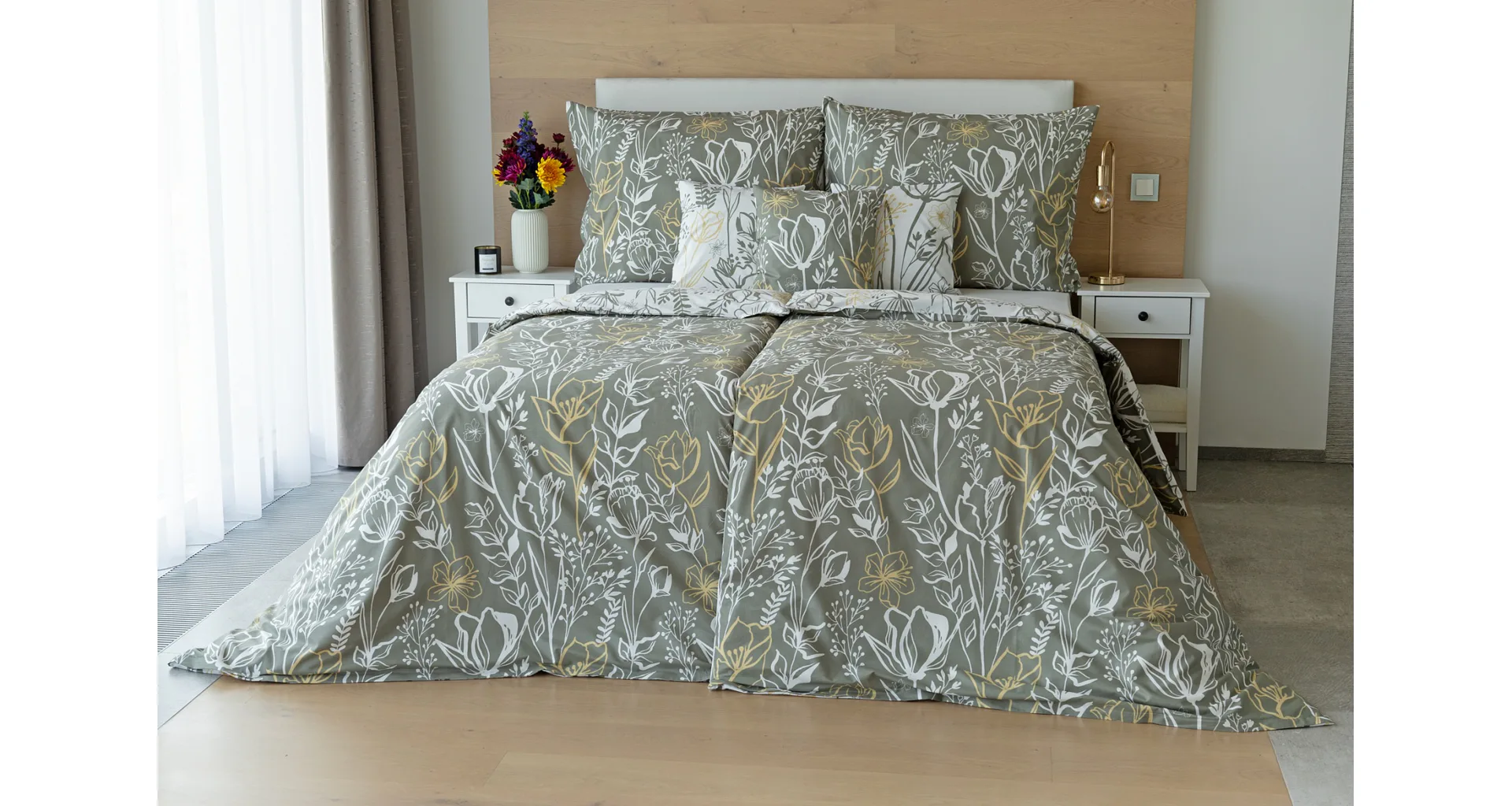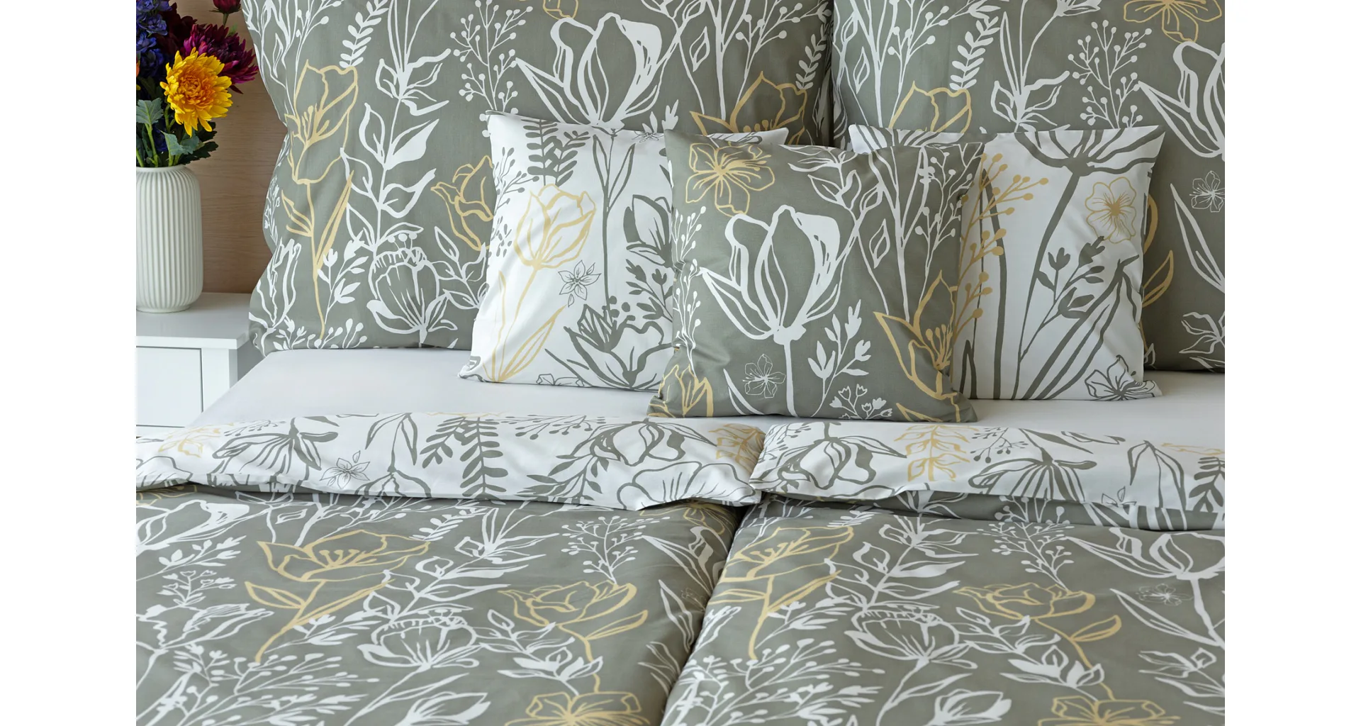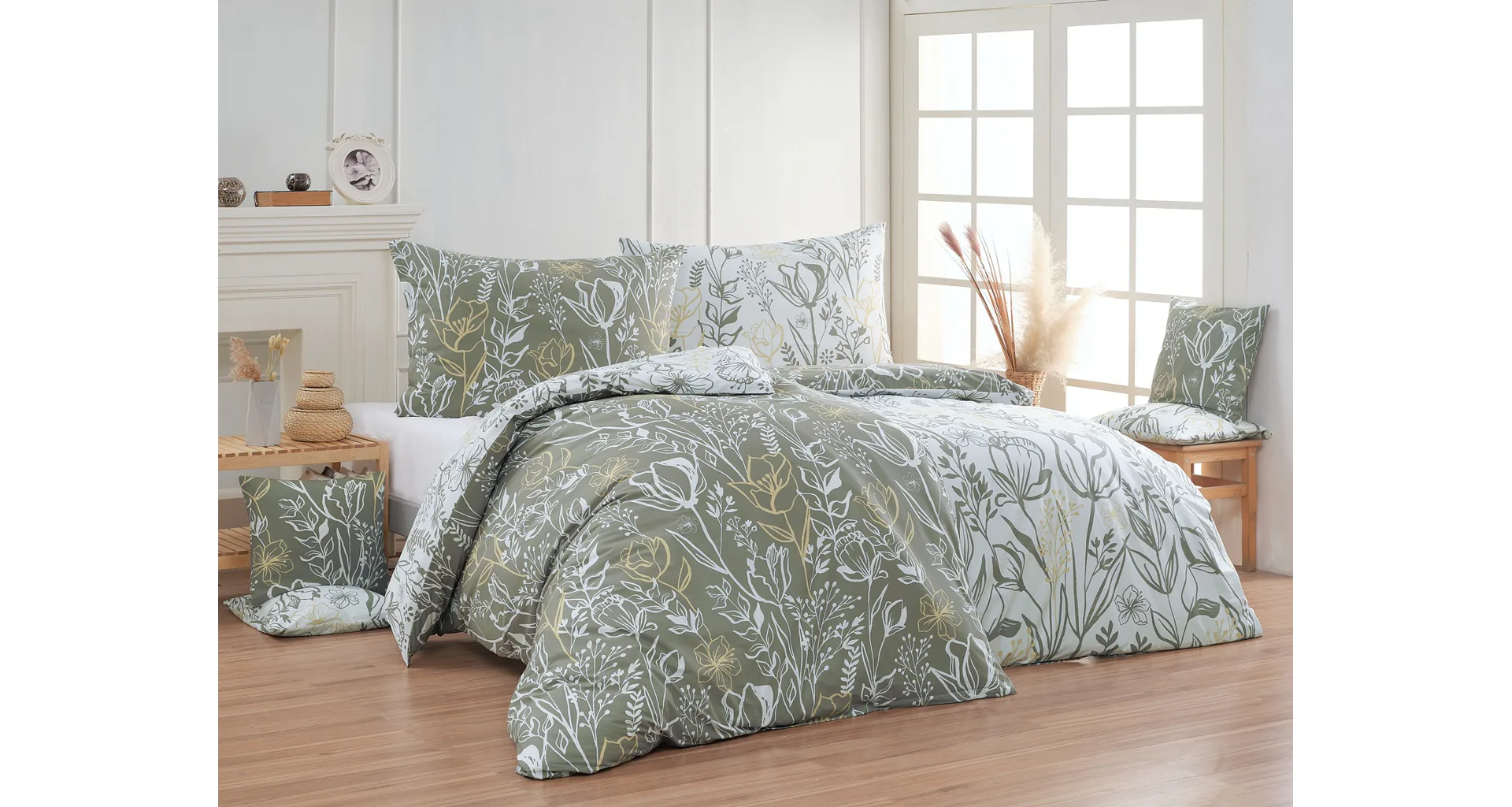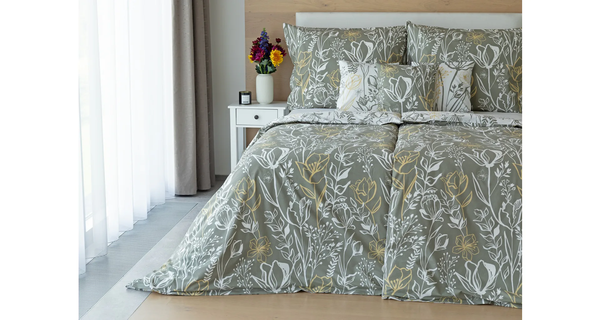Elegantní květinové povlečení Larissa vnese svěžest a noblesu do vaší ložnice. Jemný florální motiv v kombinaci bílá, zeleno-šedá a béžová vyniká z každé strany povlečení na jiném podkladu. Díky tomuto oblíbenému oboustrannému provedení můžete při stlaní hravě experimentovat!