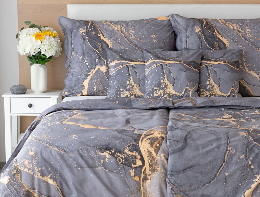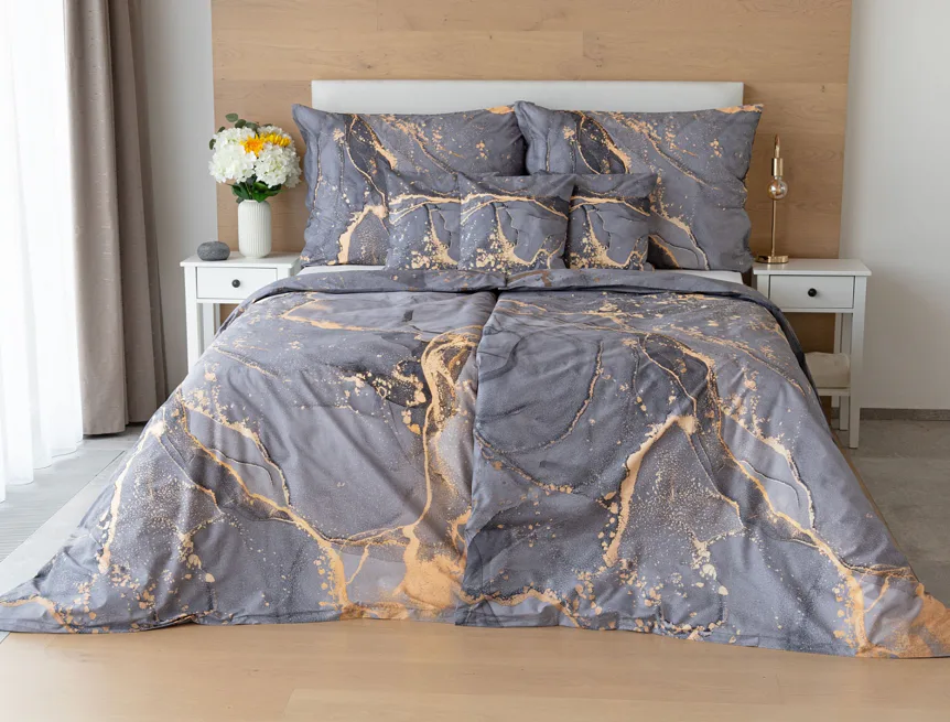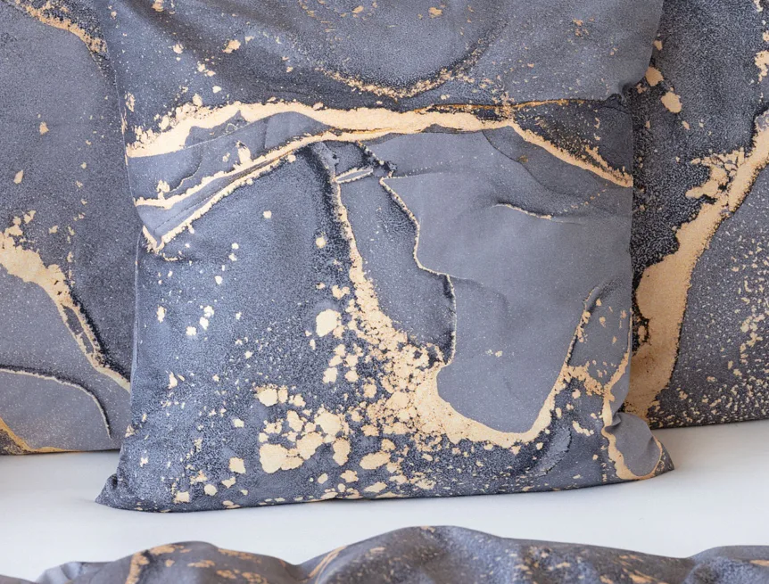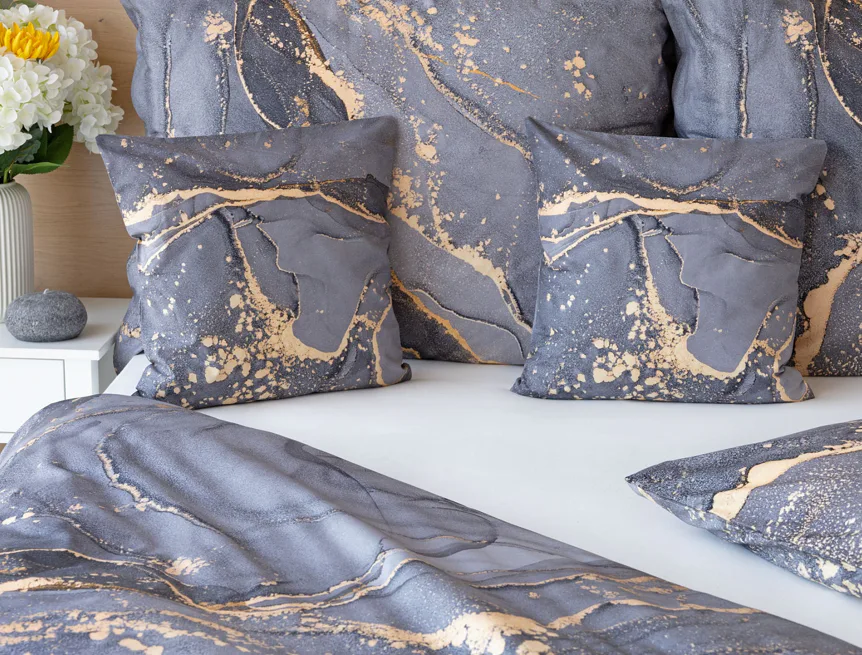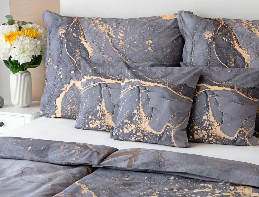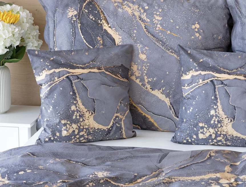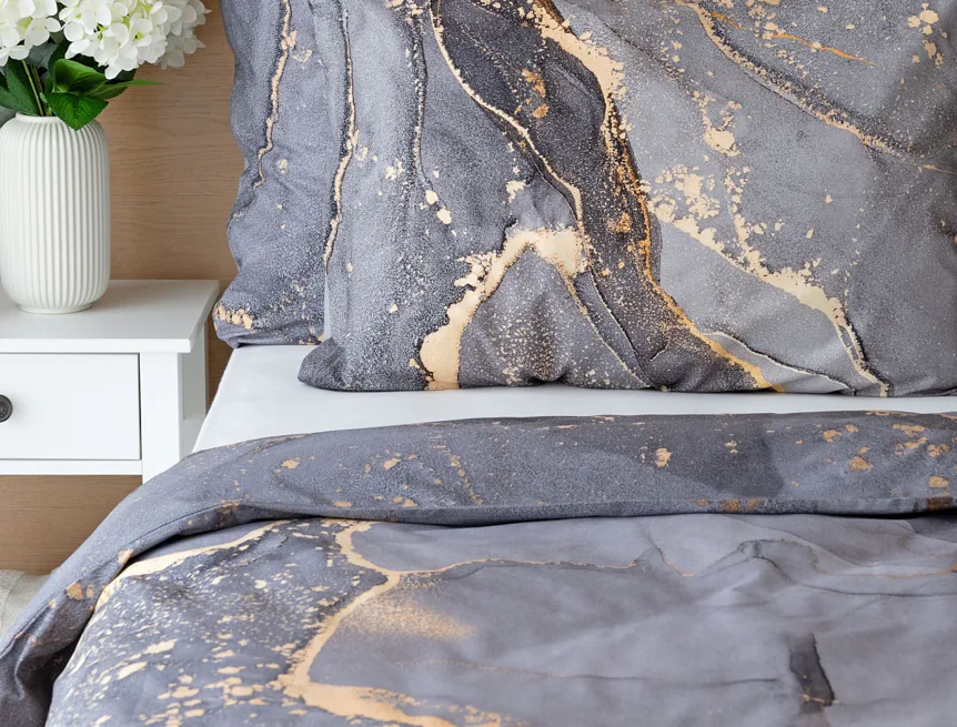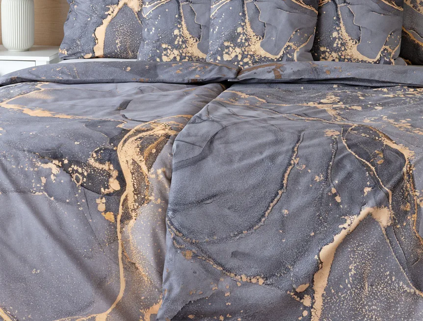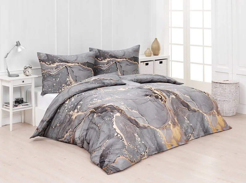 Ložní povlečení Laura upoutá vaši pozornost na první pohled. Je dokonalé. V mramorovém vzoru se snoubí odstíny přírodní šedé s hřejivou paletou béžových, pískových a zlatavých tónů.