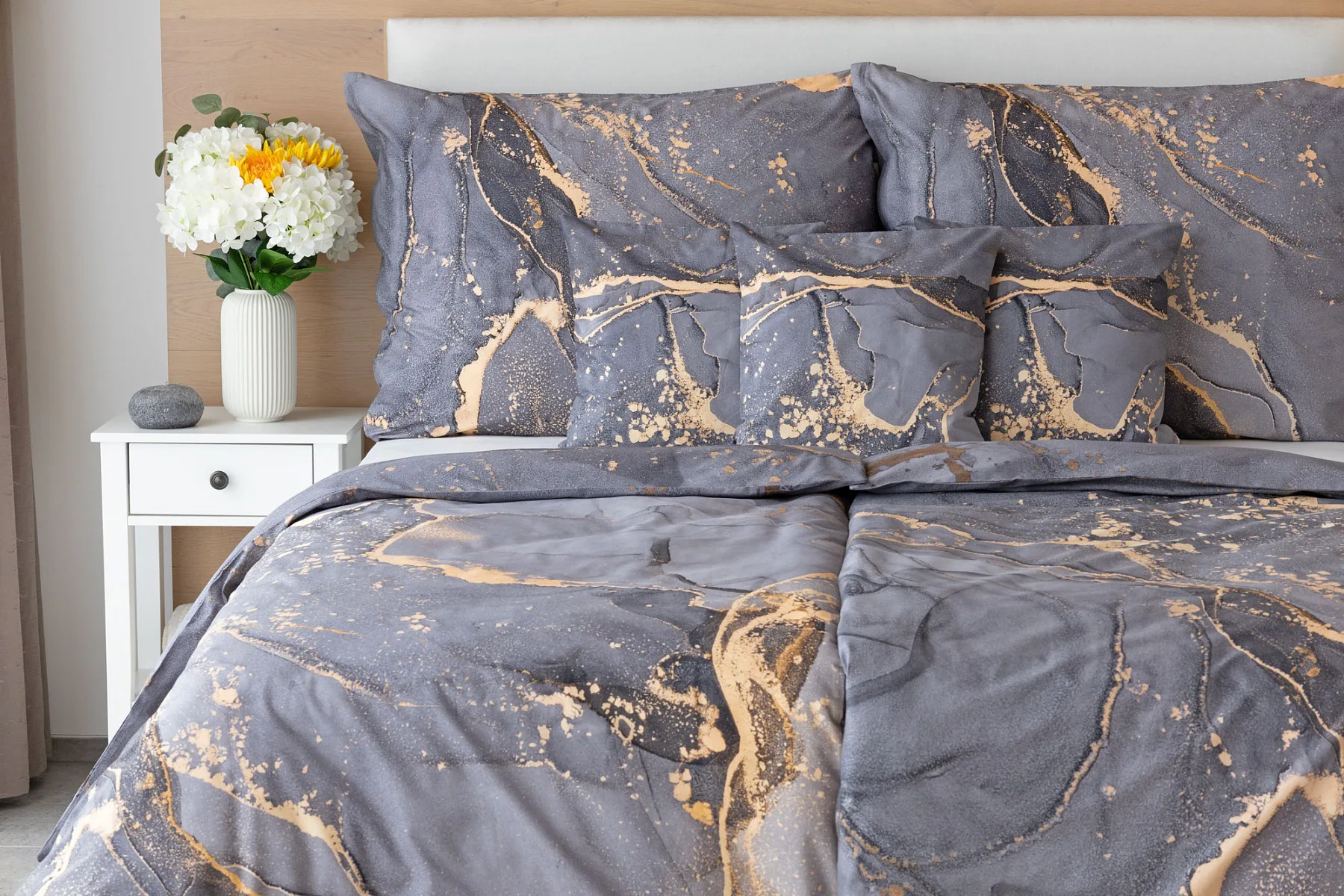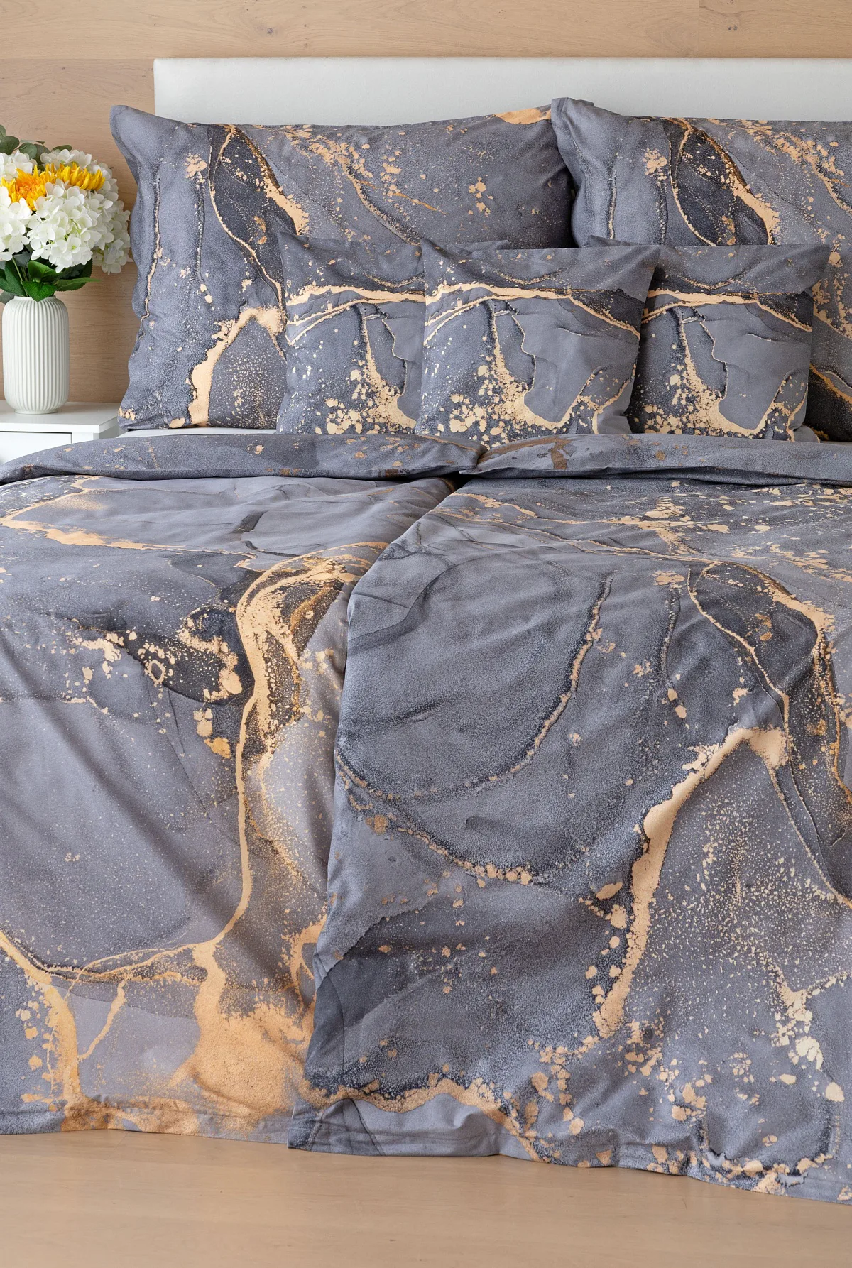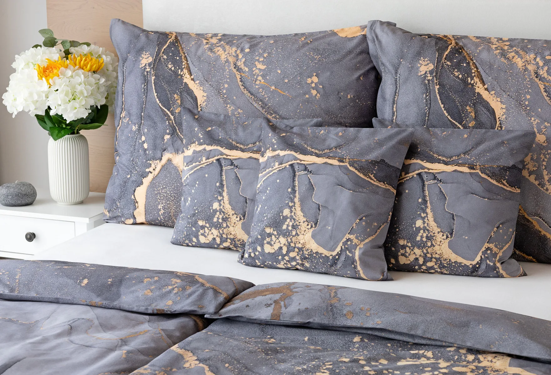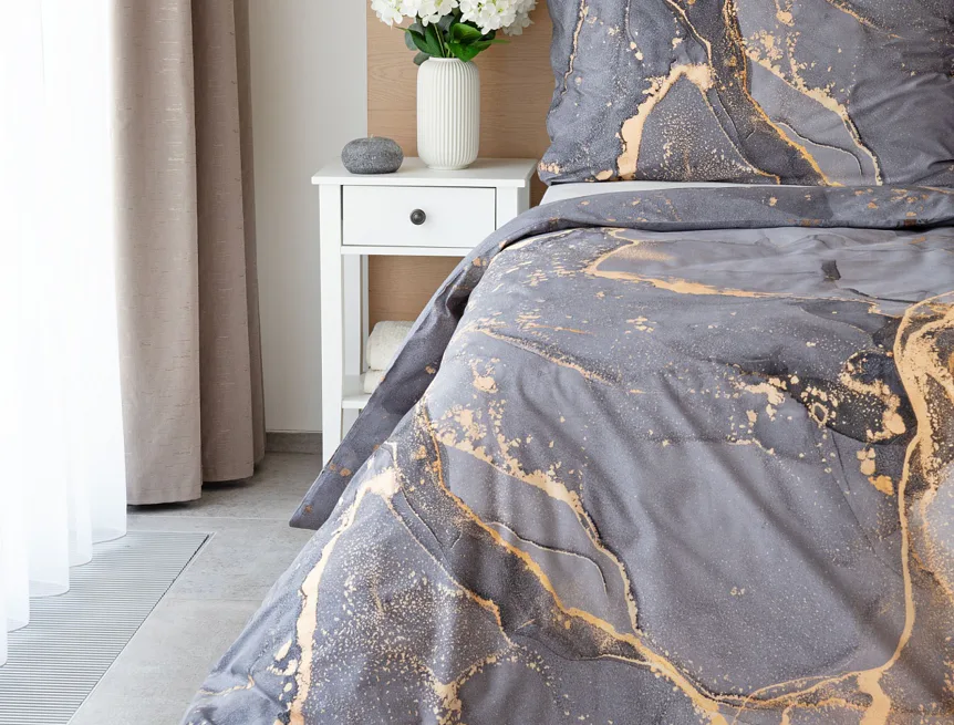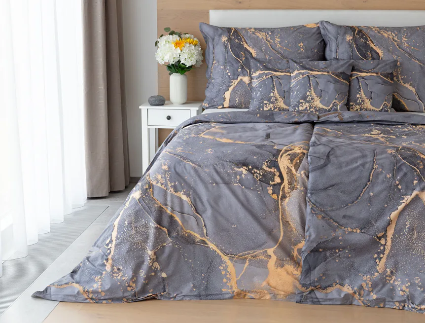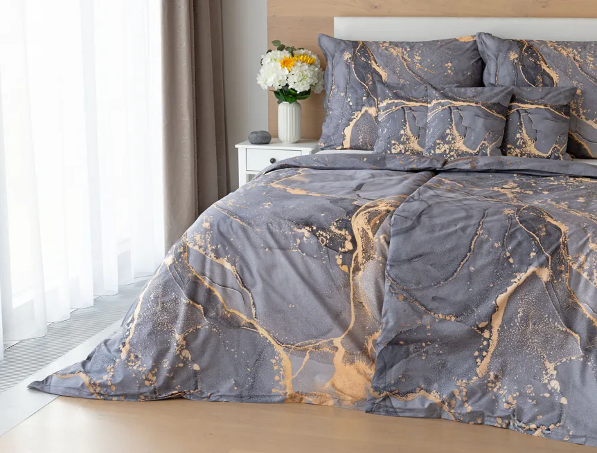 Ložní povlečení Laura upoutá vaši pozornost na první pohled. Je dokonalé. V mramorovém vzoru se snoubí odstíny přírodní šedé s hřejivou paletou béžových, pískových a zlatavých tónů.