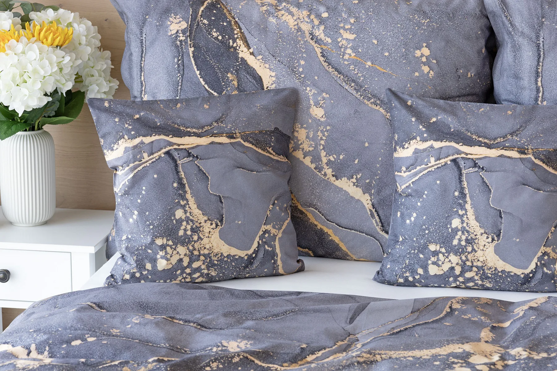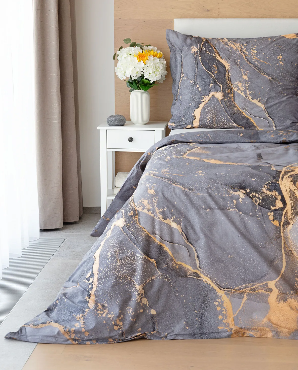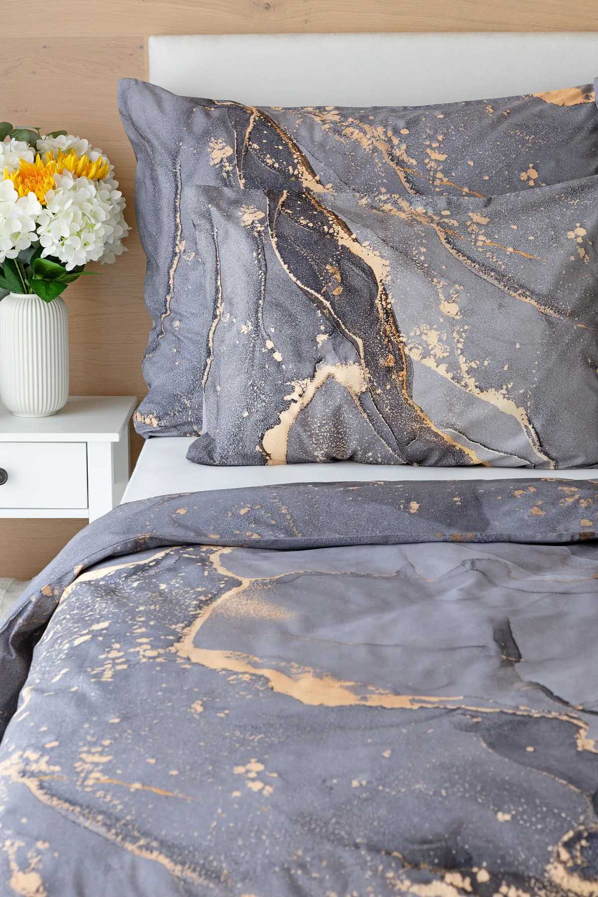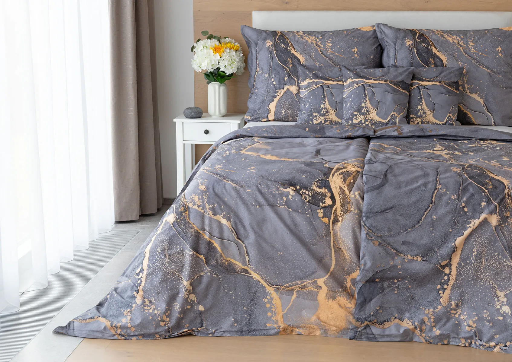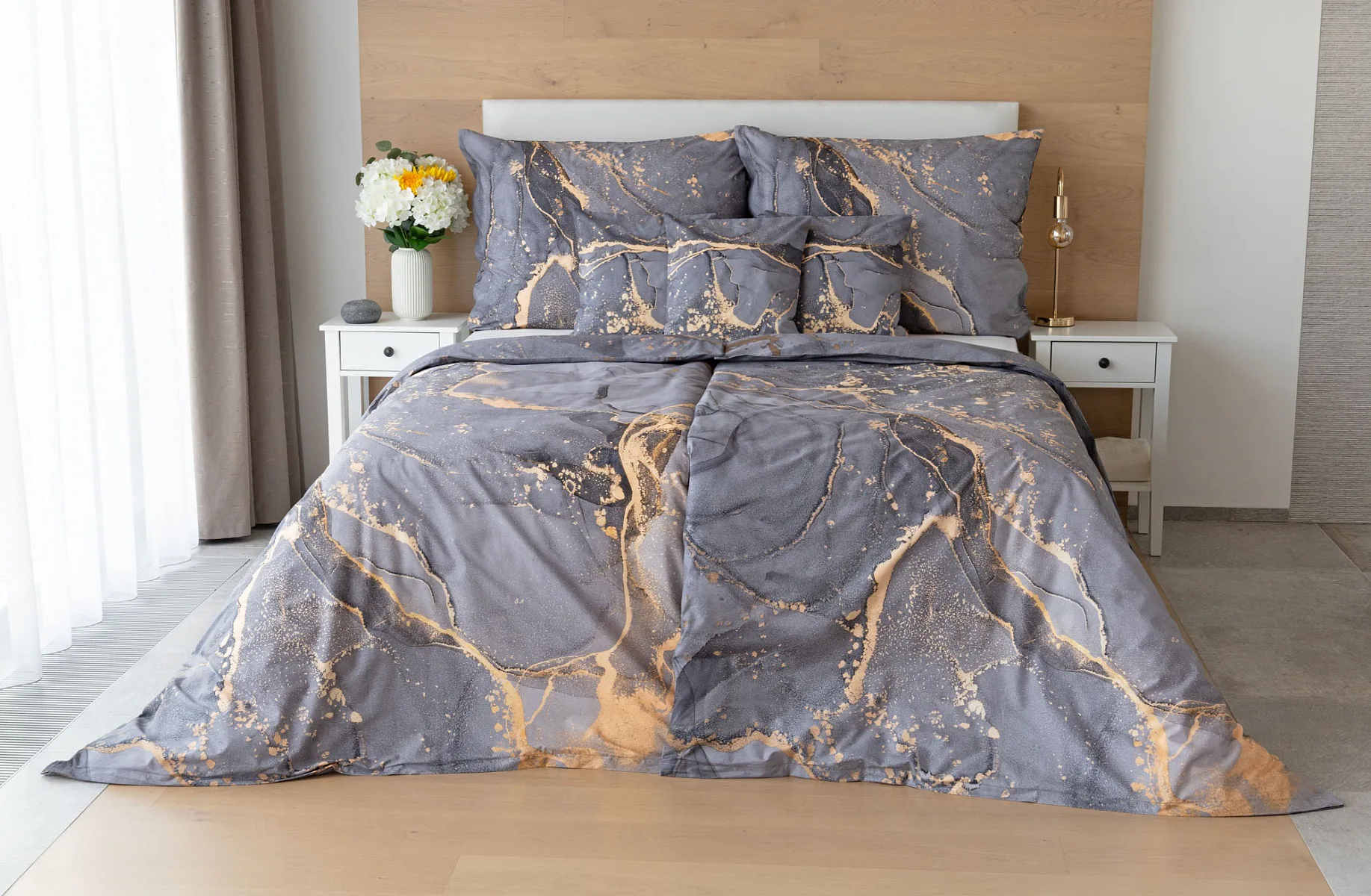 Ložní povlečení Laura upoutá vaši pozornost na první pohled. Je dokonalé. V mramorovém vzoru se snoubí odstíny přírodní šedé s hřejivou paletou béžových, pískových a zlatavých tónů.