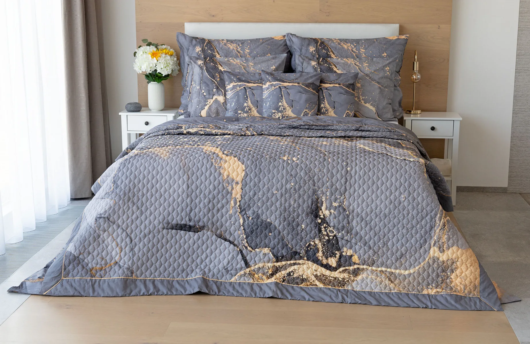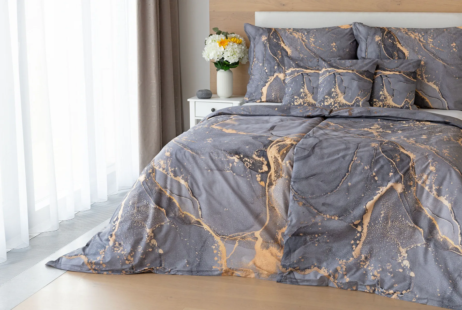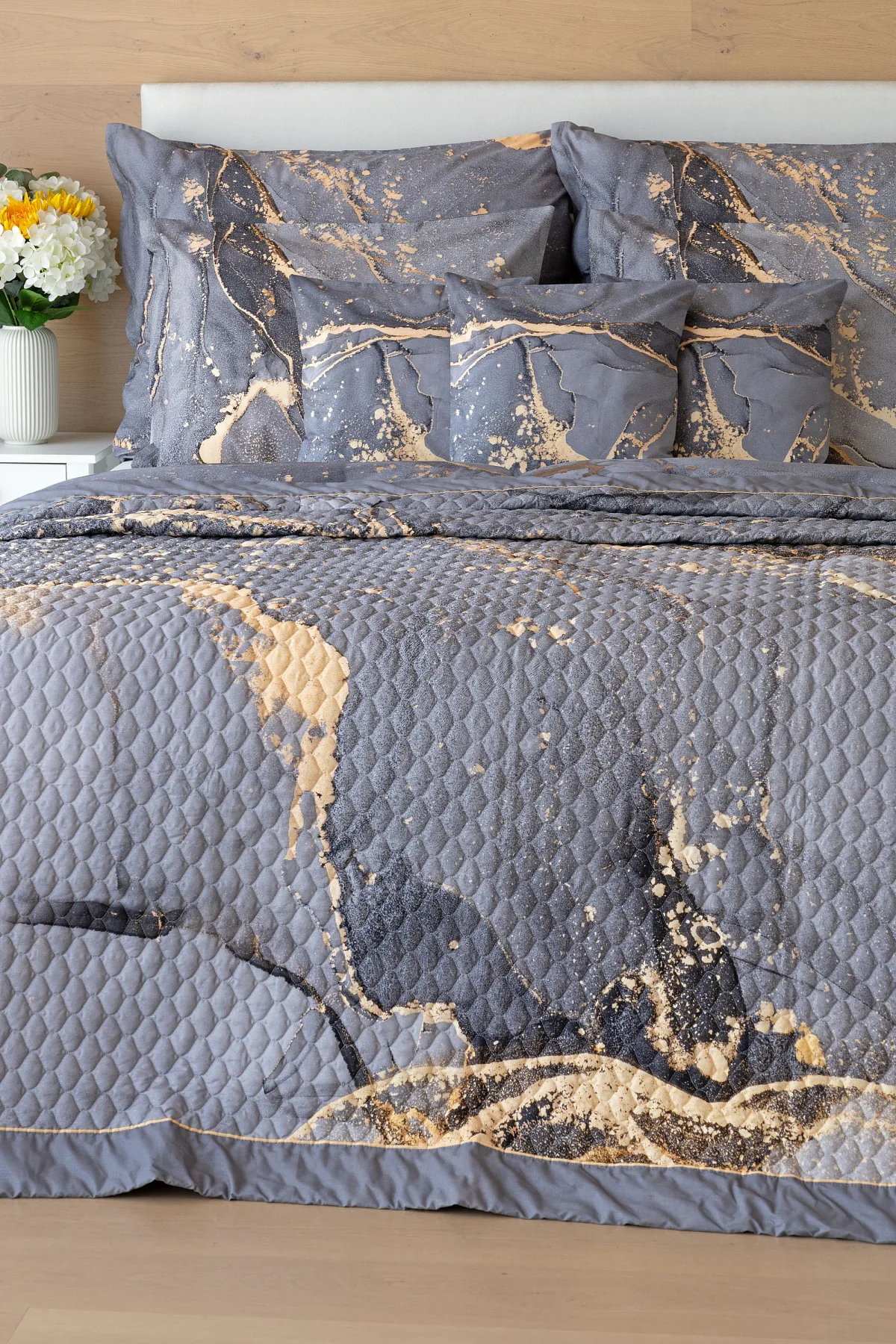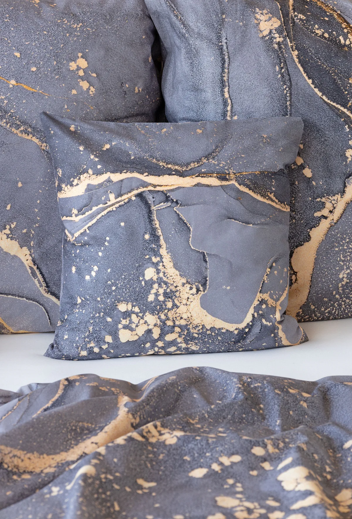 Ložní povlečení Laura upoutá vaši pozornost na první pohled. Je dokonalé. V mramorovém vzoru se snoubí odstíny přírodní šedé s hřejivou paletou béžových, pískových a zlatavých tónů.