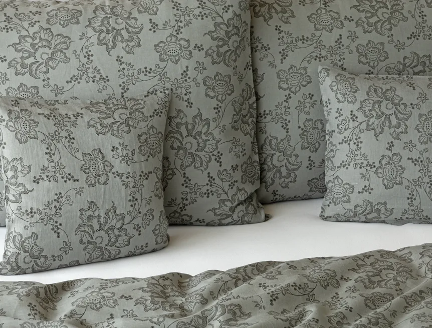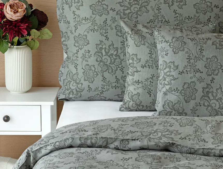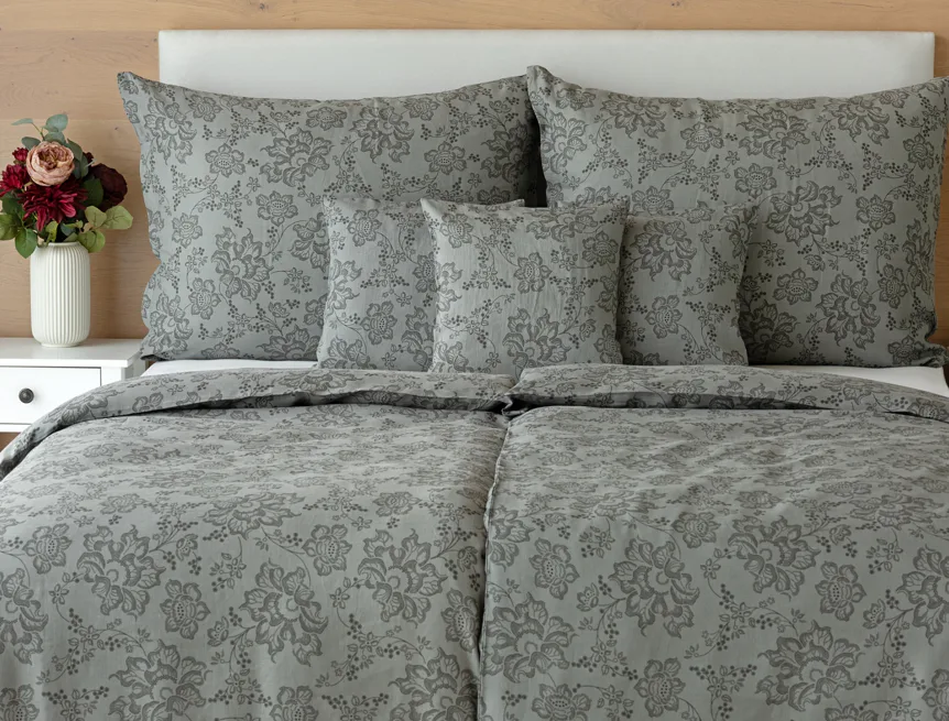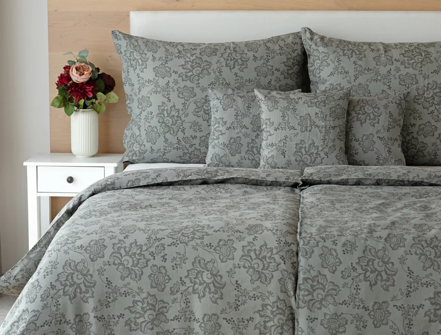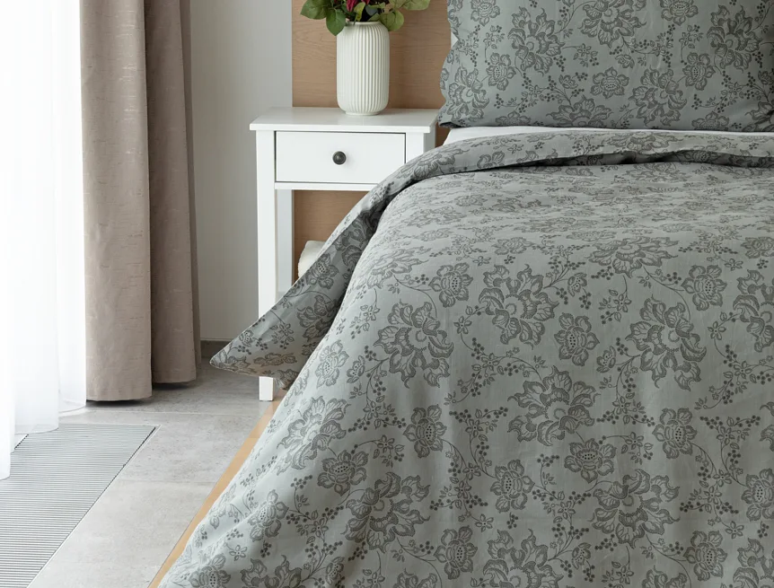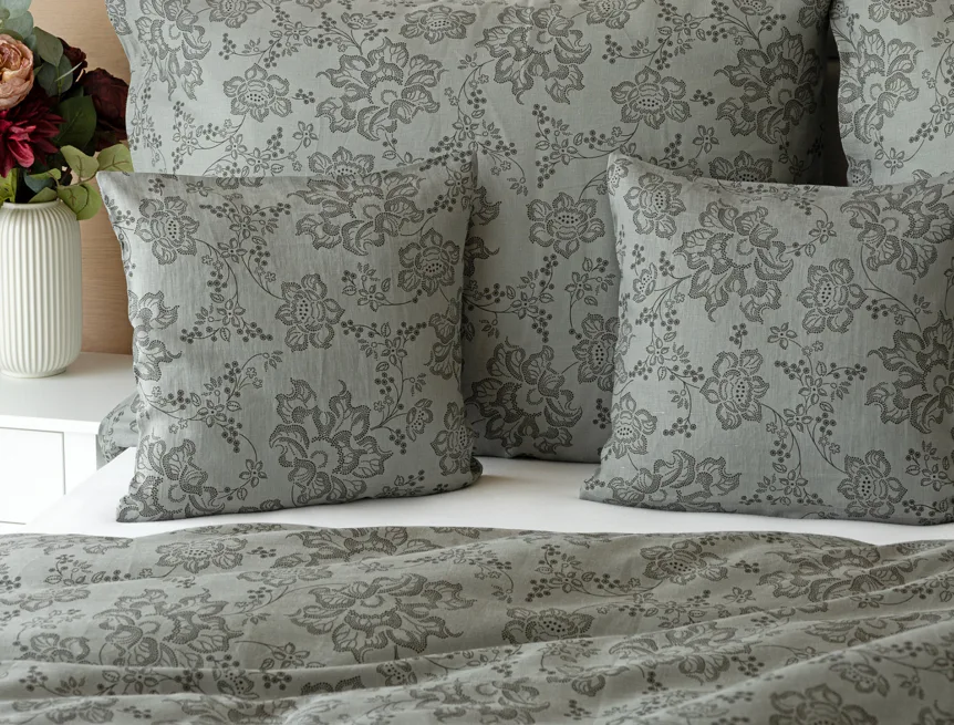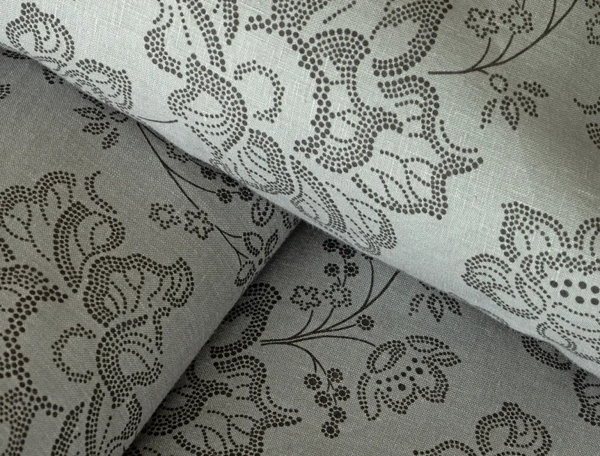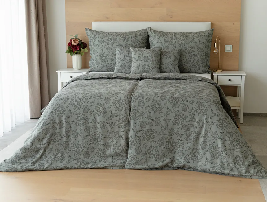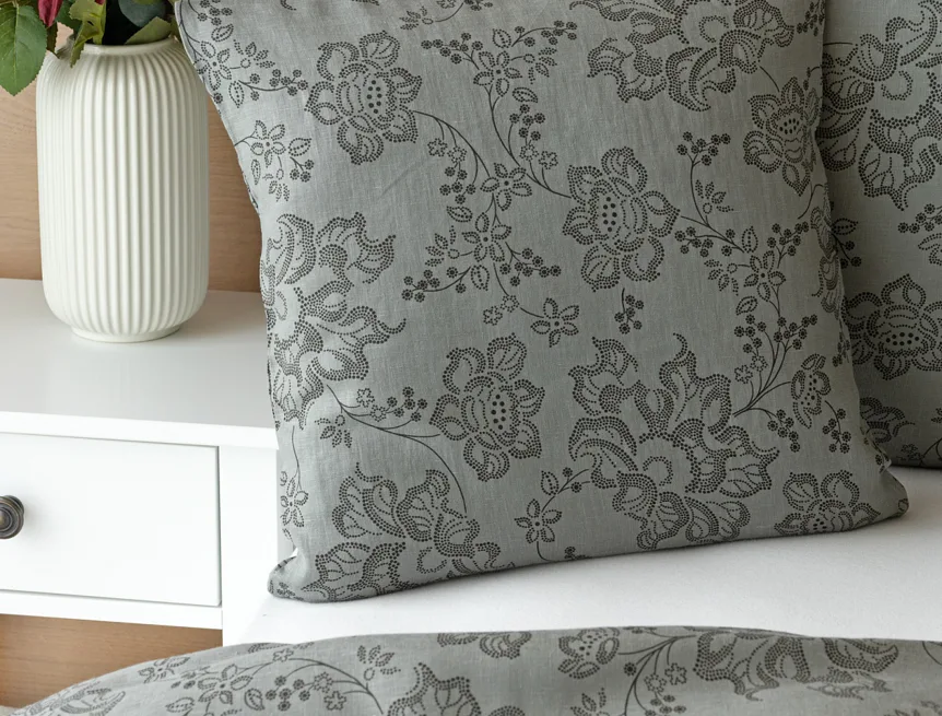 Objevte benefity jedinečného přírodního materiálu a dopřejte si nezaměnitelný komfort s naším lněným povlečením Leilani. Originální florální motiv v antracitové barvě vyniká na šédém podkladu ložního povlečení. Elegntní vzor v kombinaci s tímto ekologicky šetrným materiálem doladí k dokonalosti každý interiér s rustikálním nádechem, ale může být noblesní ozdobou i v moderně zařízené ložnici.