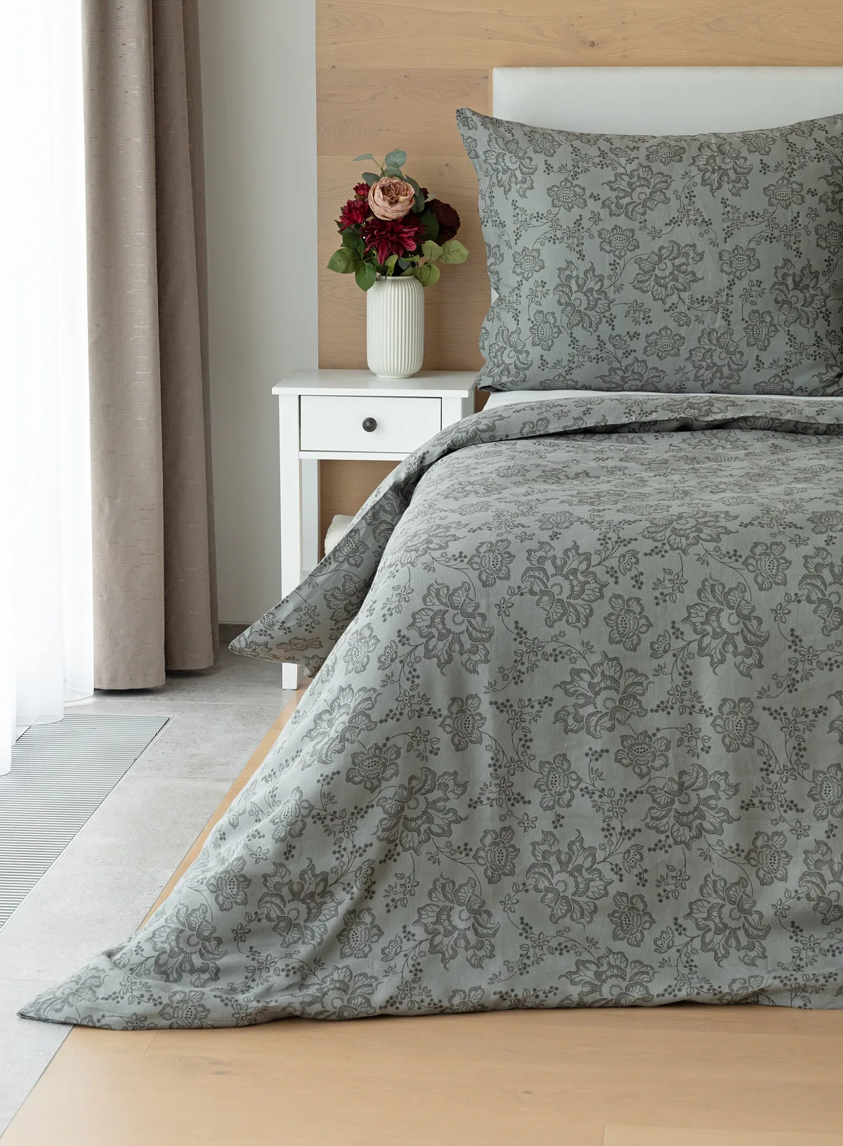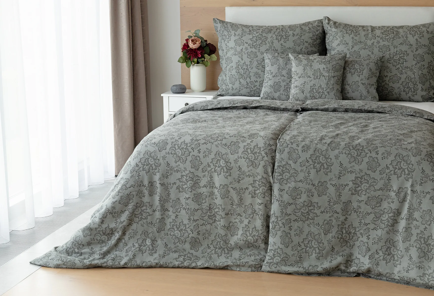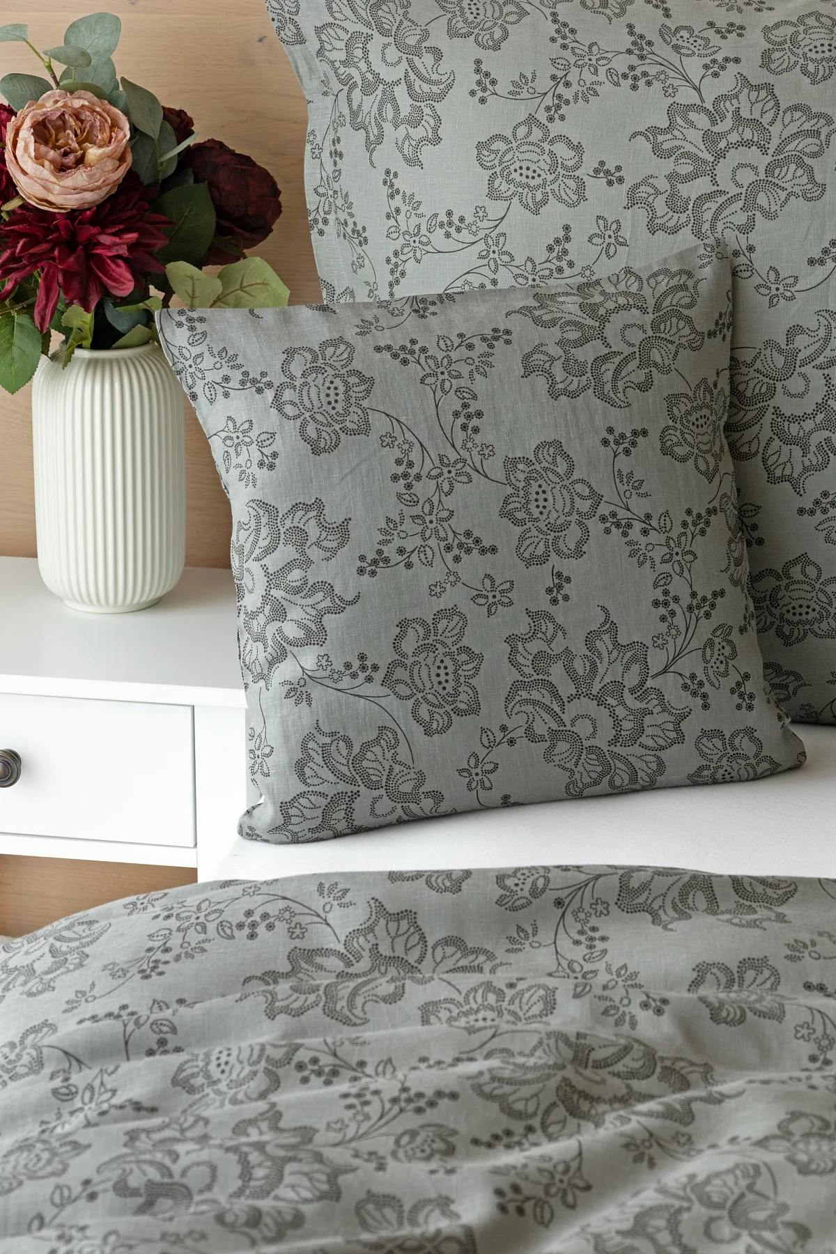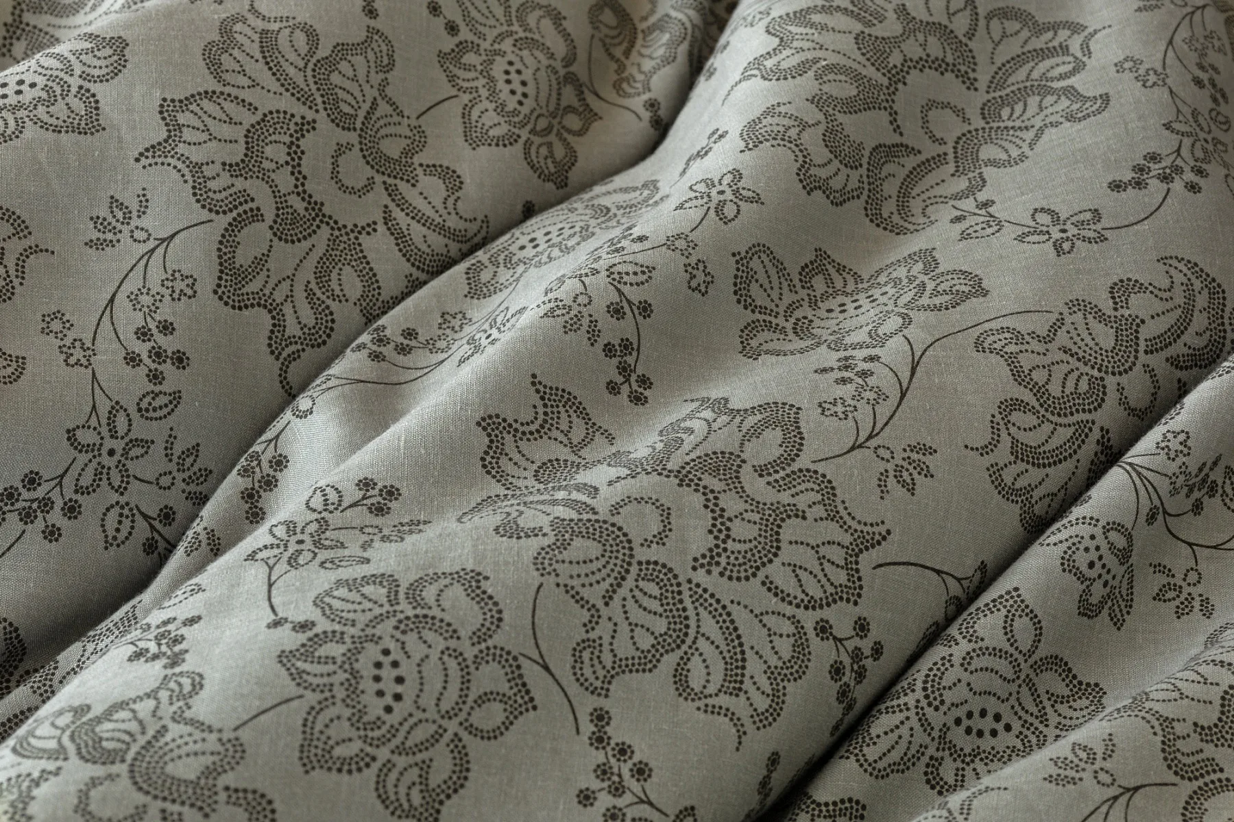 Objevte benefity jedinečného přírodního materiálu a dopřejte si nezaměnitelný komfort s naším lněným povlečením Leilani. Originální florální motiv v antracitové barvě vyniká na šédém podkladu ložního povlečení. Elegntní vzor v kombinaci s tímto ekologicky šetrným materiálem doladí k dokonalosti každý interiér s rustikálním nádechem, ale může být noblesní ozdobou i v moderně zařízené ložnici.