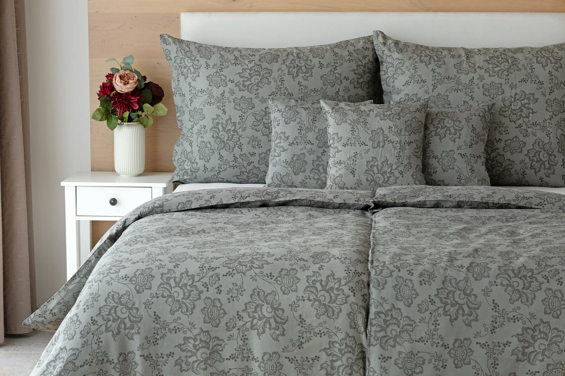 Objevte benefity jedinečného přírodního materiálu a dopřejte si nezaměnitelný komfort s naším lněným povlečením Leilani. Originální florální motiv v antracitové barvě vyniká na šédém podkladu ložního povlečení. Elegntní vzor v kombinaci s tímto ekologicky šetrným materiálem doladí k dokonalosti každý interiér s rustikálním nádechem, ale může být noblesní ozdobou i v moderně zařízené ložnici.