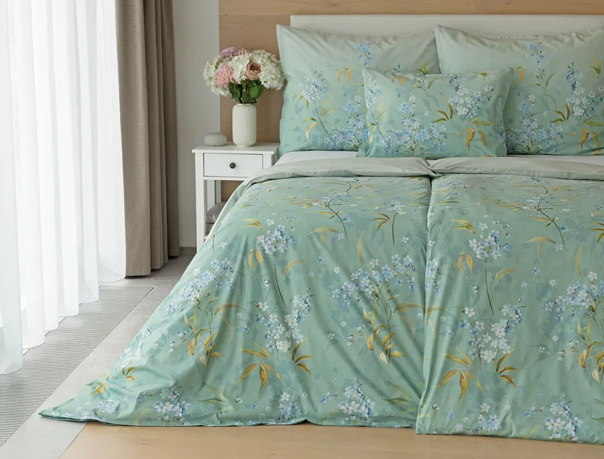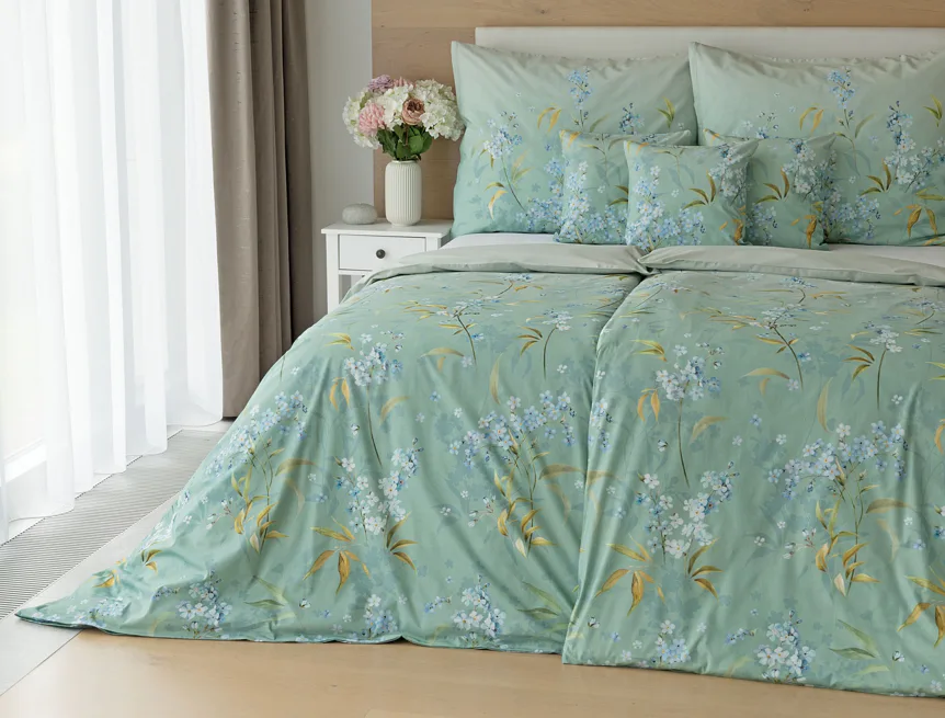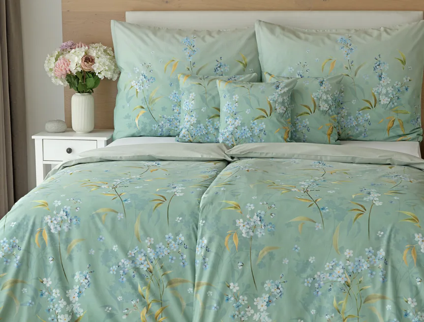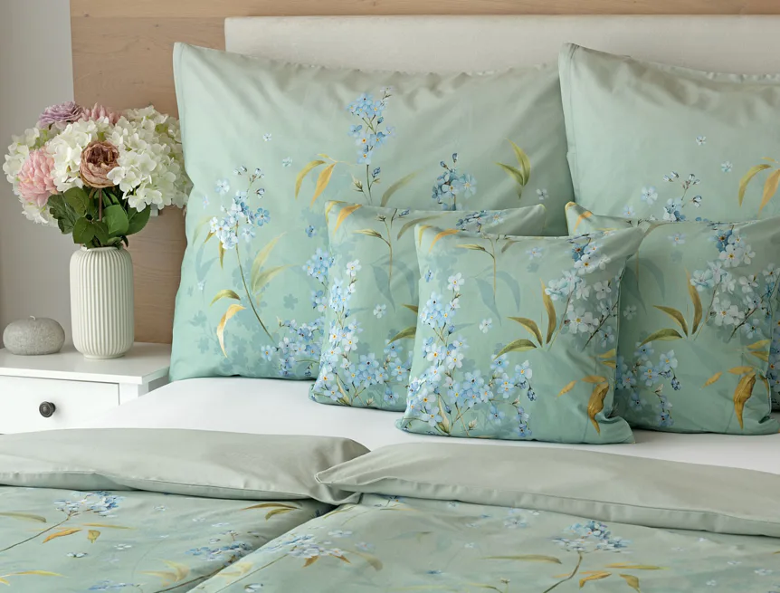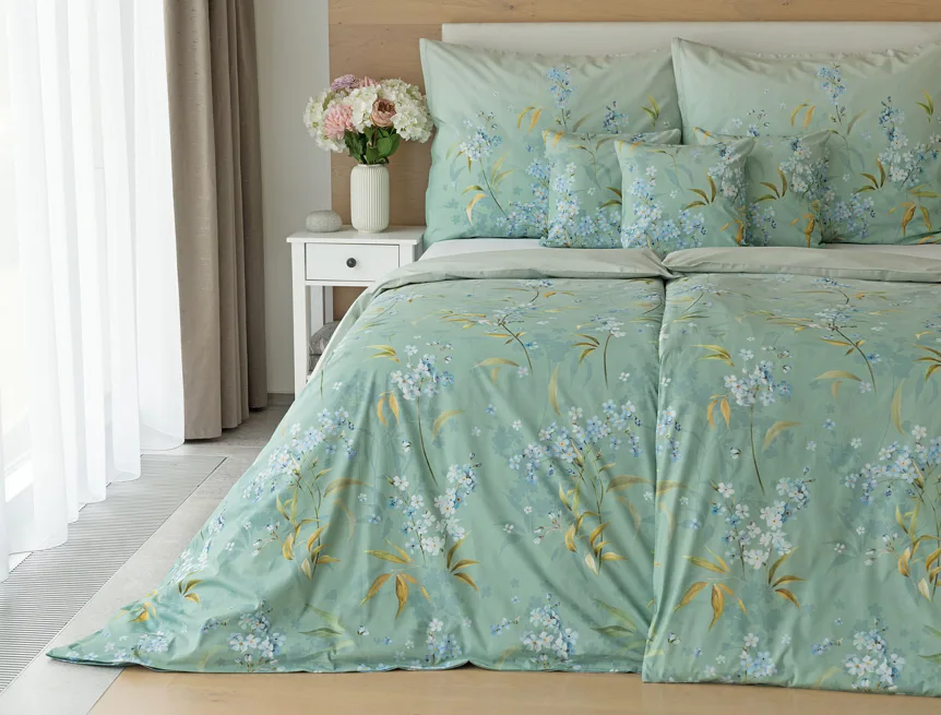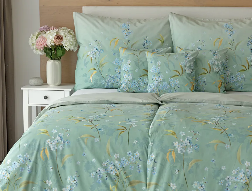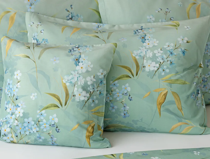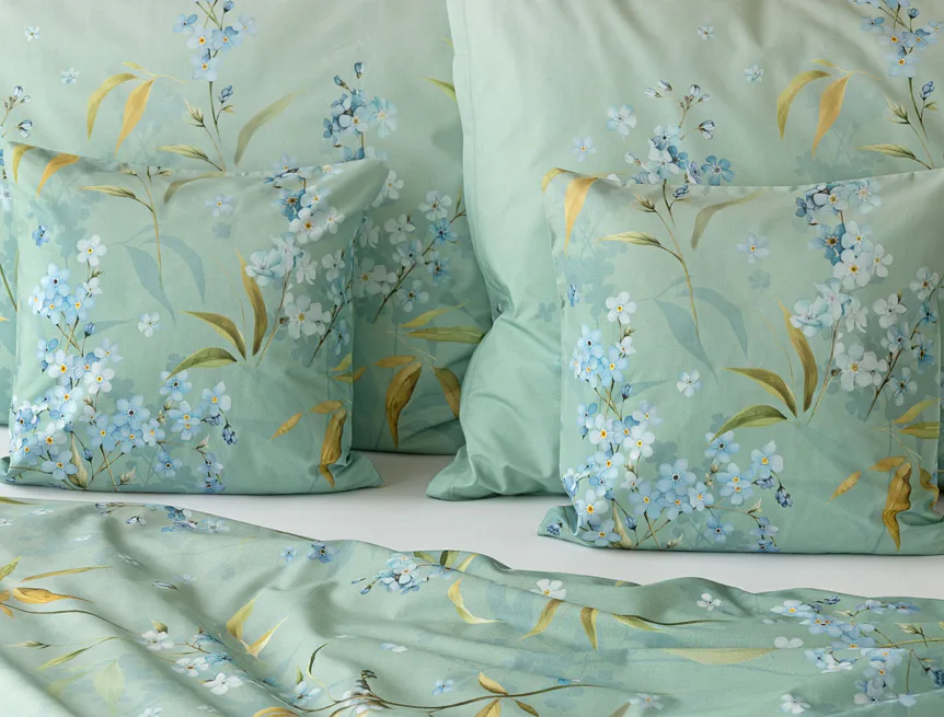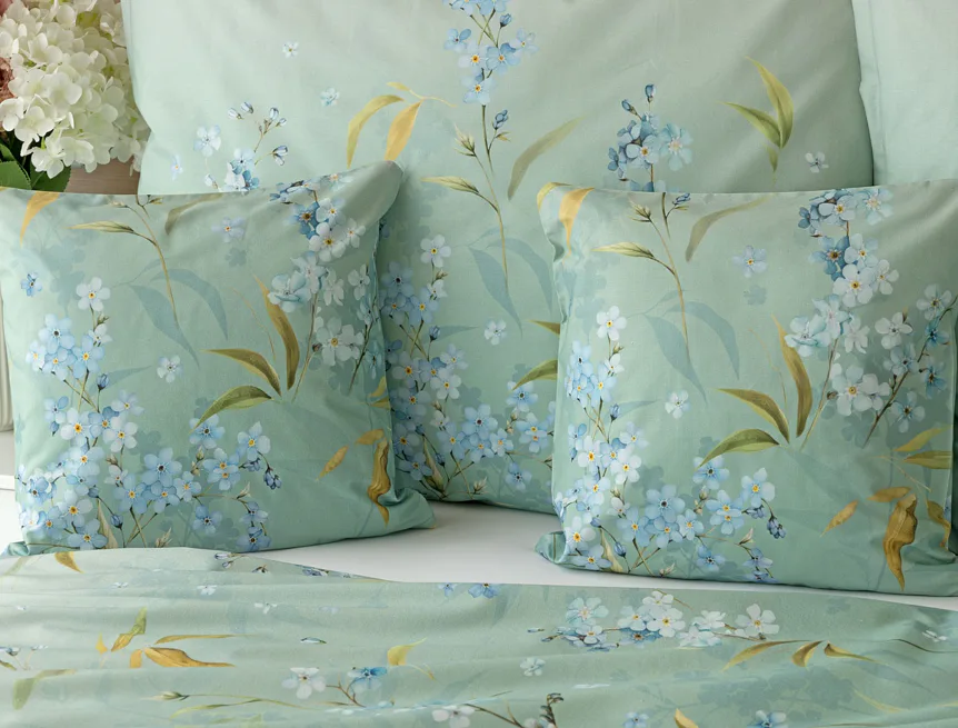 S bavlněným povlečením Libby získá vaše ložnice nádech svěžesti, romantiky a nostalgie. Něžný motiv pomněnek je v dokonalé harmonii se zelenomodrým podkladem, který je navíc ozvláštněn ombré efektem. Tento něžný květinový skvost si zamilujete.