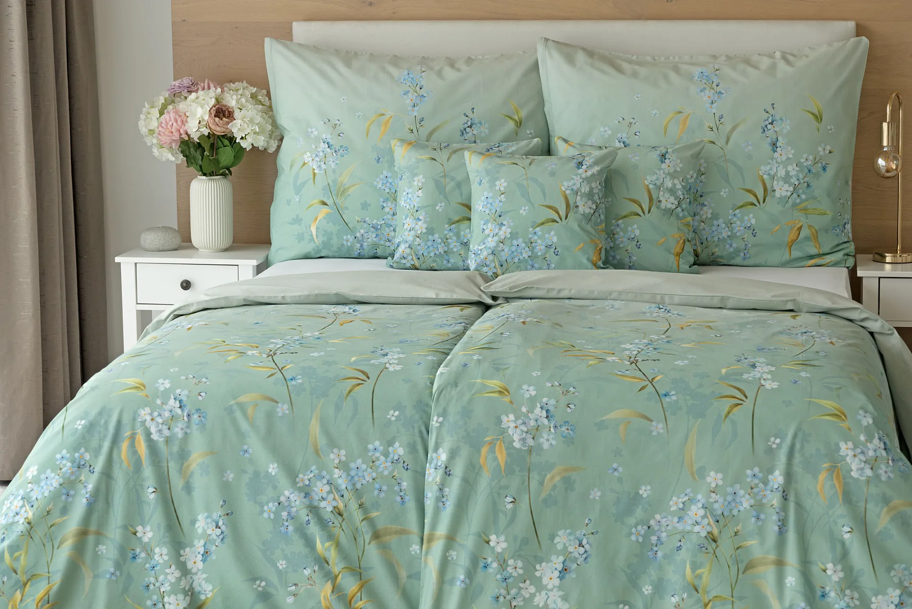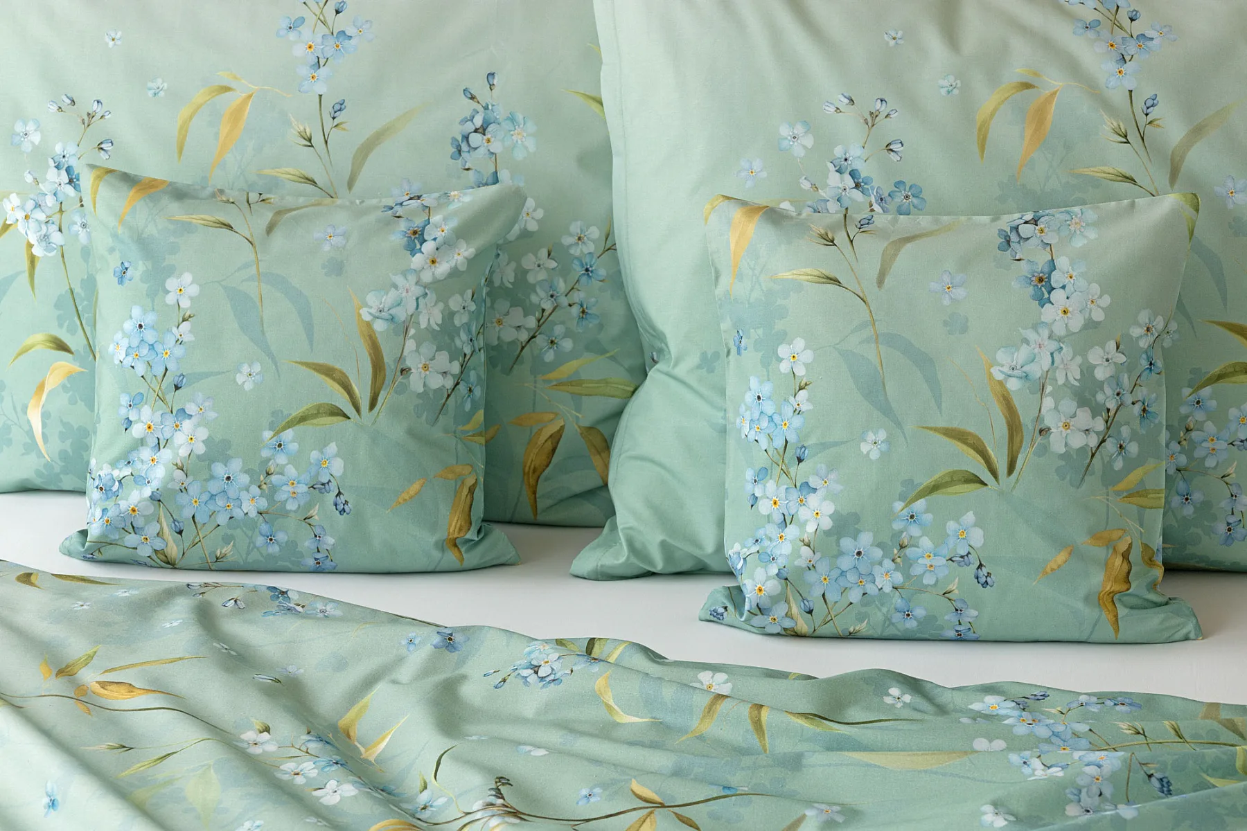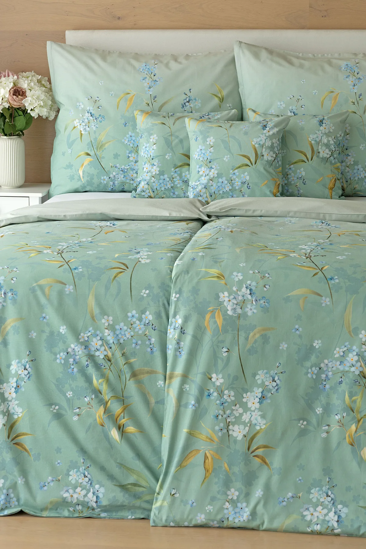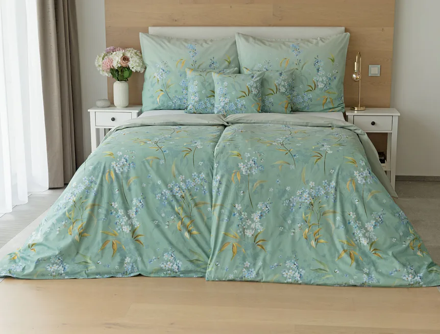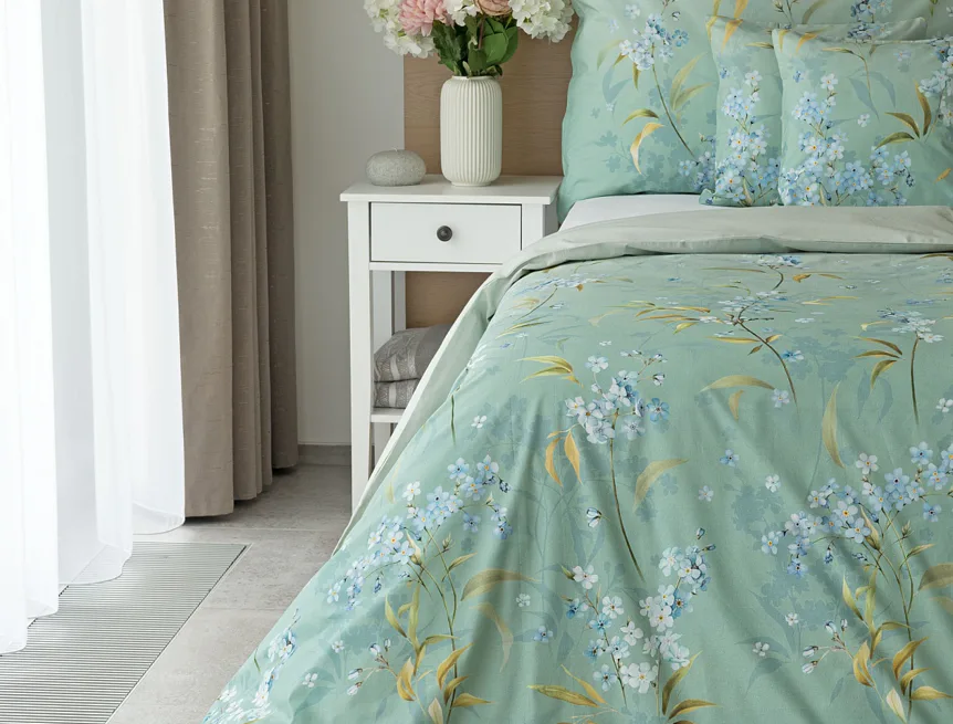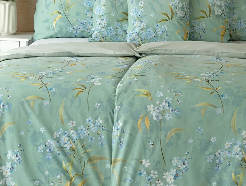 S bavlněným povlečením Libby získá vaše ložnice nádech svěžesti, romantiky a nostalgie. Něžný motiv pomněnek je v dokonalé harmonii se zelenomodrým podkladem, který je navíc ozvláštněn ombré efektem. Tento něžný květinový skvost si zamilujete.