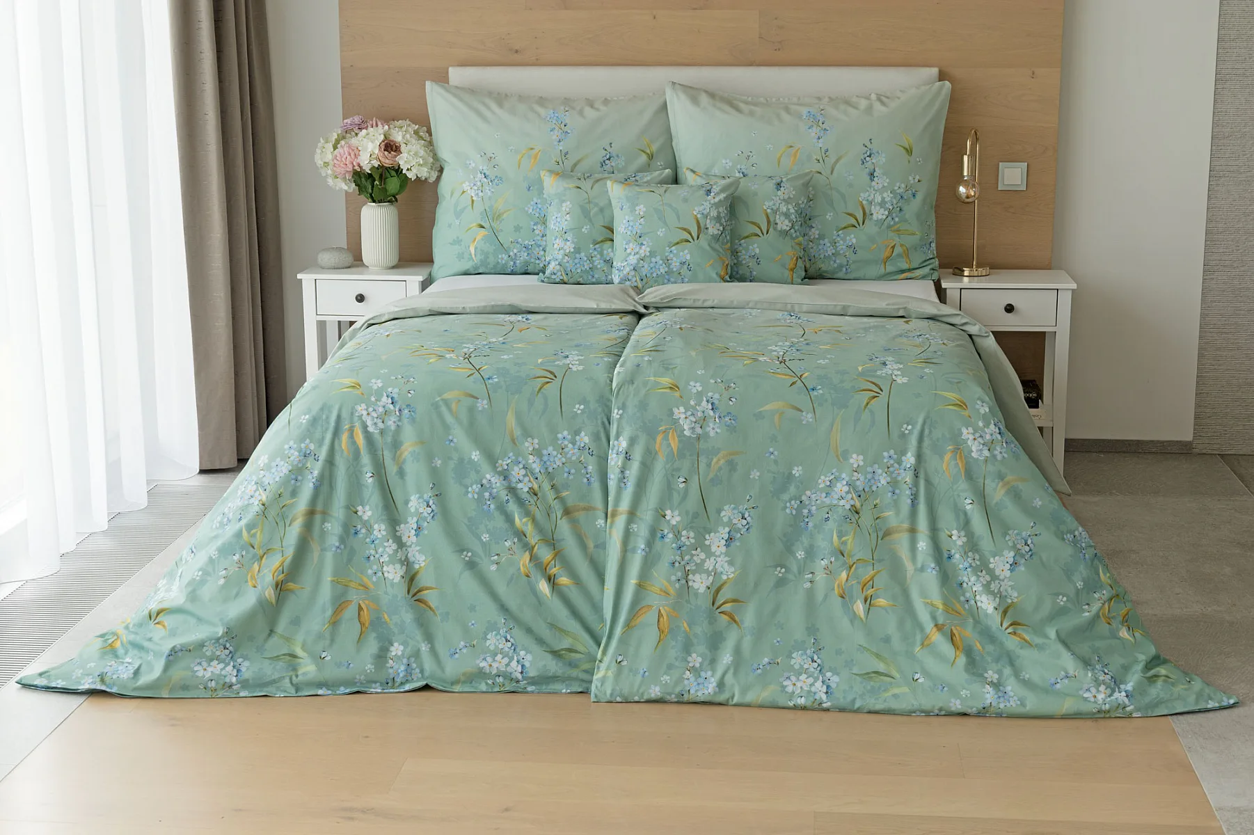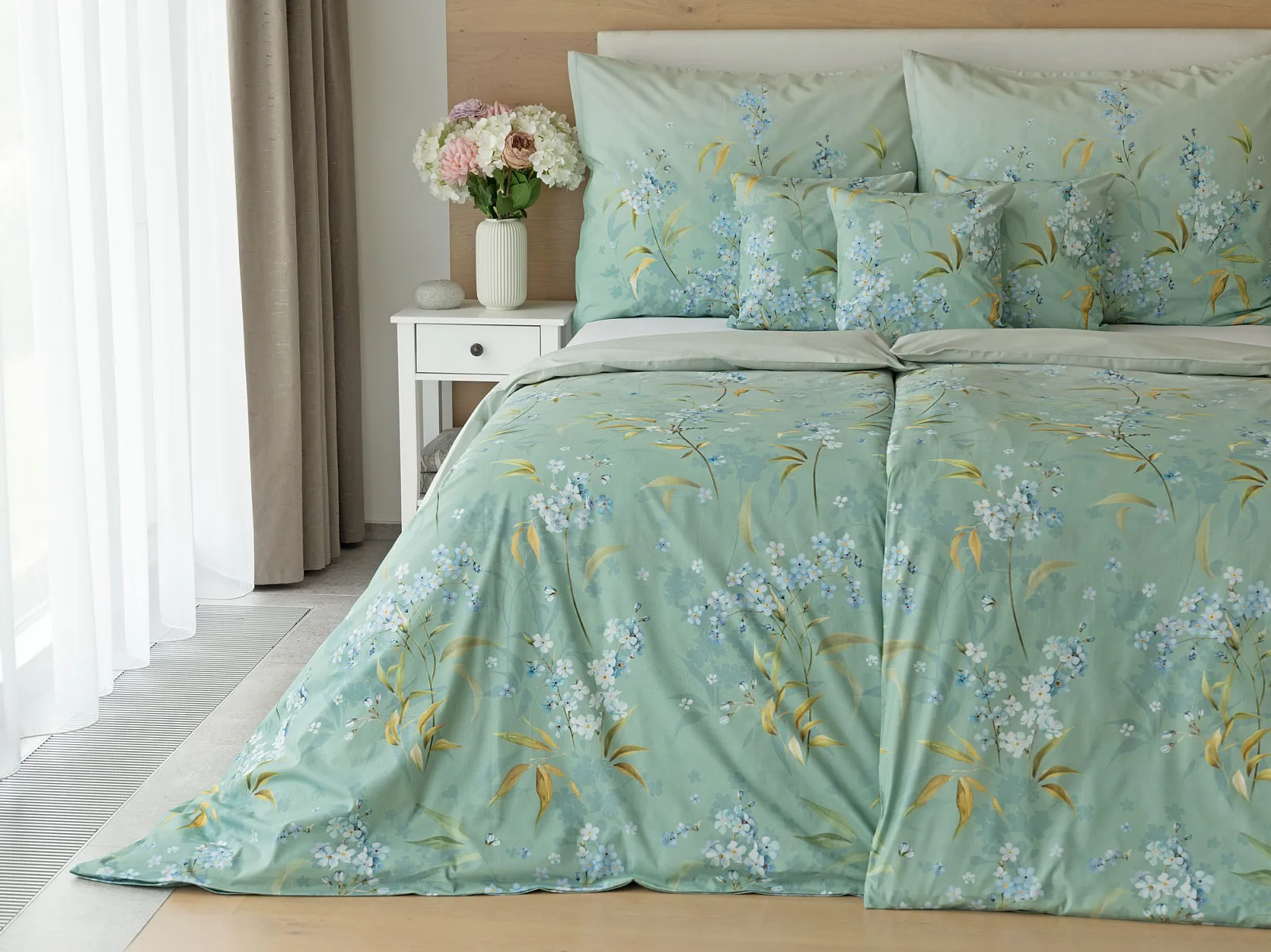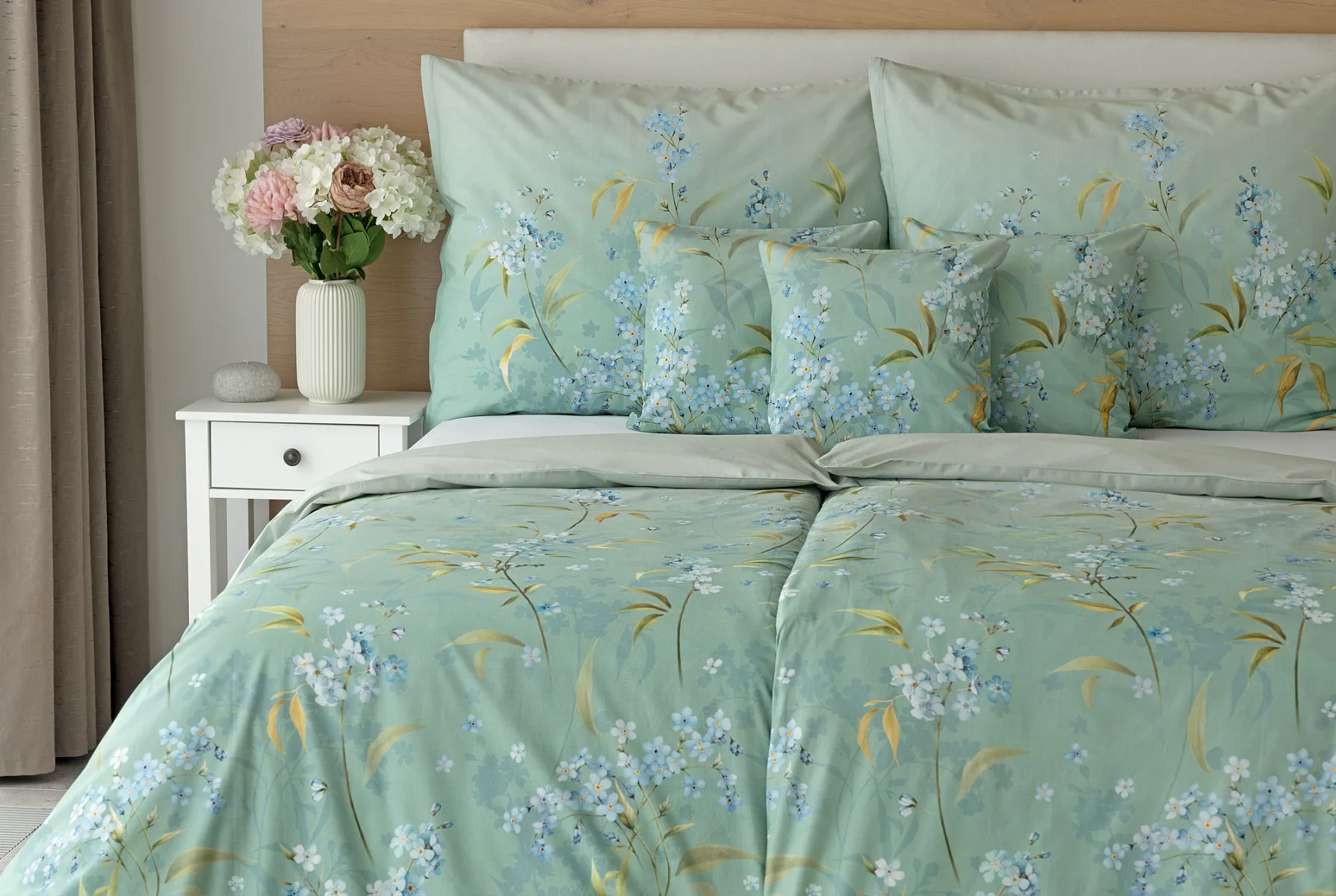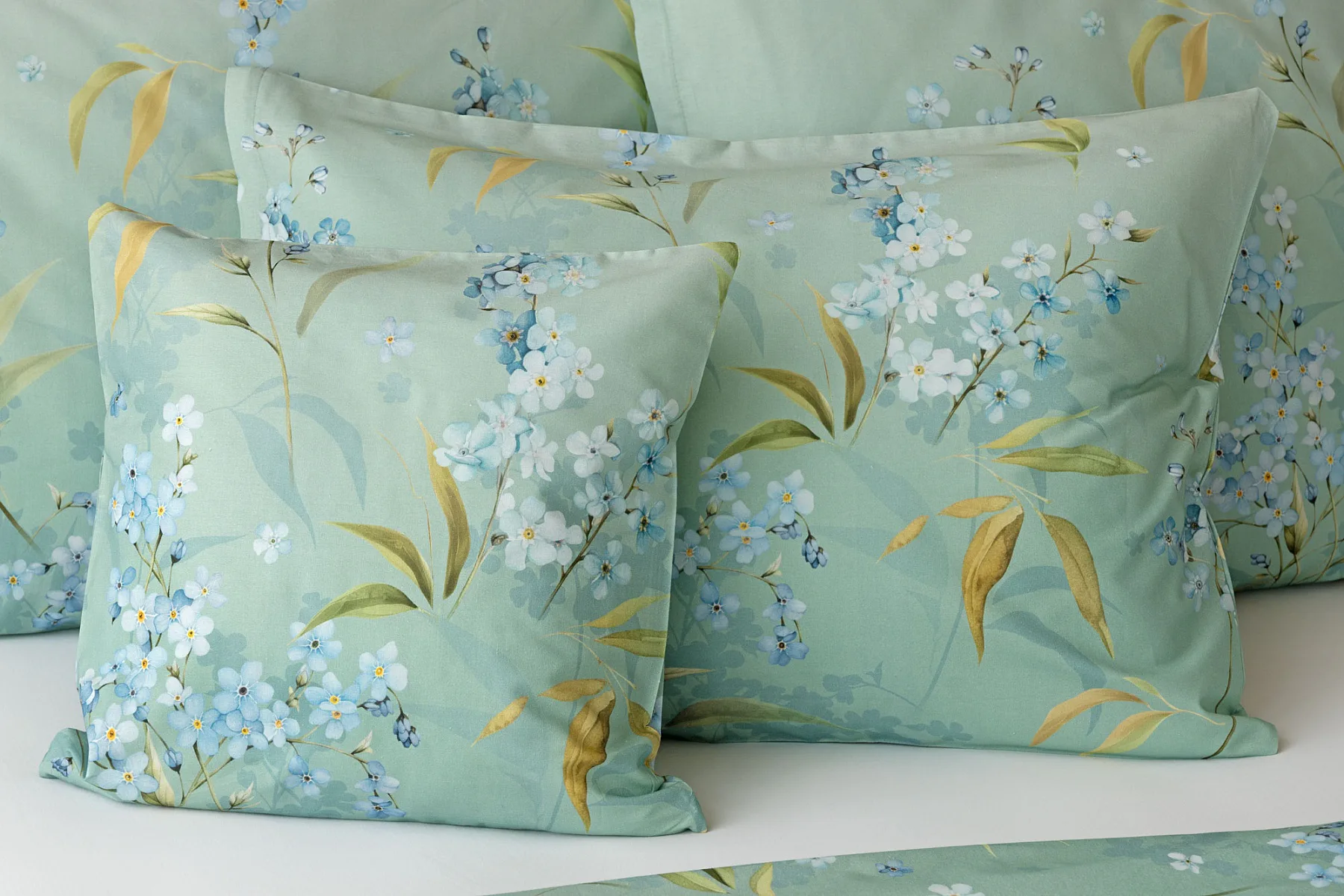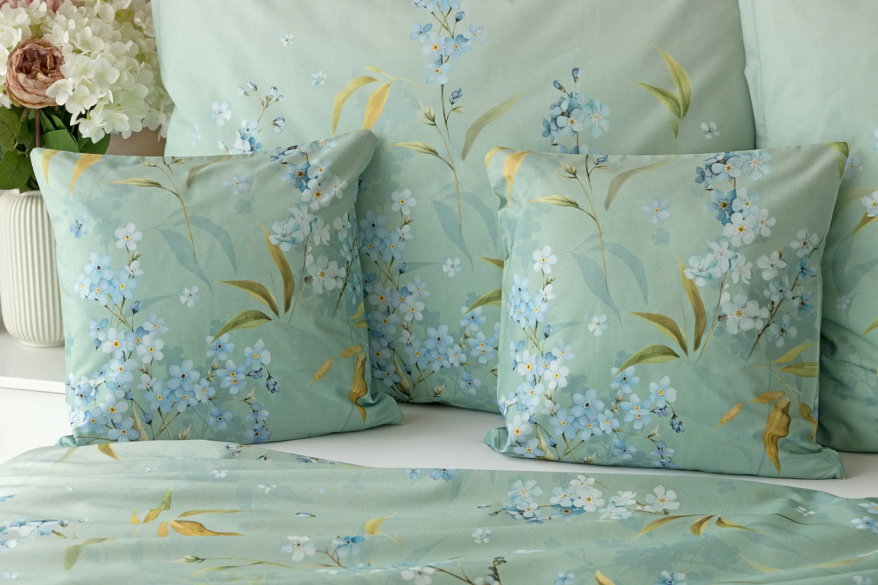 S bavlněným povlečením Libby získá vaše ložnice nádech svěžesti, romantiky a nostalgie. Něžný motiv pomněnek je v dokonalé harmonii se zelenomodrým podkladem, který je navíc ozvláštněn ombré efektem. Tento něžný květinový skvost si zamilujete.