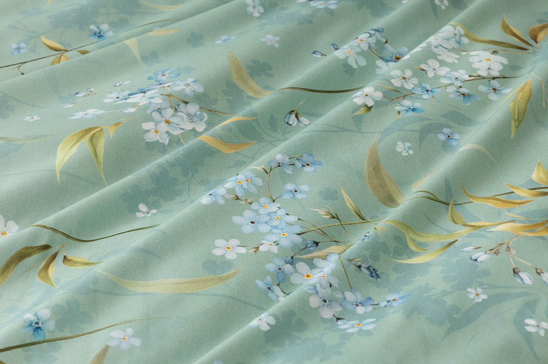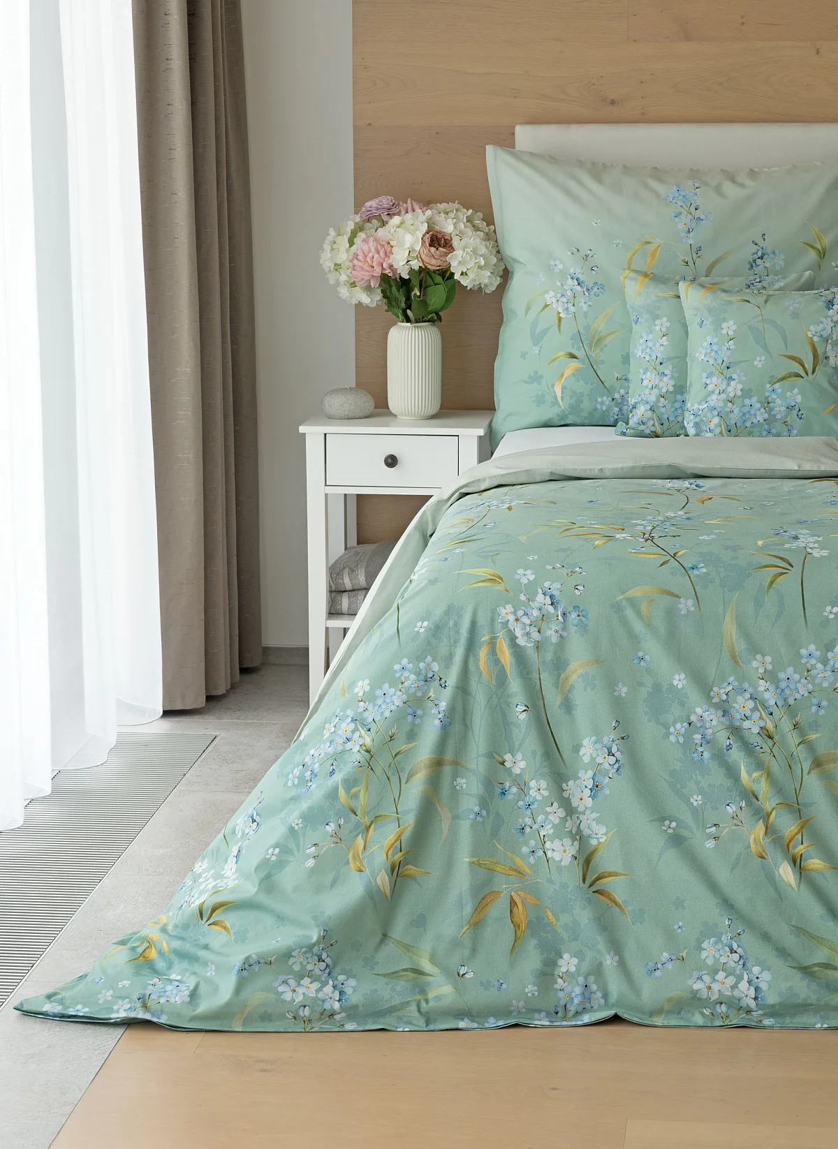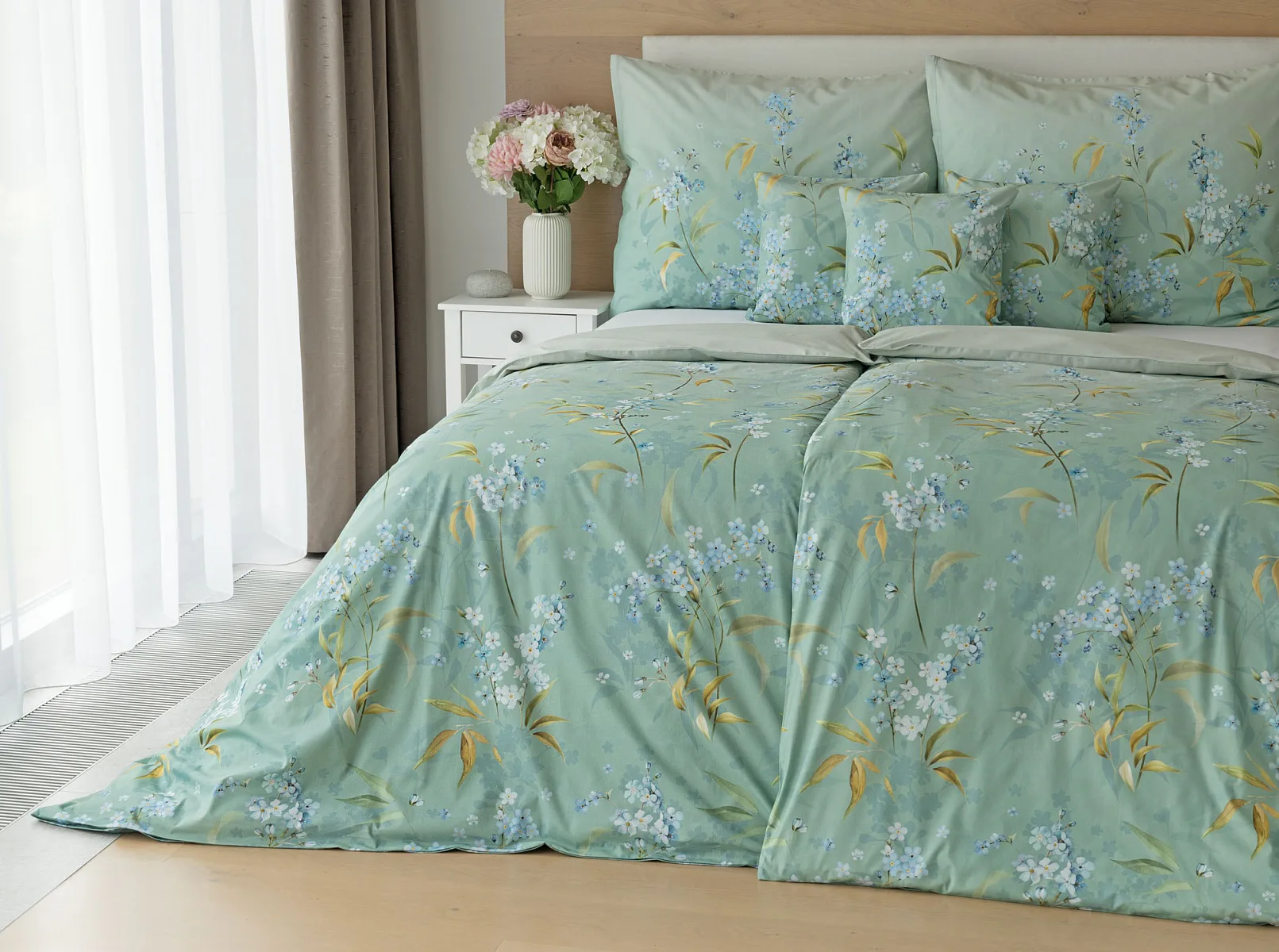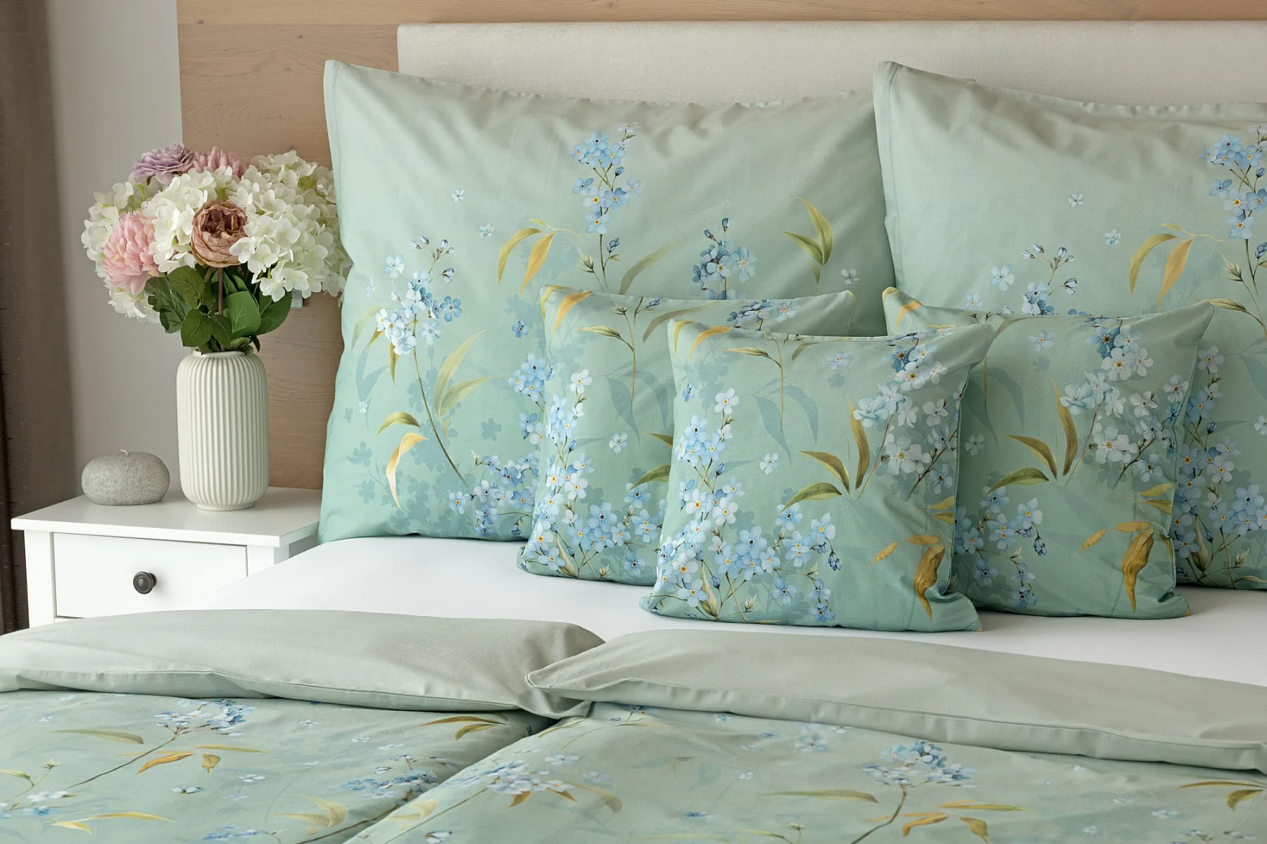 S bavlněným povlečením Libby získá vaše ložnice nádech svěžesti, romantiky a nostalgie. Něžný motiv pomněnek je v dokonalé harmonii se zelenomodrým podkladem, který je navíc ozvláštněn ombré efektem. Tento něžný květinový skvost si zamilujete.