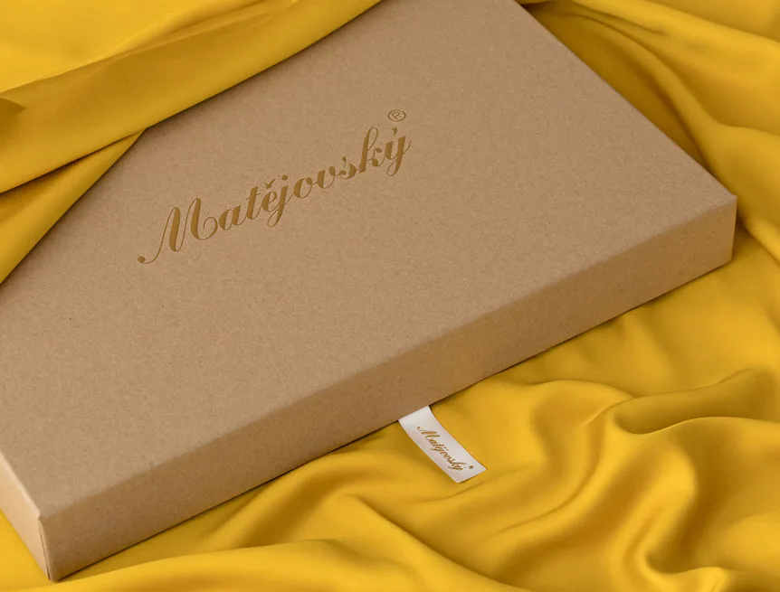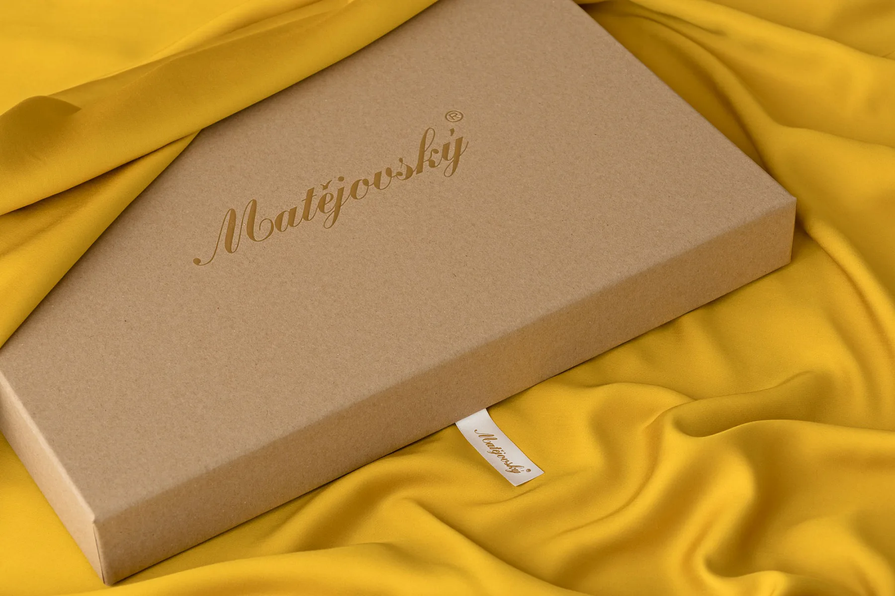 Povlečení je dodáváno v luxusní dárkové krabici (v případě dvou stejných setů baleno v jedné krabici jako sada povlečení na manželské lůžko). Obal z přírodních surovin podtrhuje jedinečnost tohoto 100% přírodního produktu.