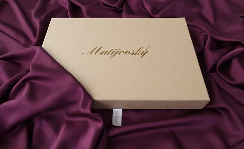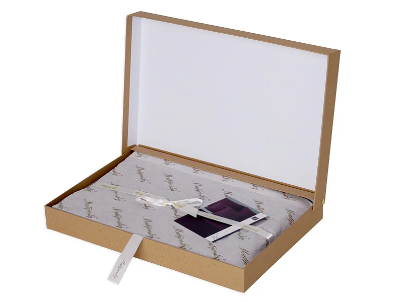 Povlečení je dodáváno v luxusní dárkové krabici (v případě dvou stejných setů baleno v jedné krabici jako sada povlečení na manželské lůžko). Obal z přírodních surovin podtrhuje jedinečnost tohoto 100% přírodního produktu.