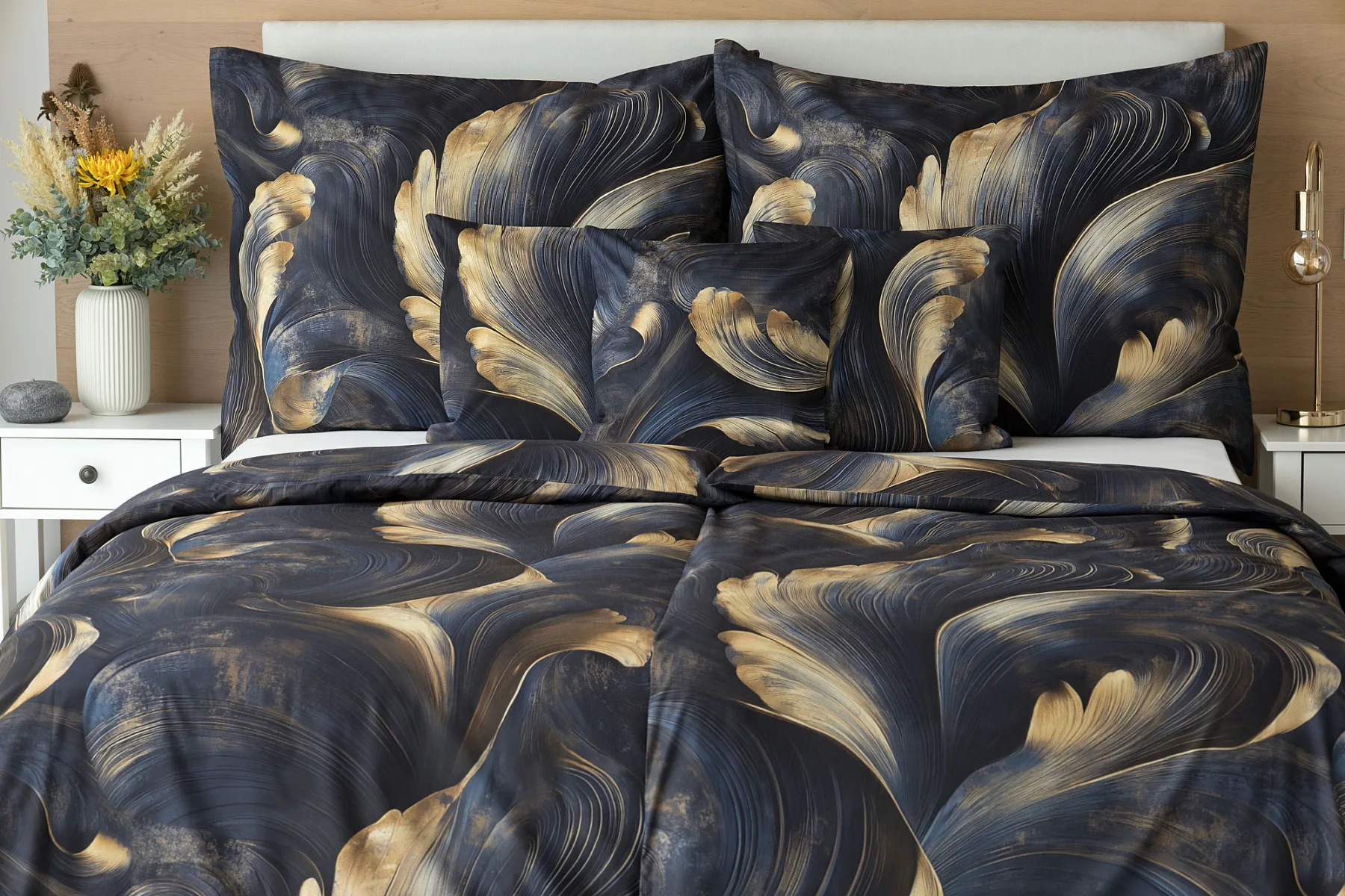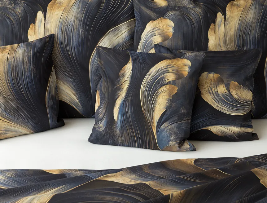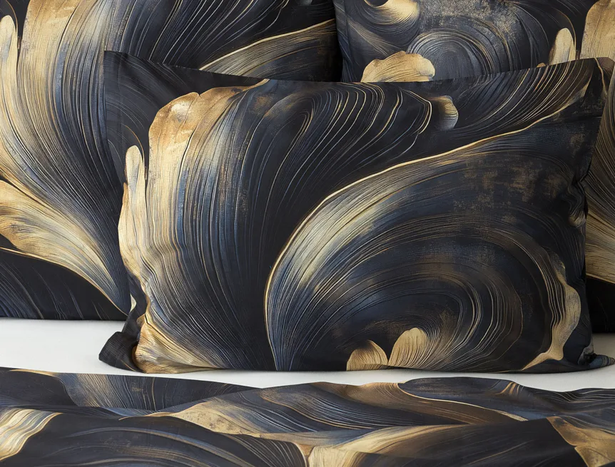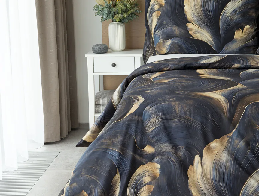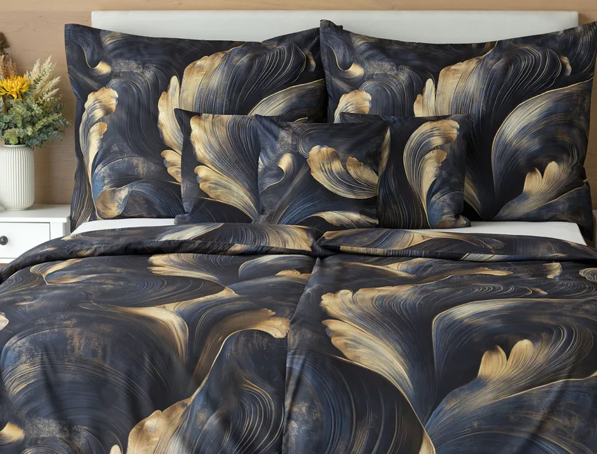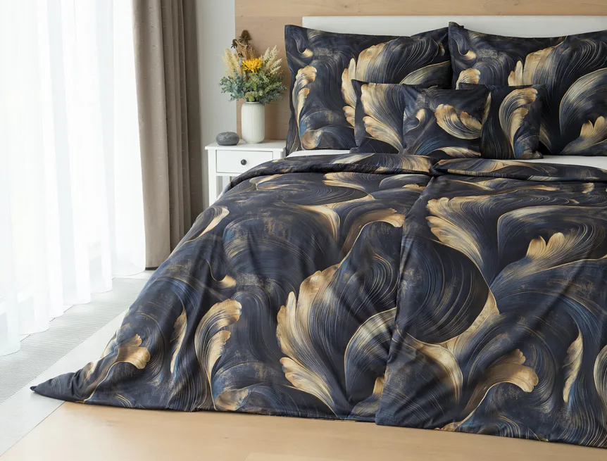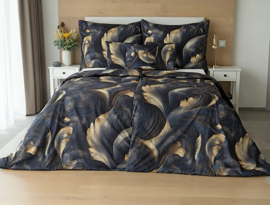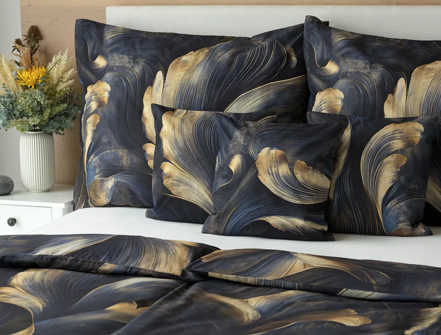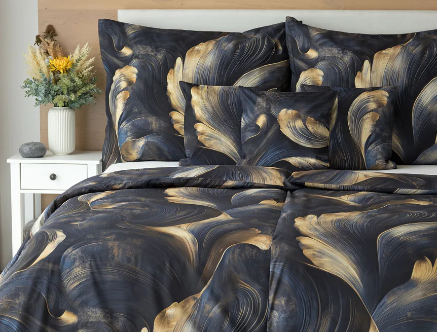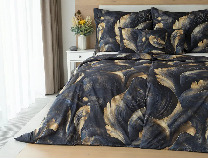 Elegantní bavlněné povlečení Lyra povznese každodenní stlaní na radost a potěšení z krásného bydlení. Abstraktní vzor vyniká v jedinečném spojení temně modrých tónů s pískově zlatými konturami, které připomínají tvar lyry. Díky nejmodernějšímu digitálnímu tisku vyniká vzor v precizním detailu.