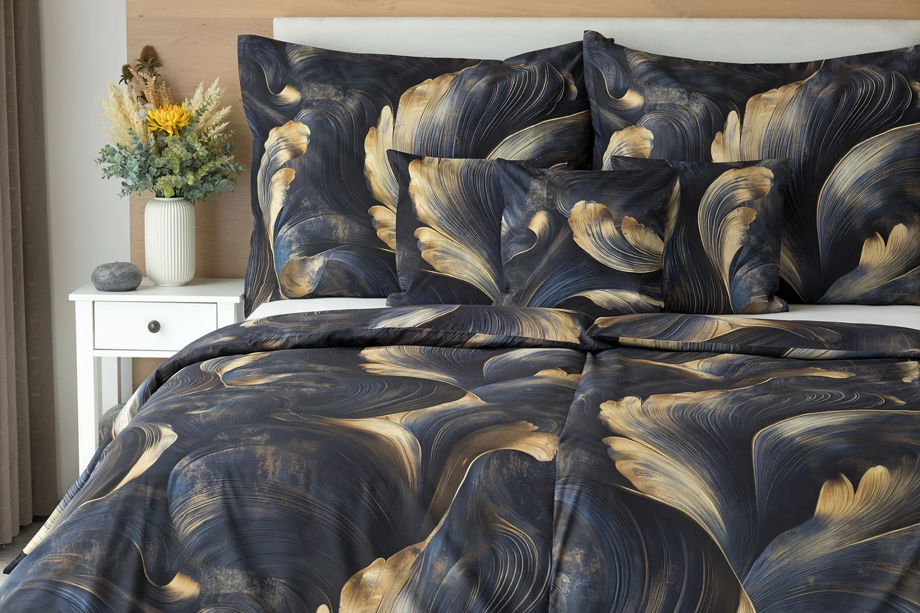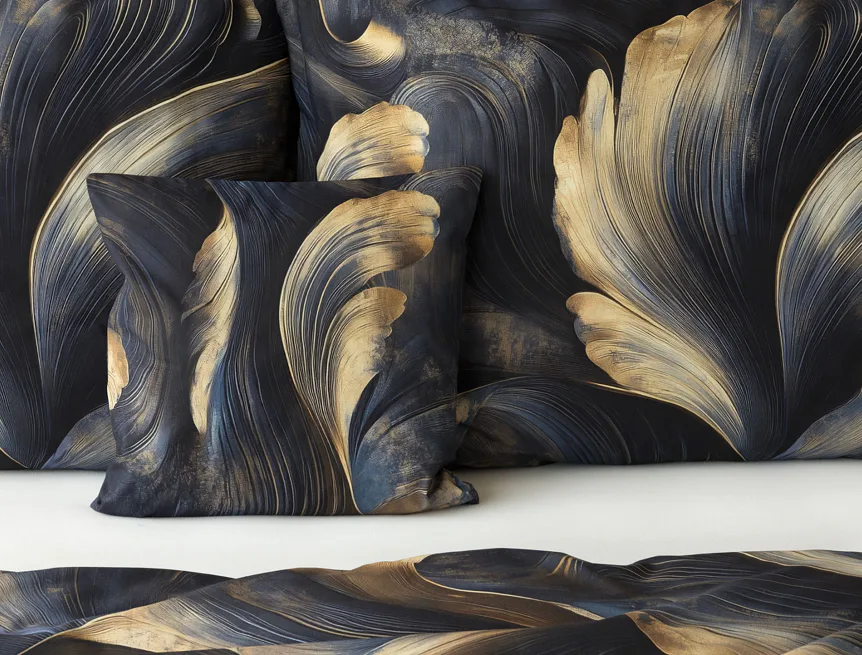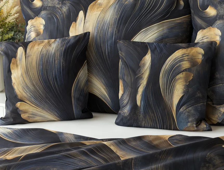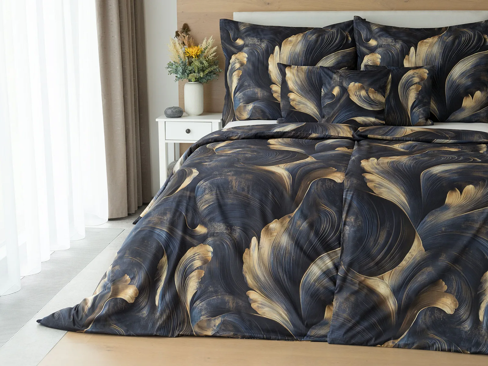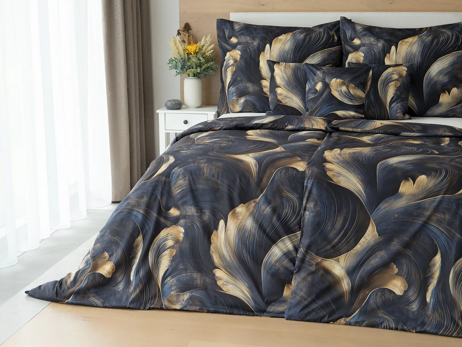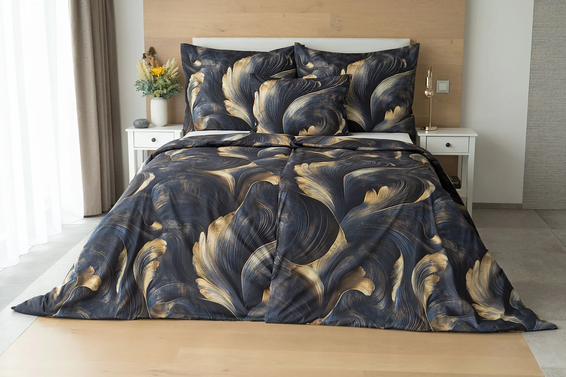 Elegantní bavlněné povlečení Lyra povznese každodenní stlaní na radost a potěšení z krásného bydlení. Abstraktní vzor vyniká v jedinečném spojení temně modrých tónů s pískově zlatými konturami, které připomínají tvar lyry. Díky nejmodernějšímu digitálnímu tisku vyniká vzor v precizním detailu.