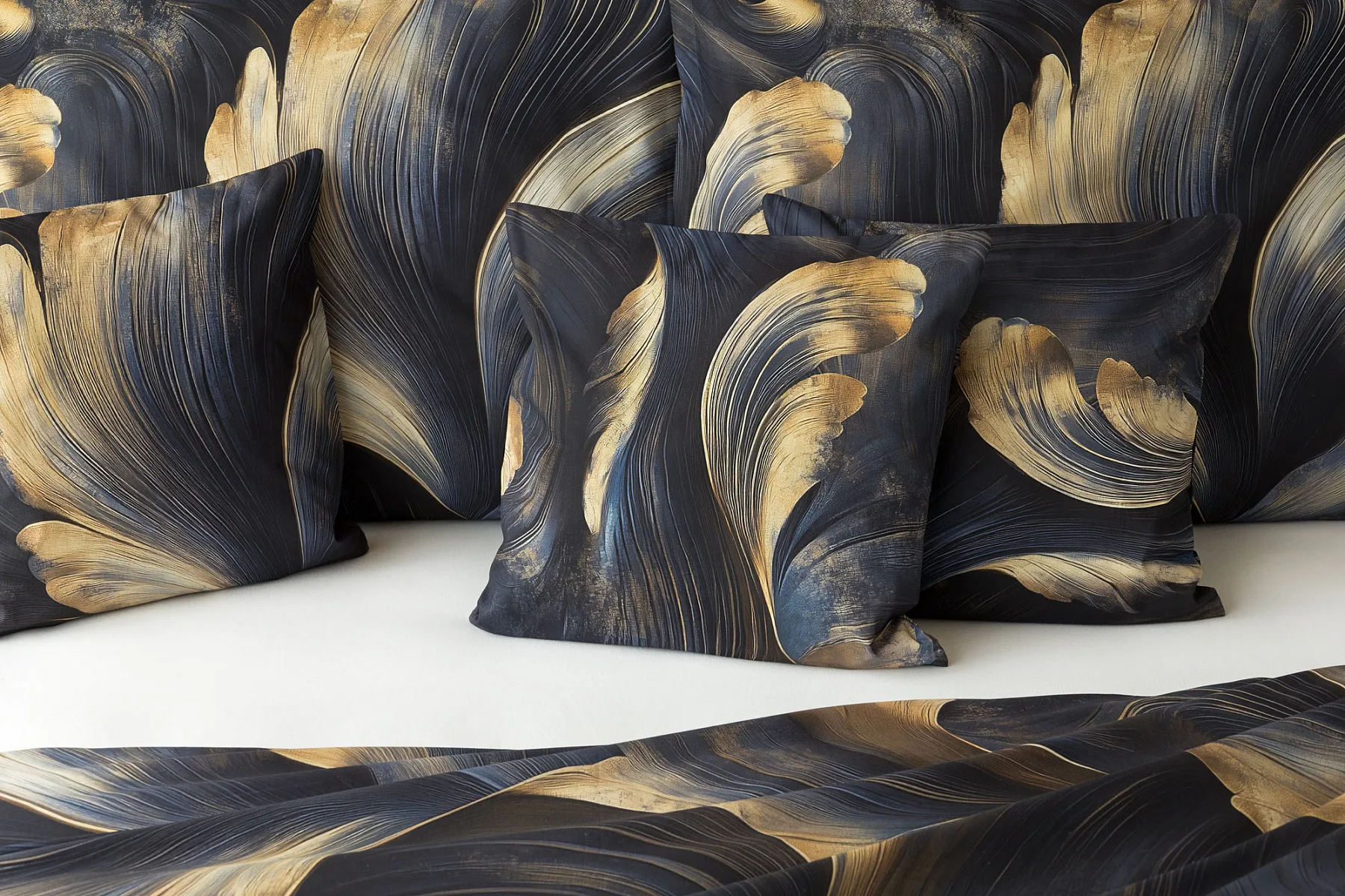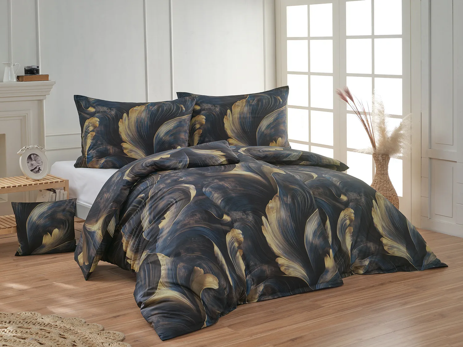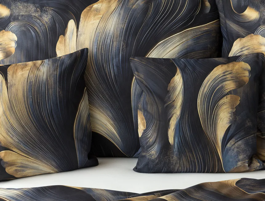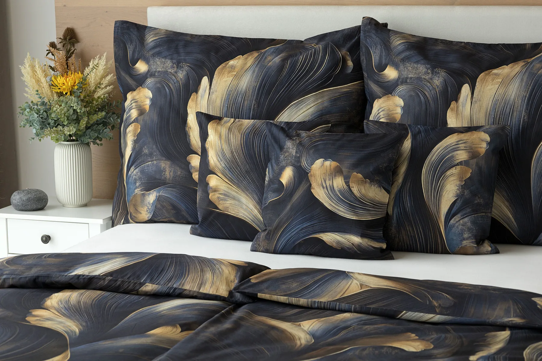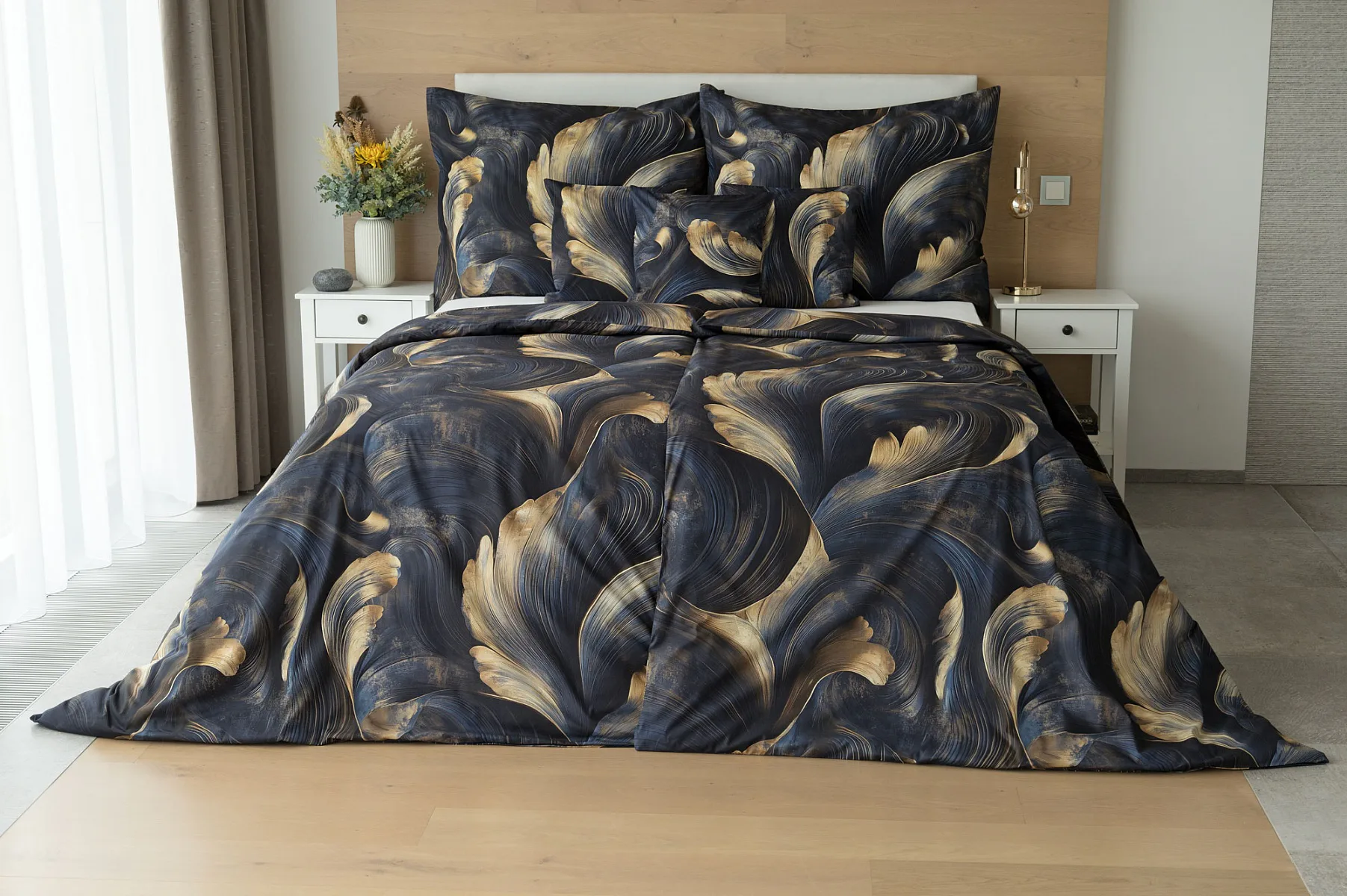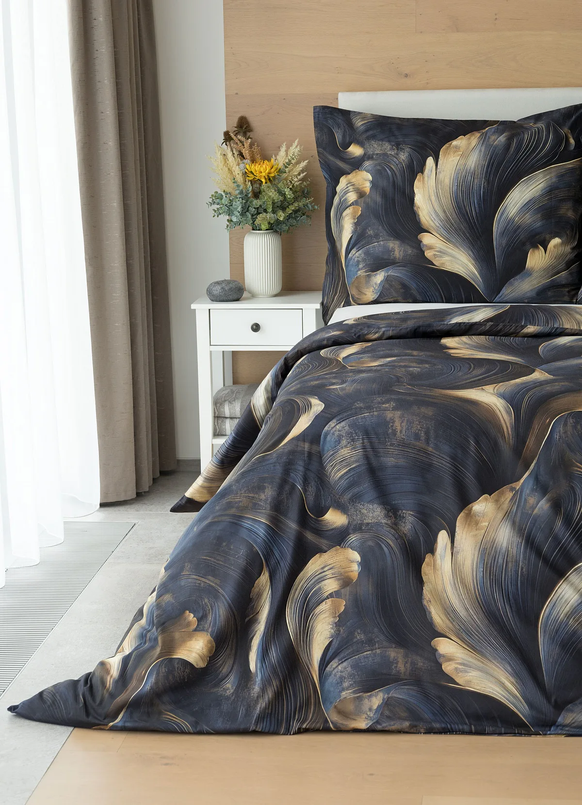 Elegantní bavlněné povlečení Lyra povznese každodenní stlaní na radost a potěšení z krásného bydlení. Abstraktní vzor vyniká v jedinečném spojení temně modrých tónů s pískově zlatými konturami, které připomínají tvar lyry. Díky nejmodernějšímu digitálnímu tisku vyniká vzor v precizním detailu.