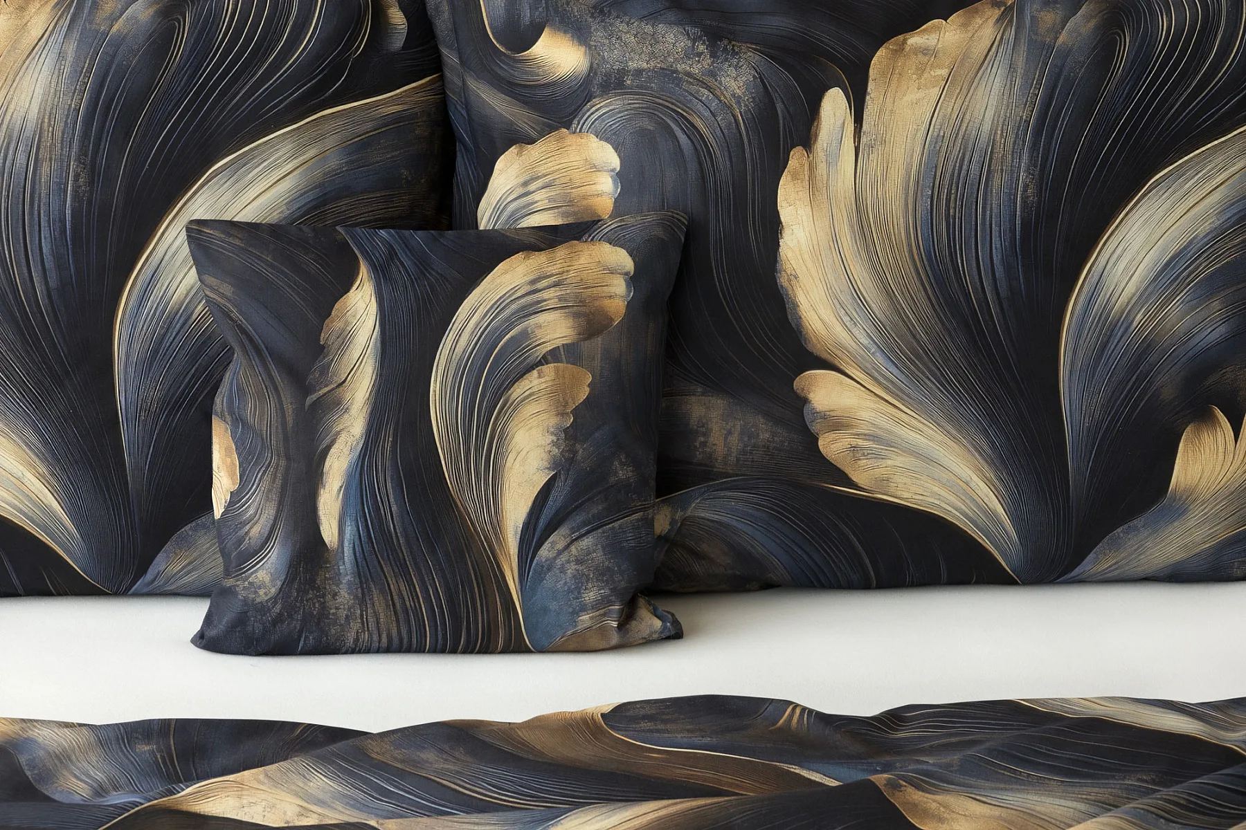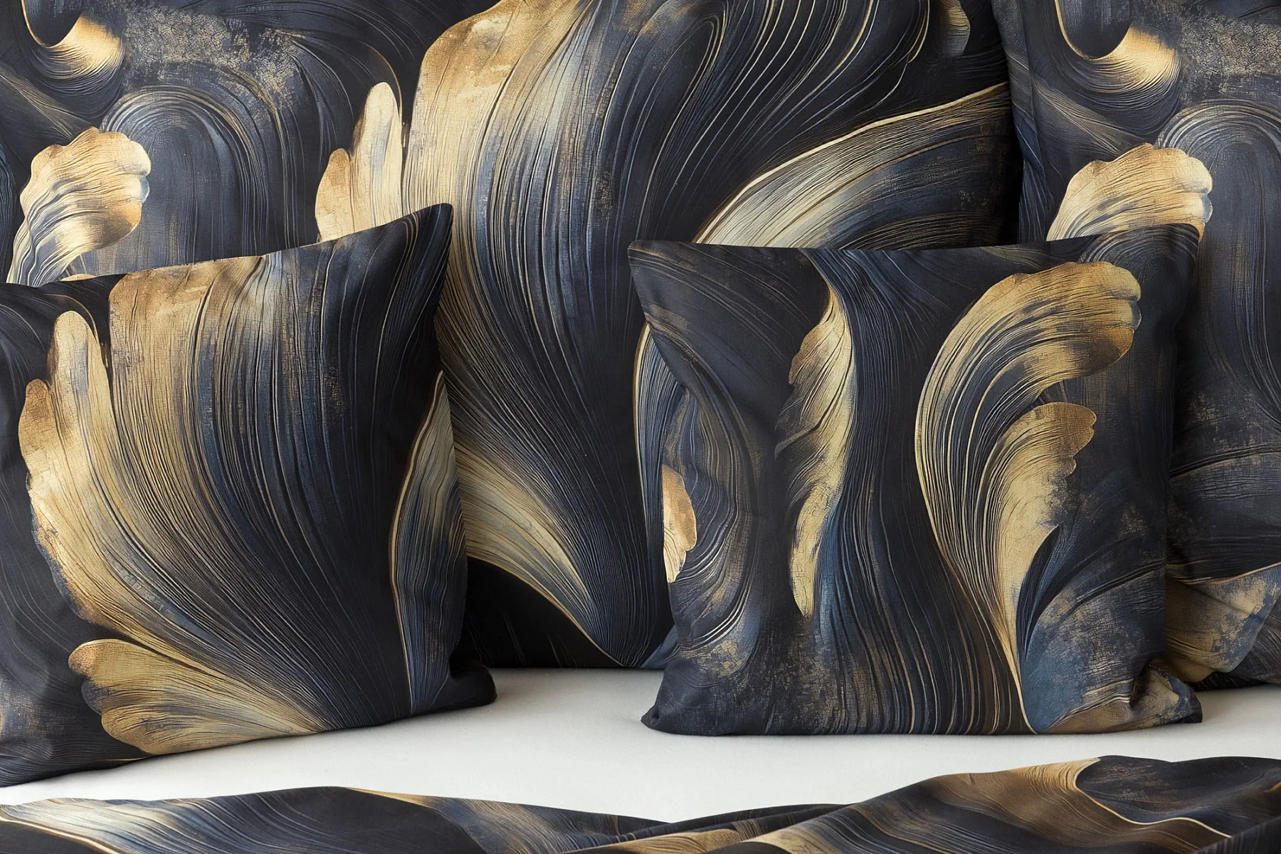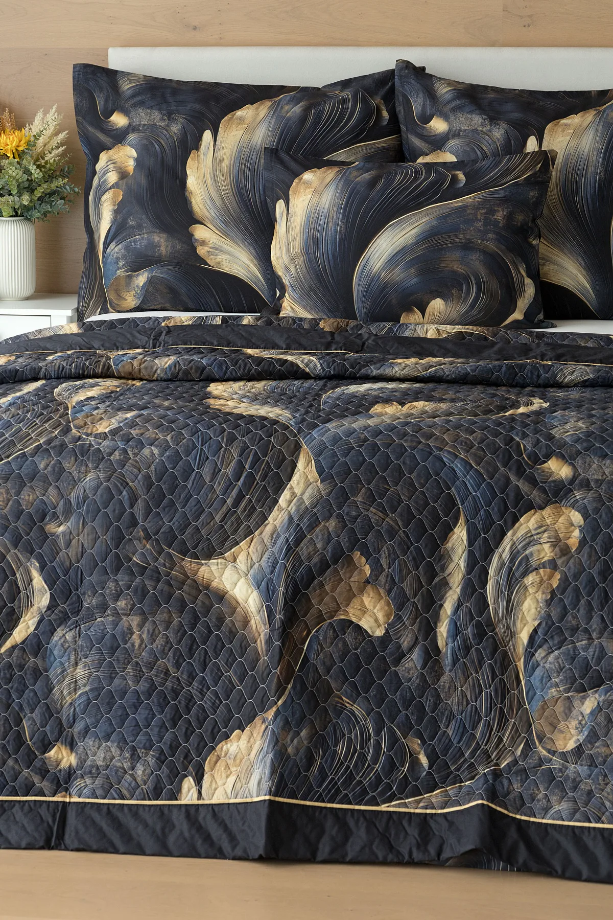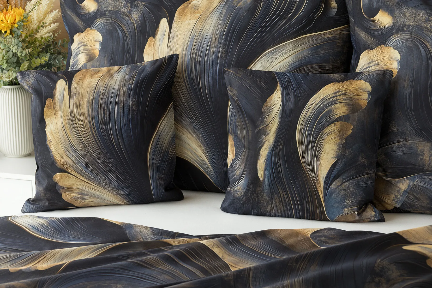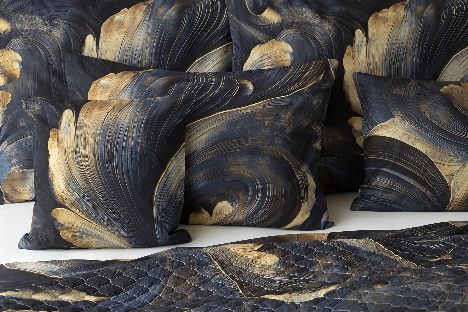 Elegantní bavlněné povlečení Lyra povznese každodenní stlaní na radost a potěšení z krásného bydlení. Abstraktní vzor vyniká v jedinečném spojení temně modrých tónů s pískově zlatými konturami, které připomínají tvar lyry. Díky nejmodernějšímu digitálnímu tisku vyniká vzor v precizním detailu.