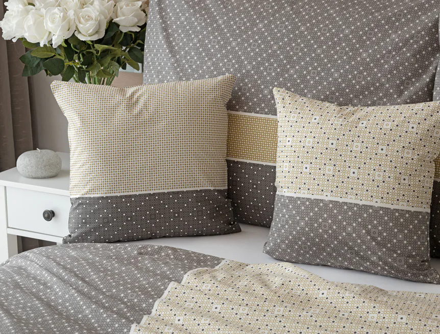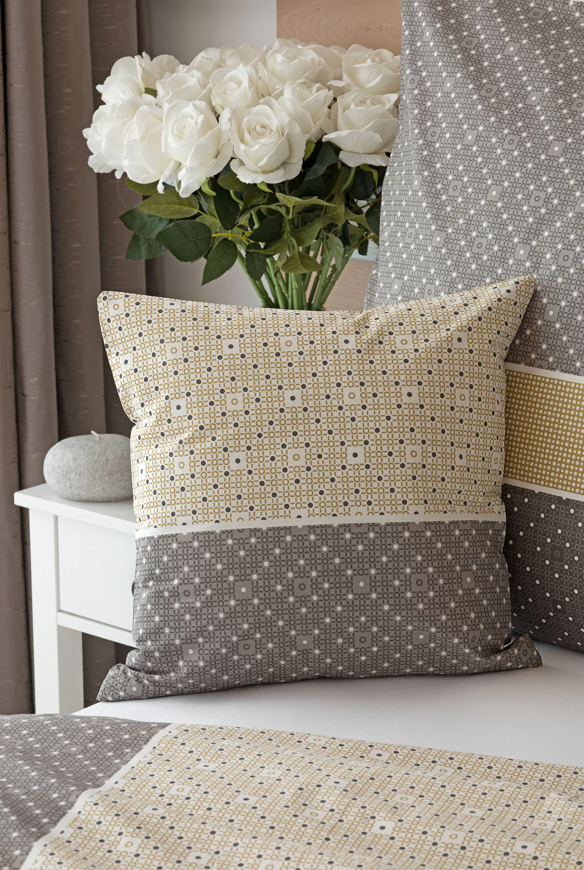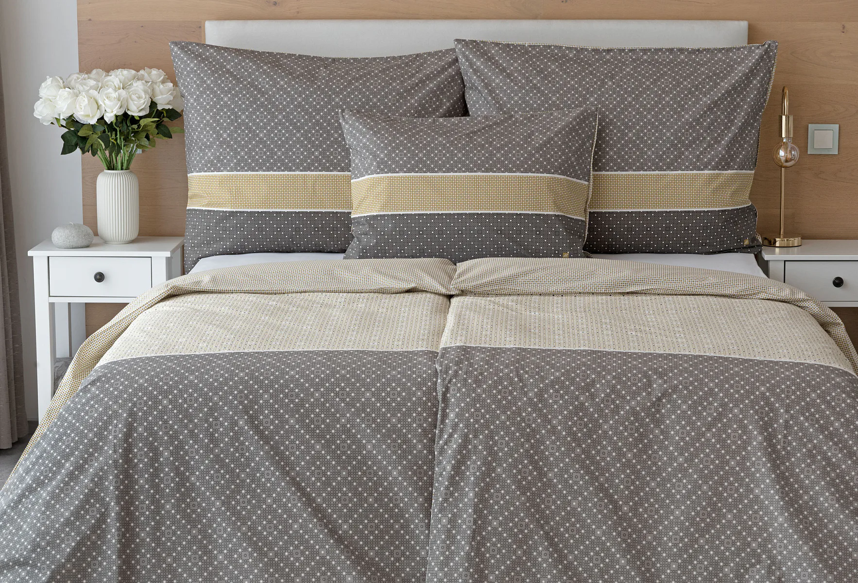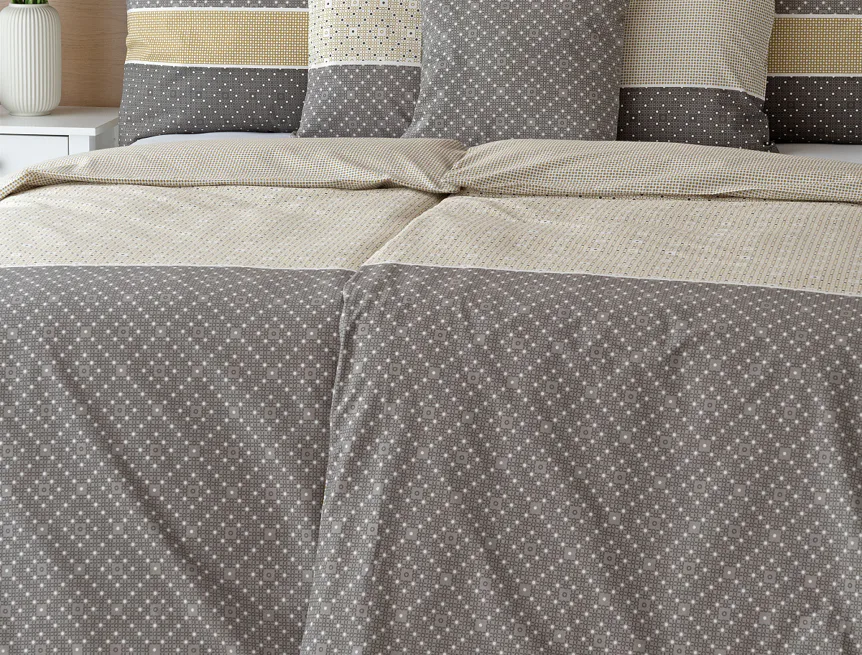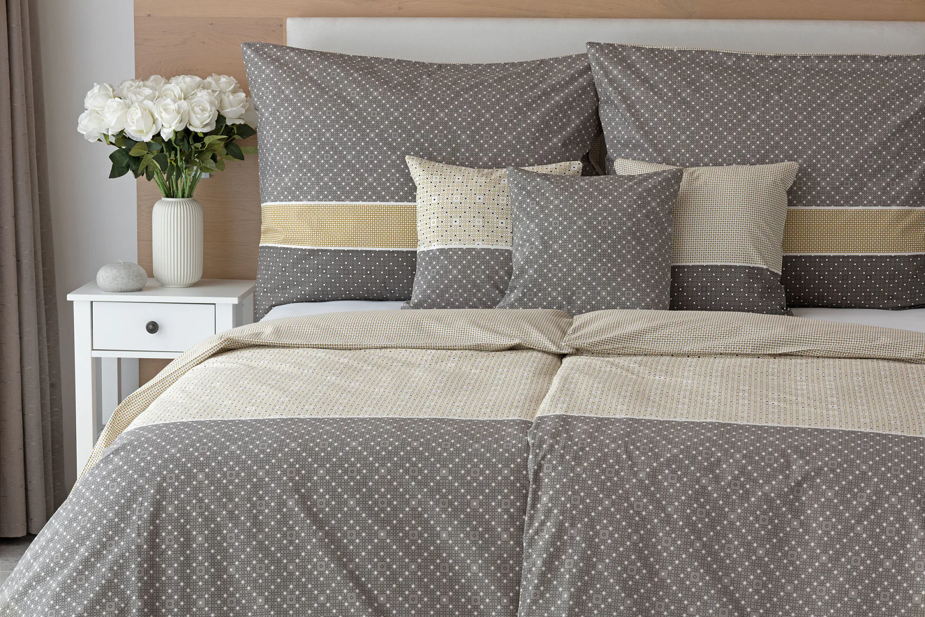 Rozmanitý geometrický vzor na bavlněném povlečení Maddox kombinuje oblíbené hřejivé tóny, od přírodní béžové až po antracitově šedou. Ve vzoru se snoubí decentní prvky nápaditě propojené v elegantní celek, který vám umožní při stlaní hravě experimentovat. Vrchní strana povlečení odpovídá vyobrazení na fotografii, spodní stranu povlečení zdobí zjednodušený motiv tvořený drobnými puntíky v šedé a okrové barvě na přírodním béžovém podkladu.