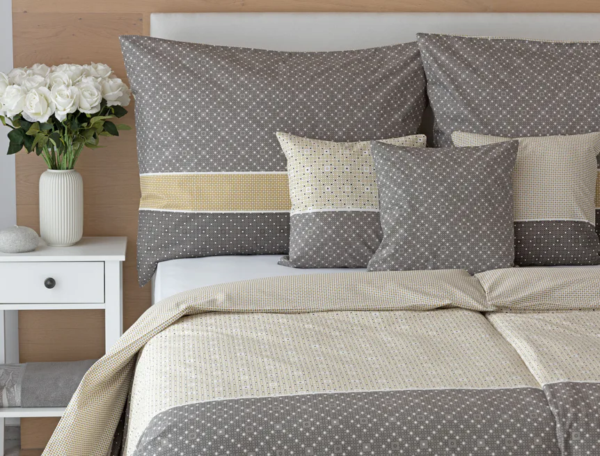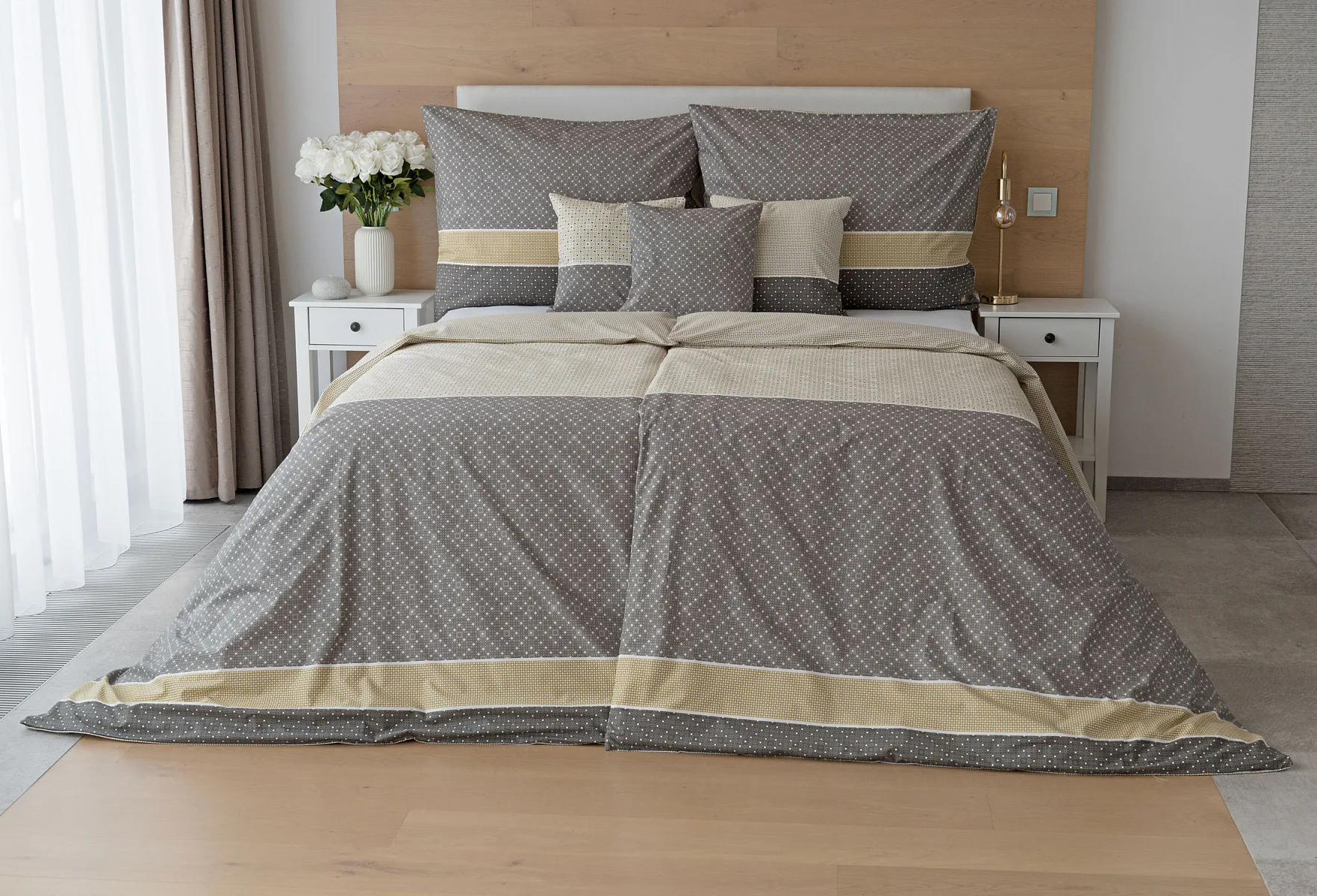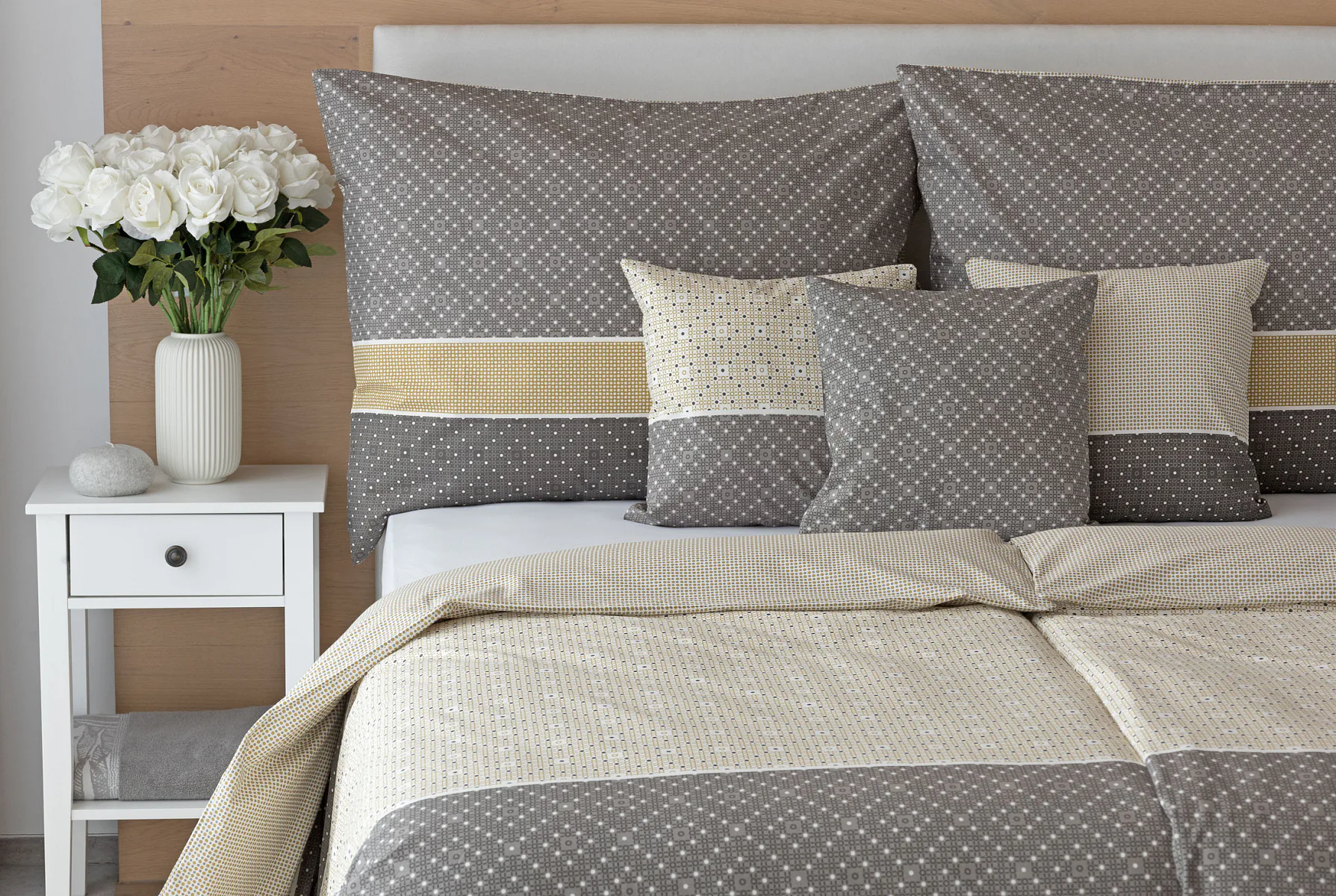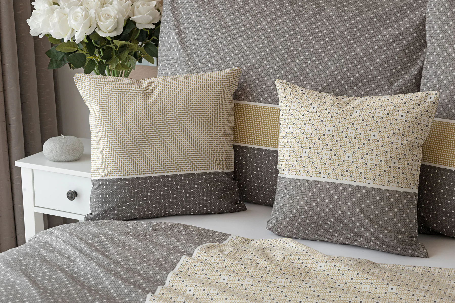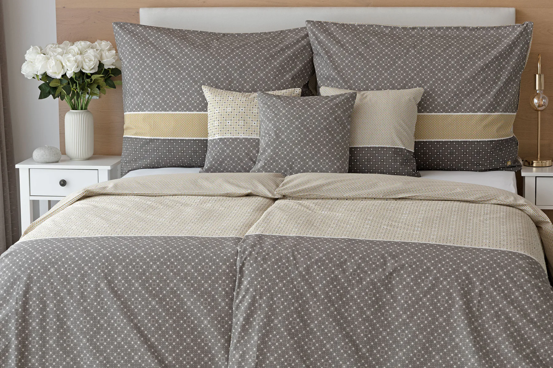 Rozmanitý geometrický vzor na bavlněném povlečení Maddox kombinuje oblíbené hřejivé tóny, od přírodní béžové až po antracitově šedou. Ve vzoru se snoubí decentní prvky nápaditě propojené v elegantní celek, který vám umožní při stlaní hravě experimentovat. Vrchní strana povlečení odpovídá vyobrazení na fotografii, spodní stranu povlečení zdobí zjednodušený motiv tvořený drobnými puntíky v šedé a okrové barvě na přírodním béžovém podkladu.