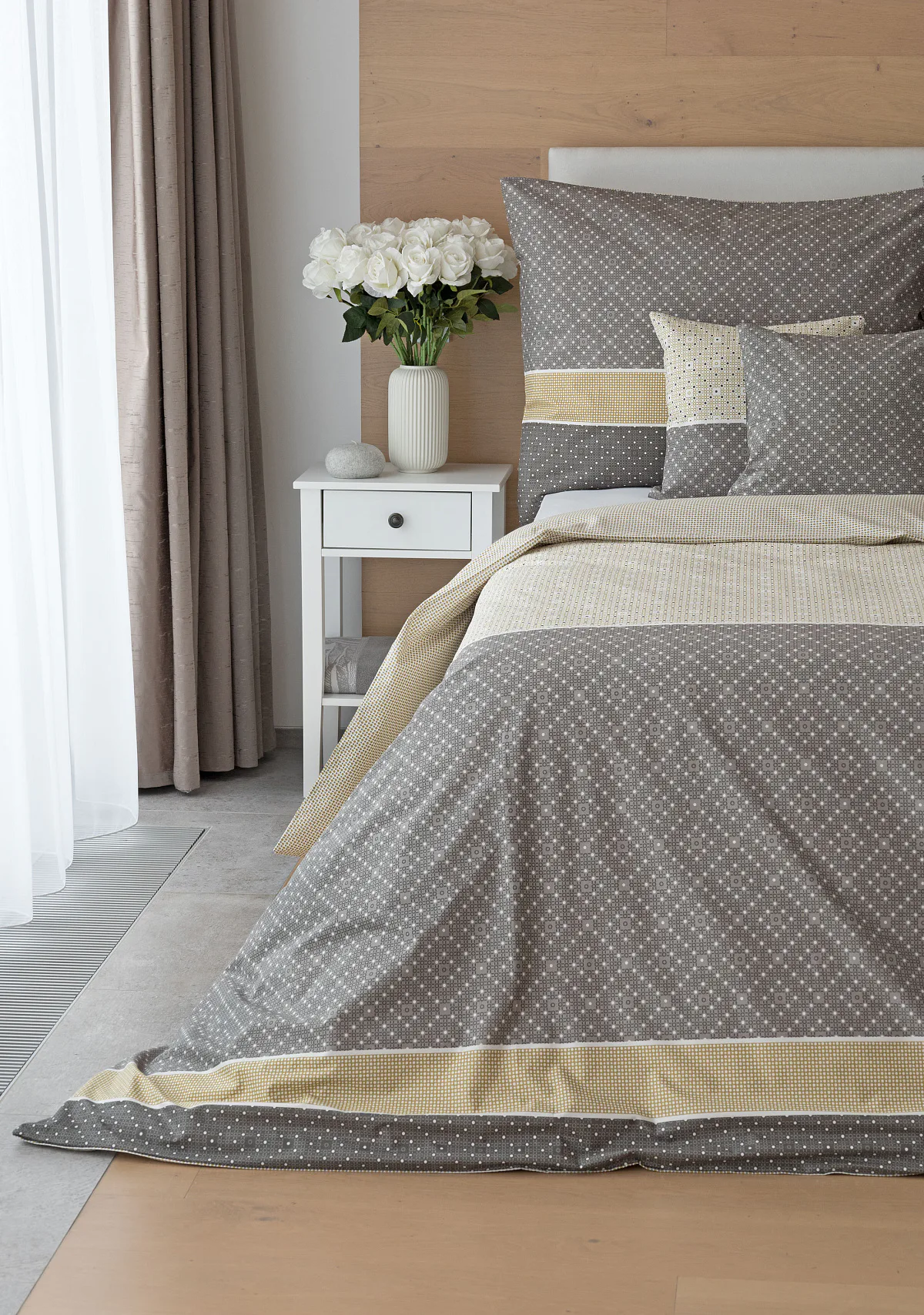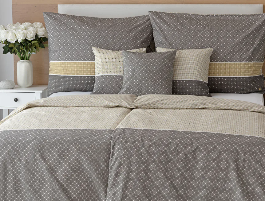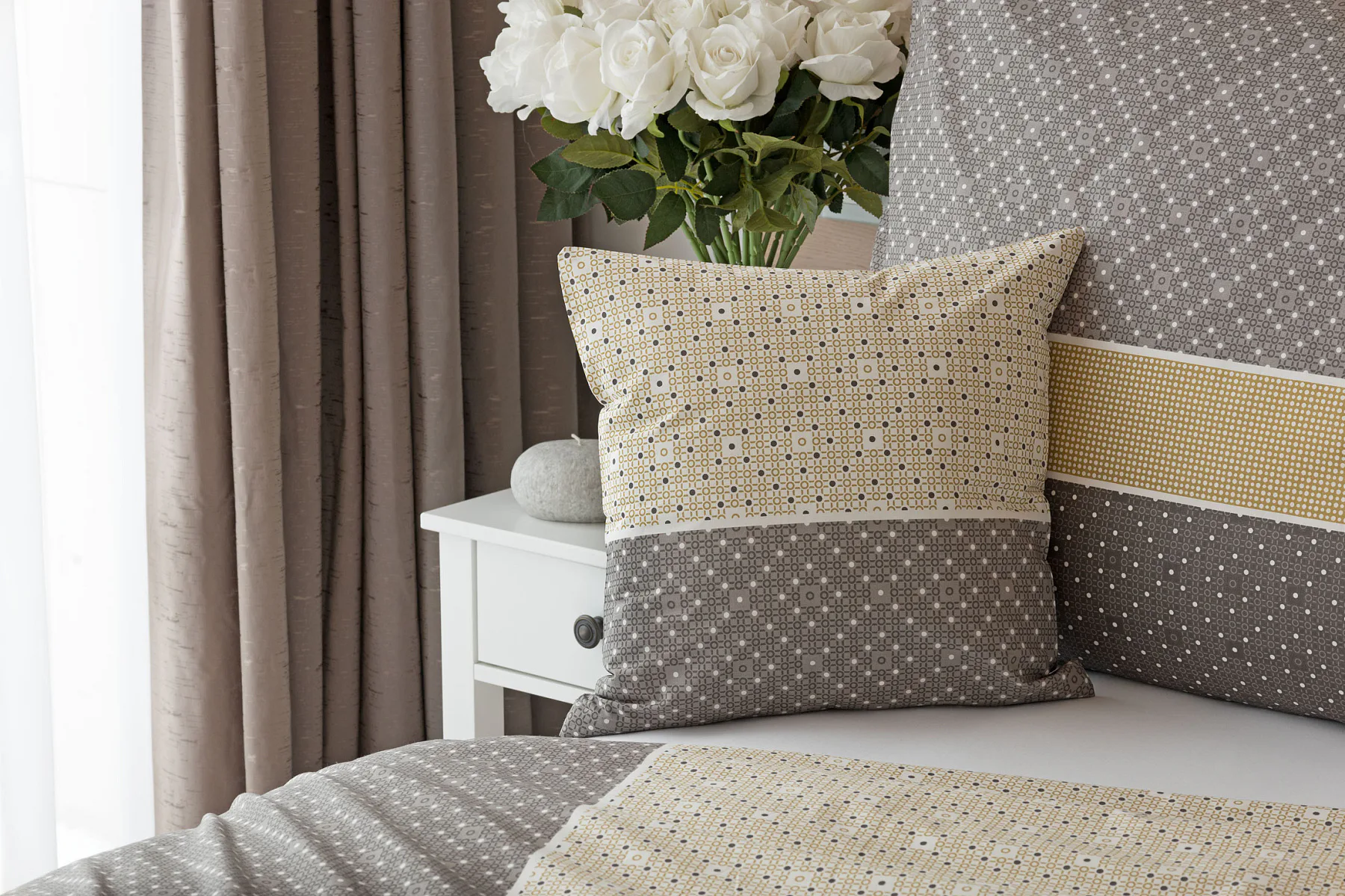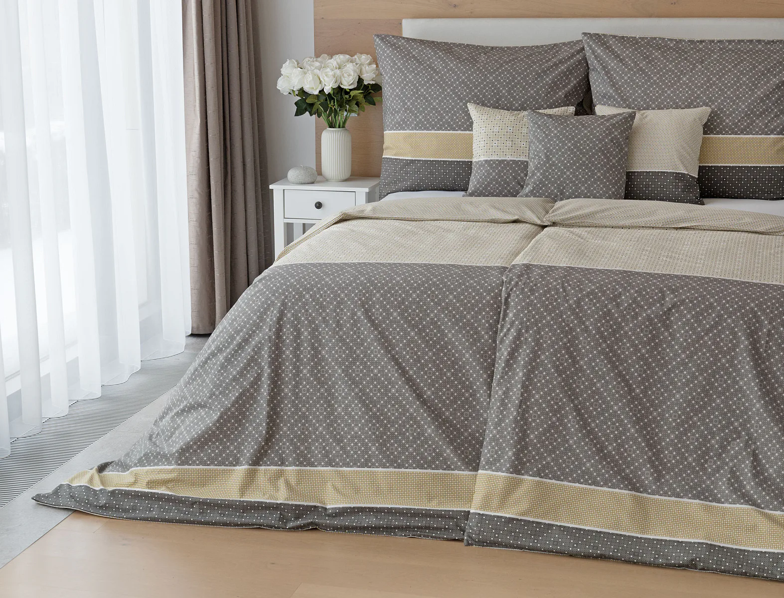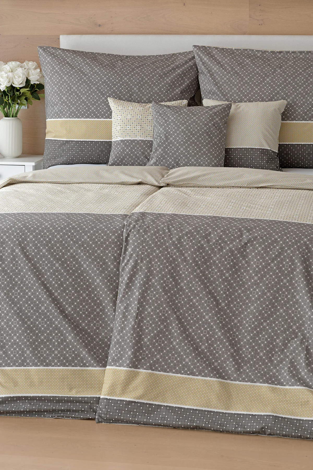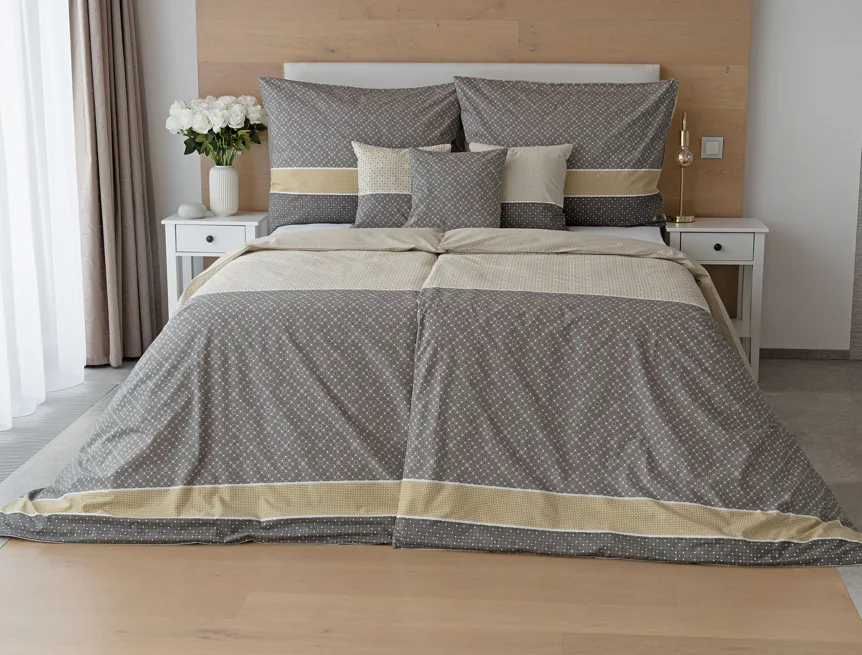 Rozmanitý geometrický vzor na bavlněném povlečení Maddox kombinuje oblíbené hřejivé tóny, od přírodní béžové až po antracitově šedou. Ve vzoru se snoubí decentní prvky nápaditě propojené v elegantní celek, který vám umožní při stlaní hravě experimentovat. Vrchní strana povlečení odpovídá vyobrazení na fotografii, spodní stranu povlečení zdobí zjednodušený motiv tvořený drobnými puntíky v šedé a okrové barvě na přírodním béžovém podkladu.