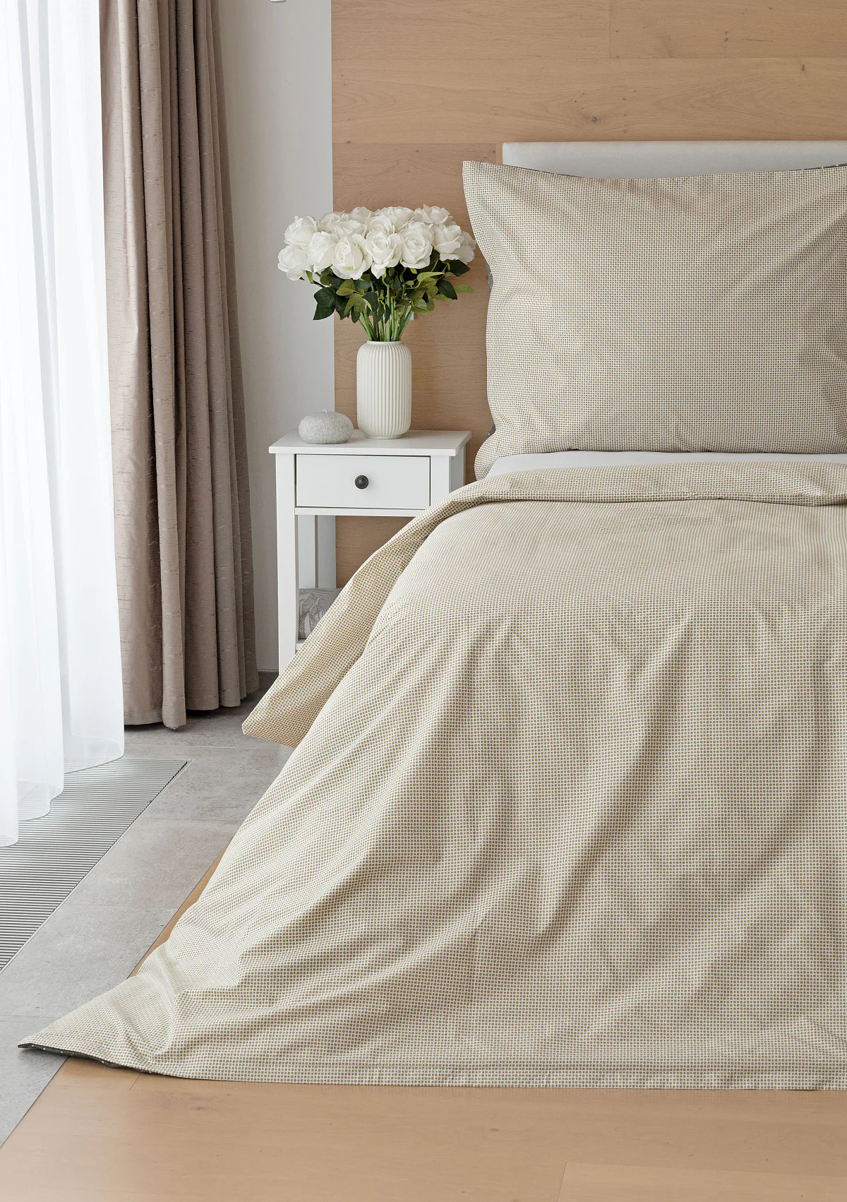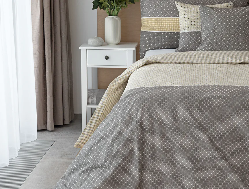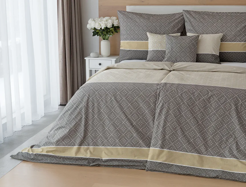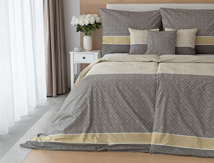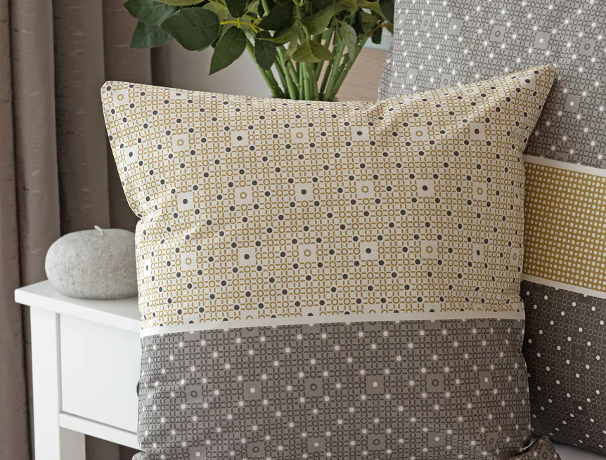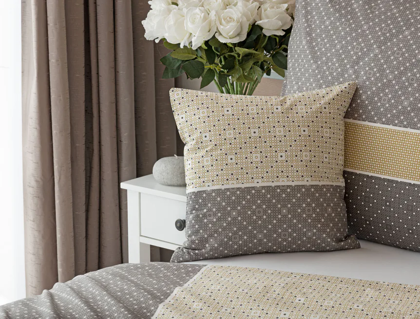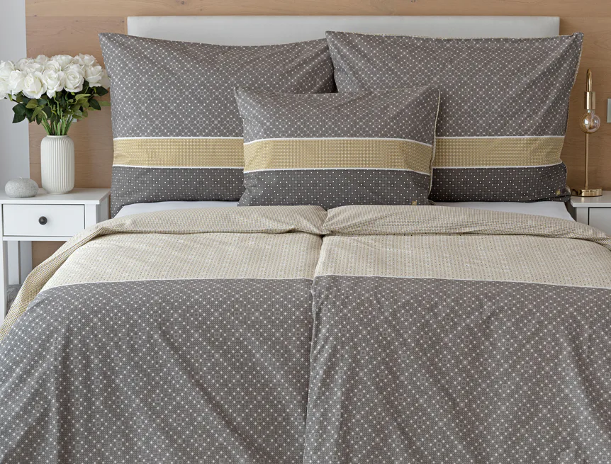 Rozmanitý geometrický vzor na bavlněném povlečení Maddox kombinuje oblíbené hřejivé tóny, od přírodní béžové až po antracitově šedou. Ve vzoru se snoubí decentní prvky nápaditě propojené v elegantní celek, který vám umožní při stlaní hravě experimentovat. Vrchní strana povlečení odpovídá vyobrazení na fotografii, spodní stranu povlečení zdobí zjednodušený motiv tvořený drobnými puntíky v šedé a okrové barvě na přírodním béžovém podkladu.